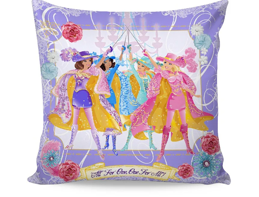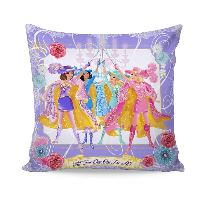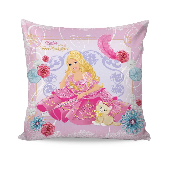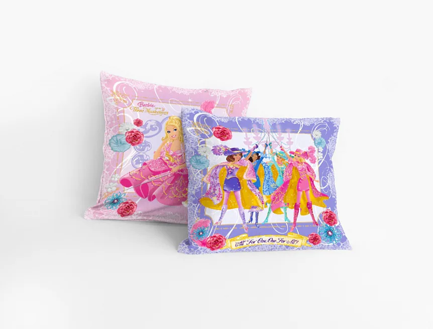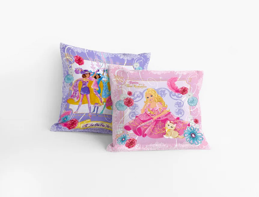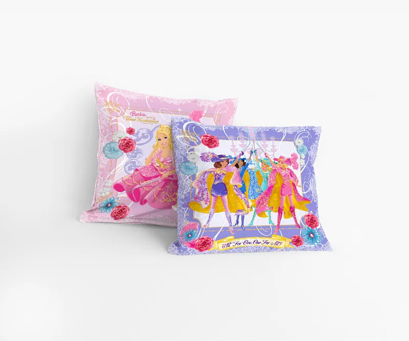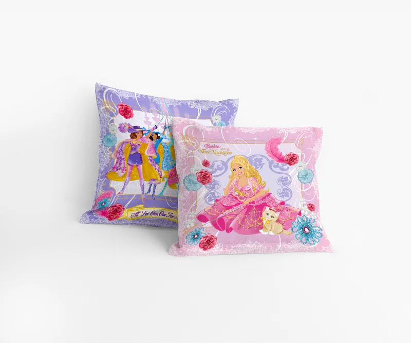 Romantické fialkové a růžové polštářky s motivem panenky Barbie do pokojíčku malé princezny. Na ilustrační fotografii je znázorněna vrchní a spodní strana povlaku.