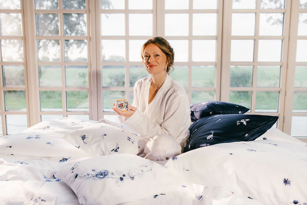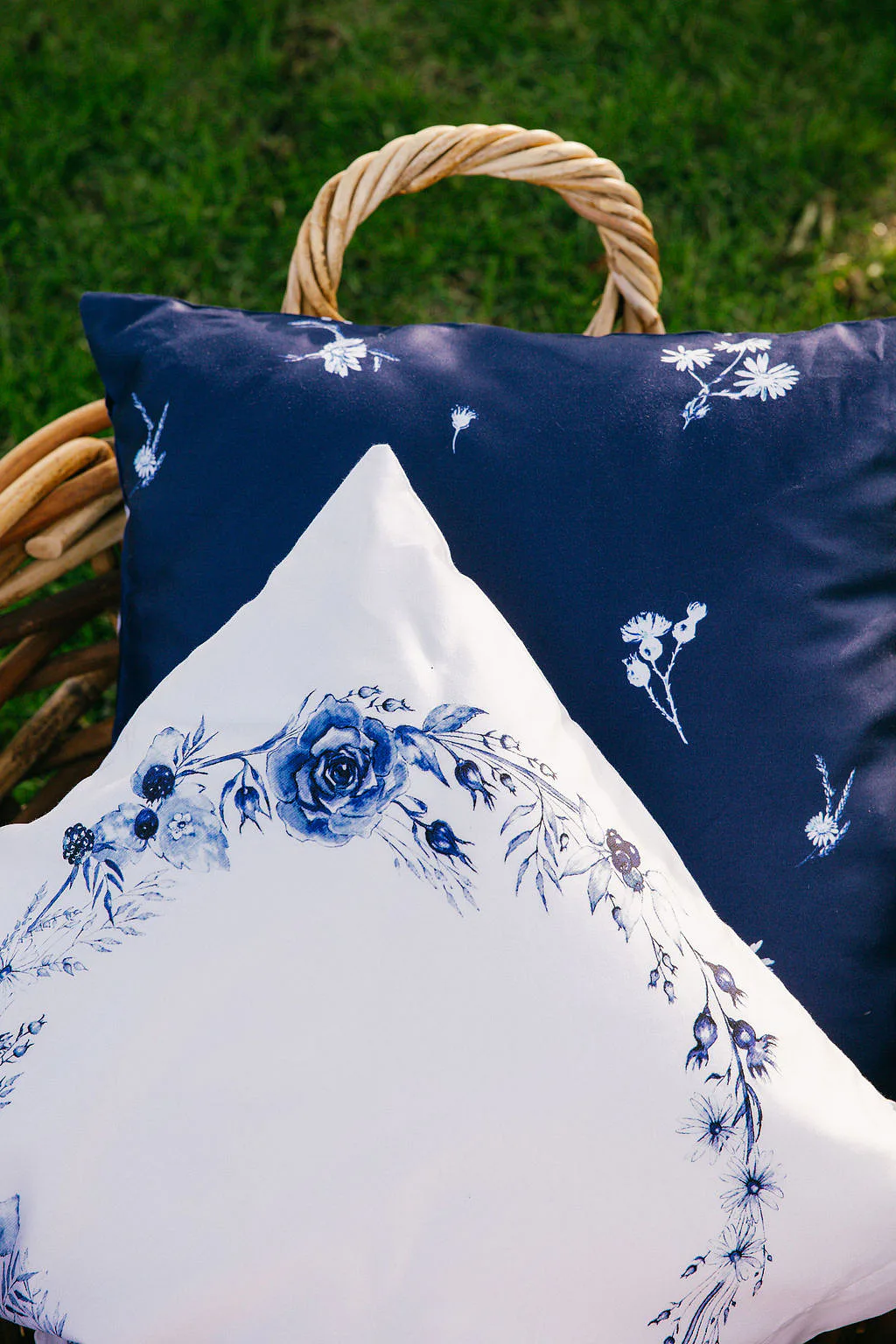 Nadčasová modrobílá v autorském věnci na 100% bavlněném saténu. Oboustranný motiv, zipový uzávěr. Elegance, která sluší chalupě i městskému bytu.