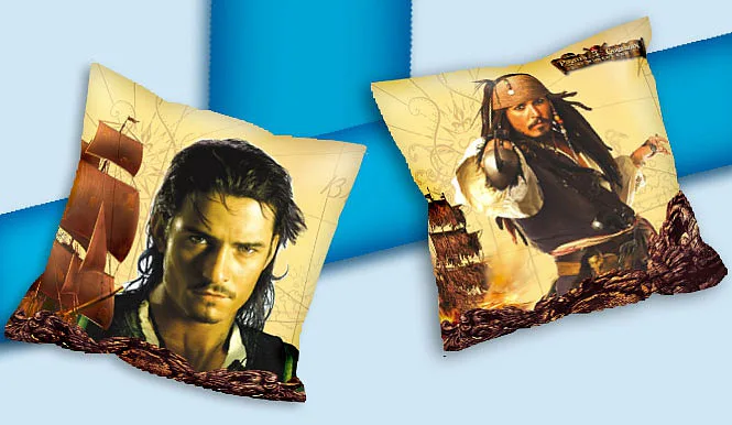 Polštářek s fotkami hlavních hrdinů z filmu Piráti z karibiku. Bude skvělým dárkem pro fanoušky Orlando Blooma a Johny Deppa.