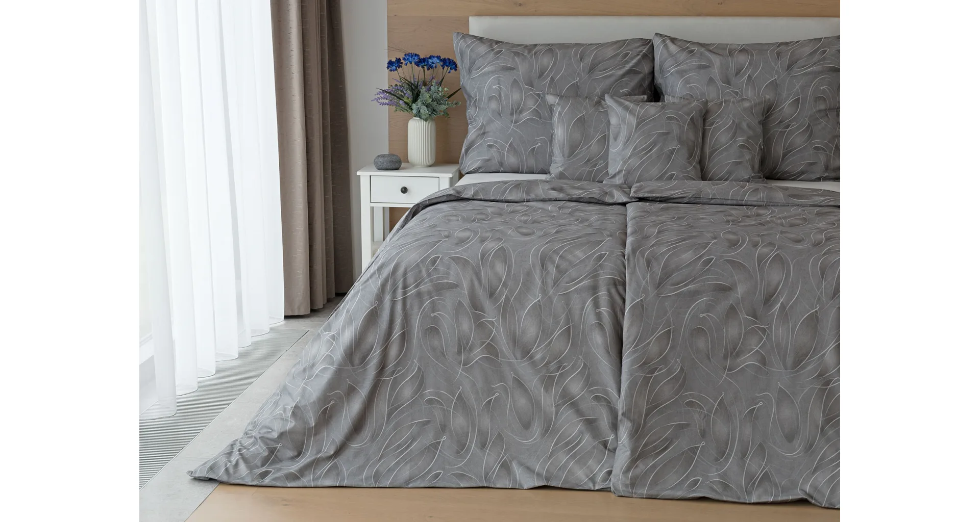S bavlněným povlečením Adeline bude vaše ložnice elegantní a vždy dokonalá. Světlé kontury decentního lístkového vzoru vynikají na antracitově šedém podkladu. Celý vzor podtrhuje důmyslné stínování, o které se postarala nejmodernější digitální tisková technologie.