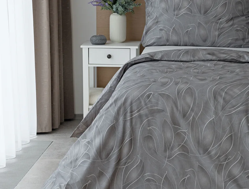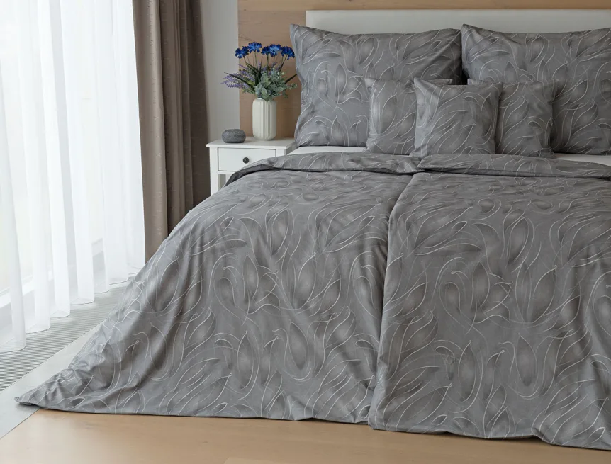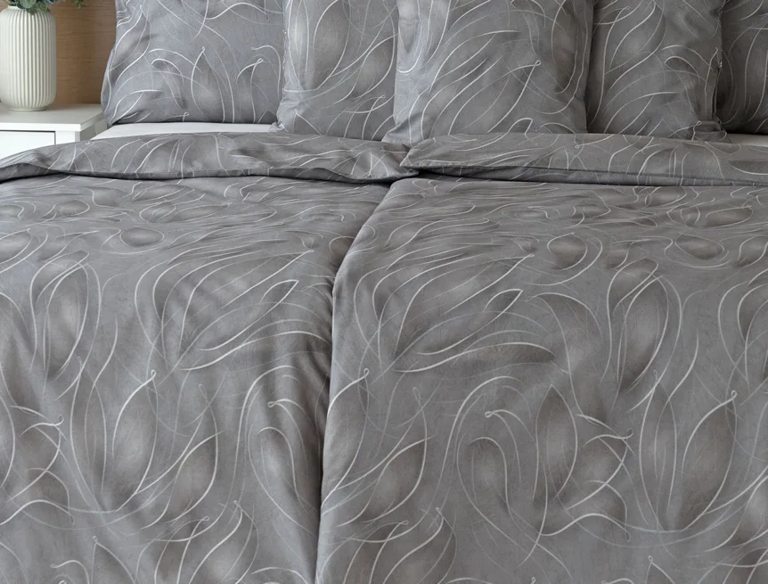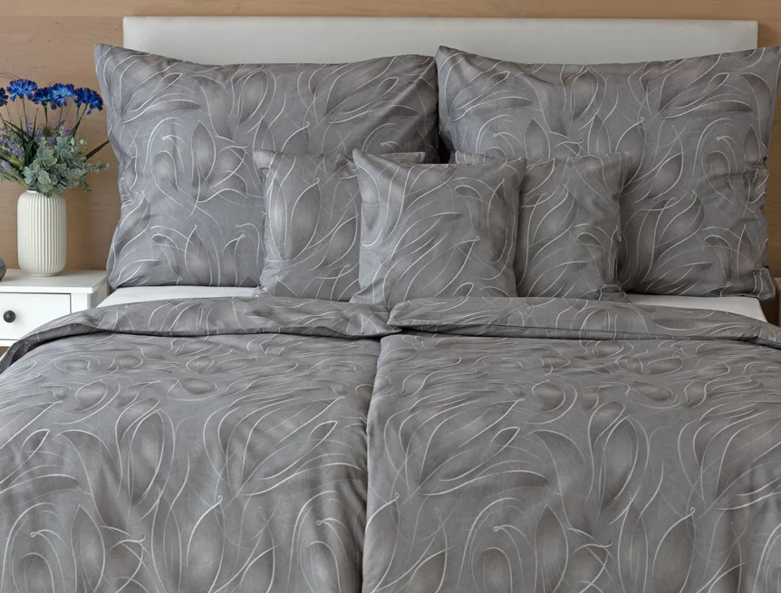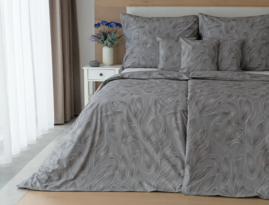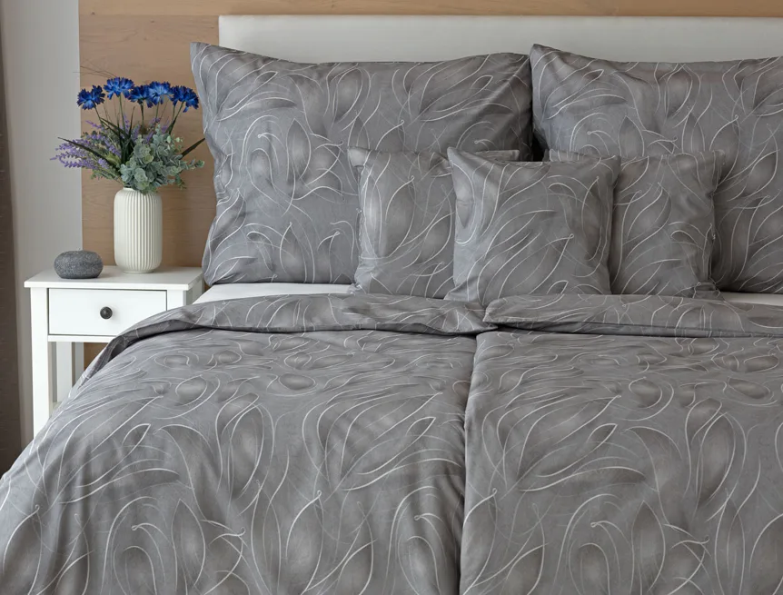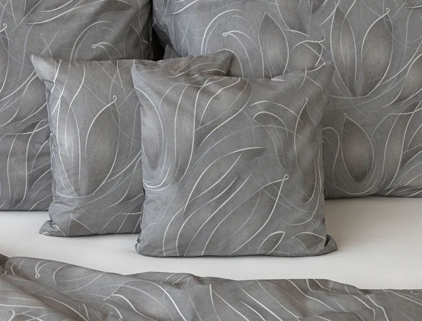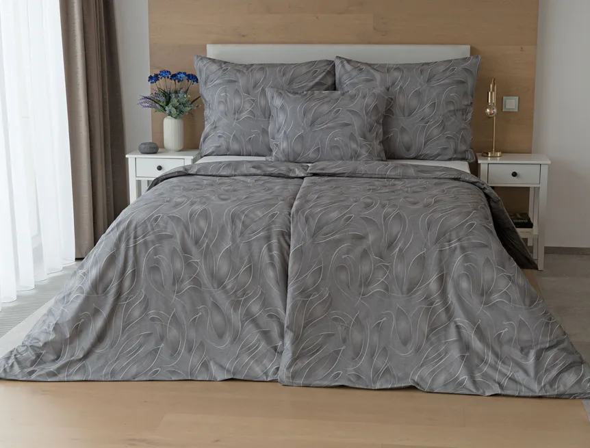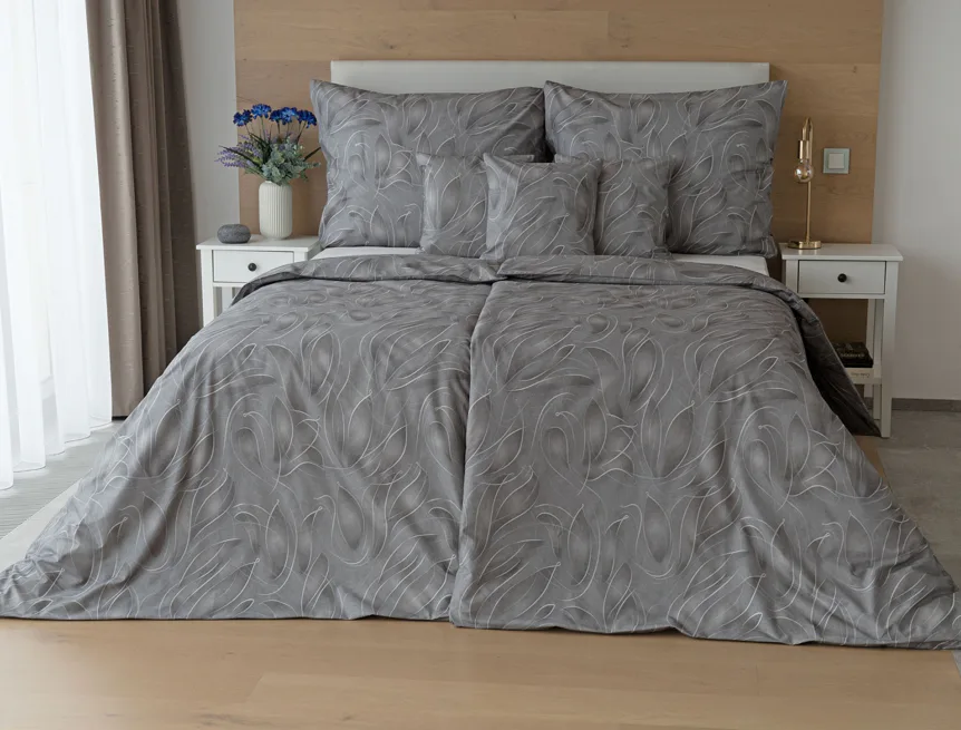 S bavlněným povlečením Adeline bude vaše ložnice elegantní a vždy dokonalá. Světlé kontury decentního lístkového vzoru vynikají na antracitově šedém podkladu. Celý vzor podtrhuje důmyslné stínování, o které se postarala nejmodernější digitální tisková technologie.