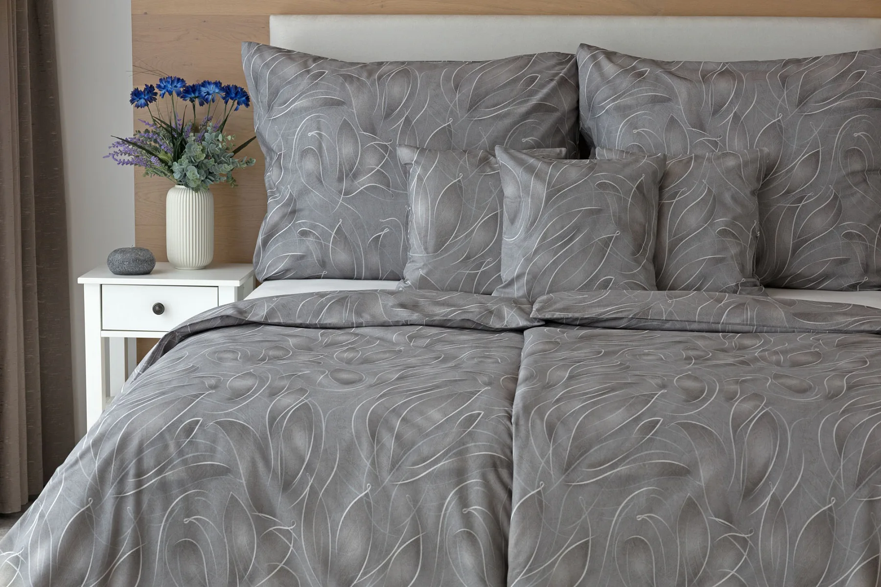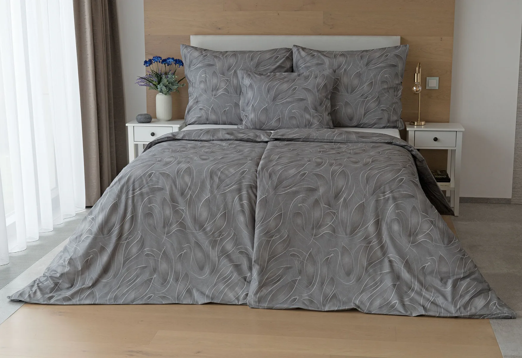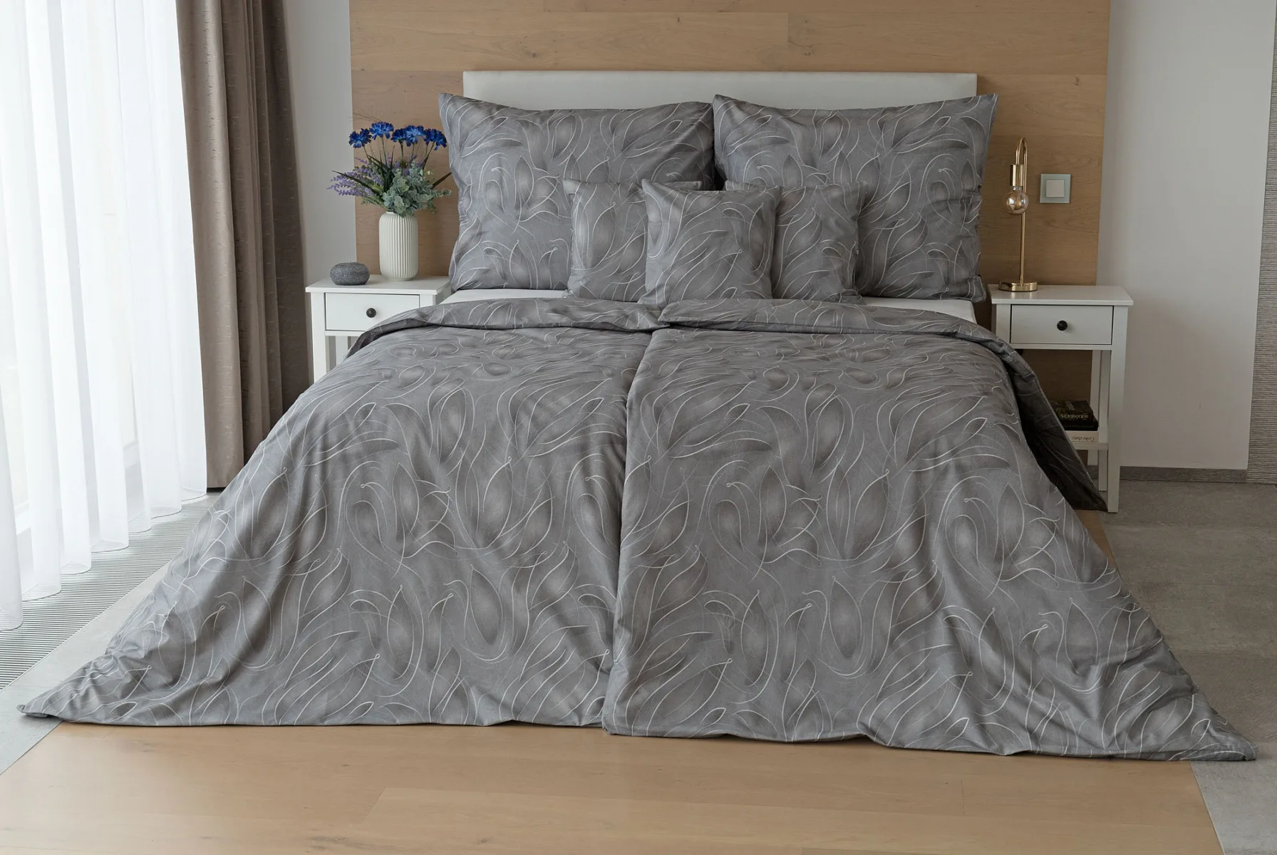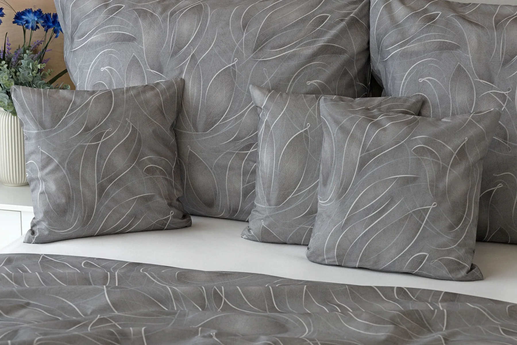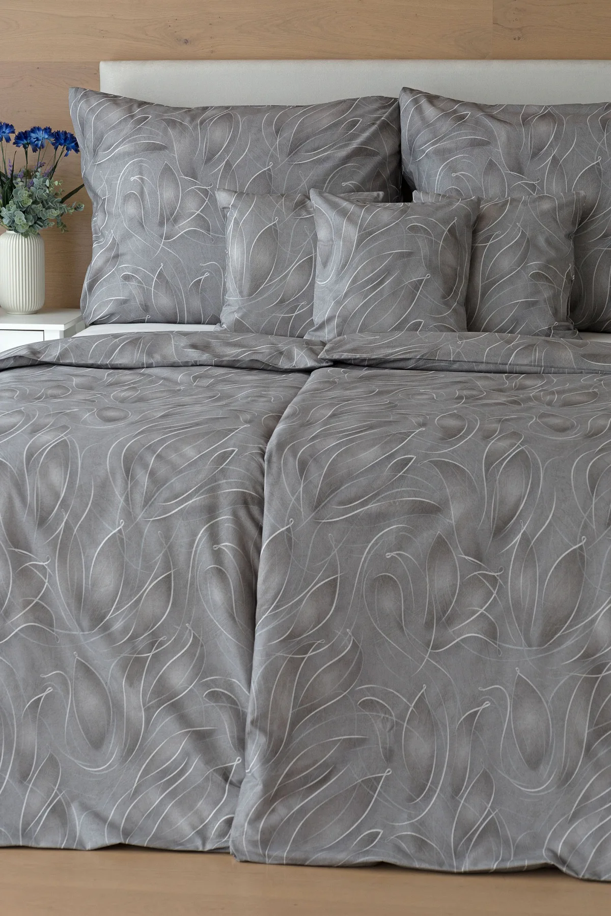 S bavlněným povlečením Adeline bude vaše ložnice elegantní a vždy dokonalá. Světlé kontury decentního lístkového vzoru vynikají na antracitově šedém podkladu. Celý vzor podtrhuje důmyslné stínování, o které se postarala nejmodernější digitální tisková technologie.
