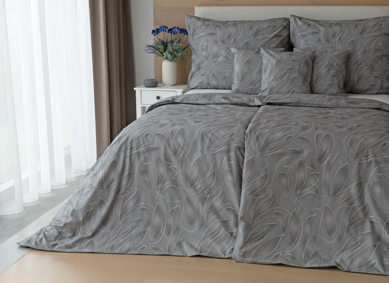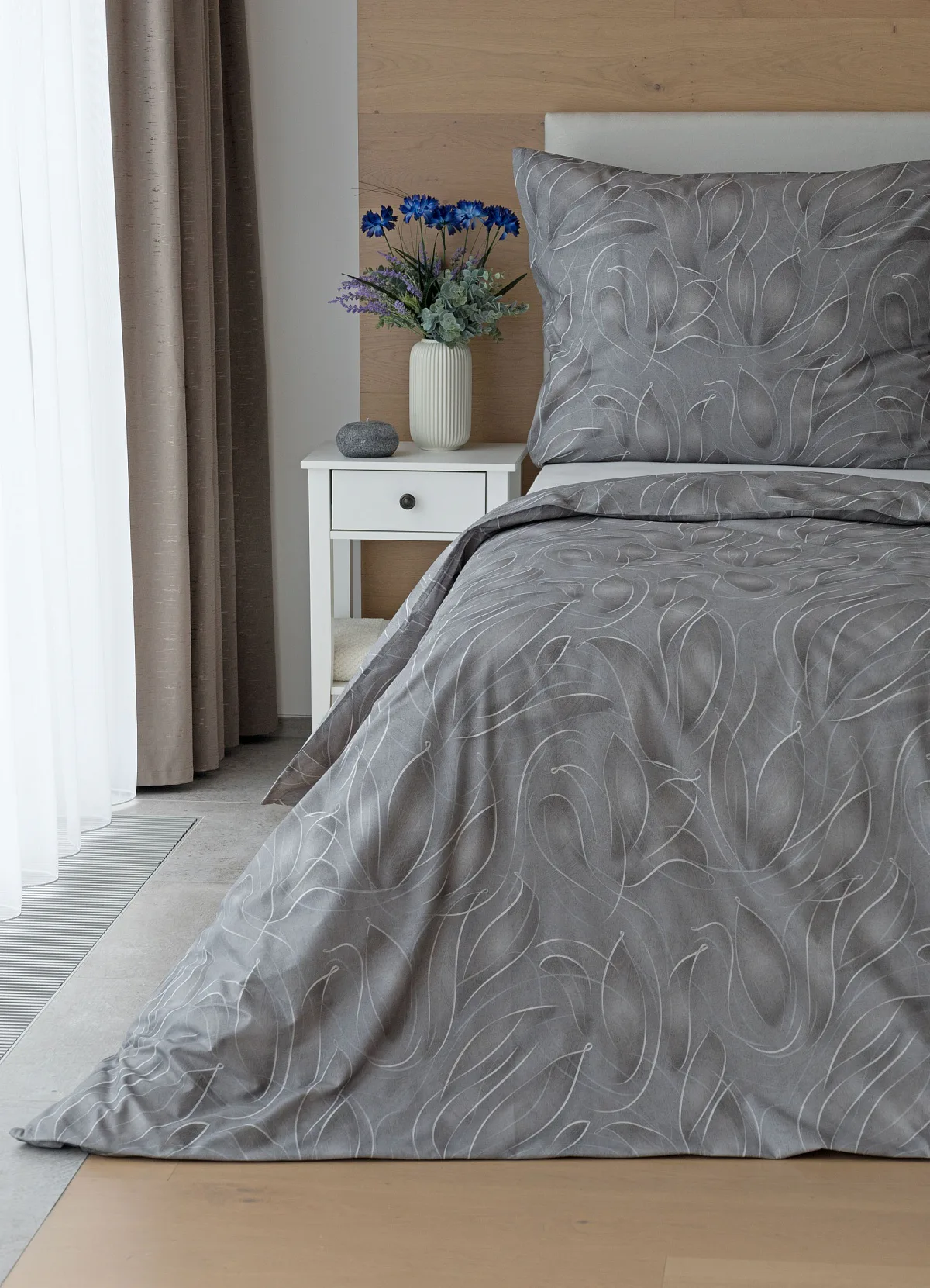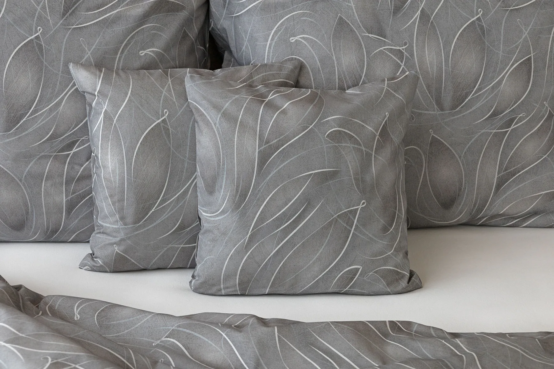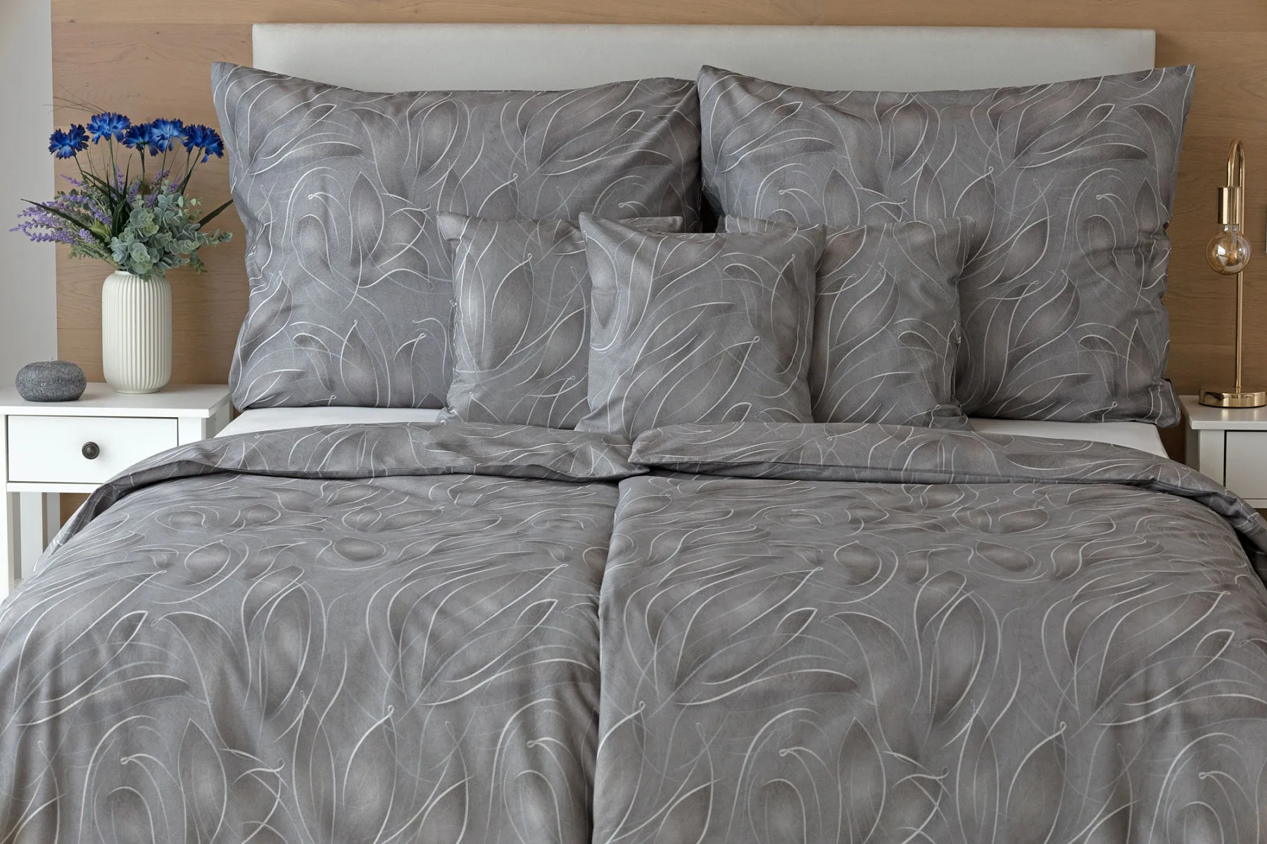 S bavlněným povlečením Adeline bude vaše ložnice elegantní a vždy dokonalá. Světlé kontury decentního lístkového vzoru vynikají na antracitově šedém podkladu. Celý vzor podtrhuje důmyslné stínování, o které se postarala nejmodernější digitální tisková technologie.