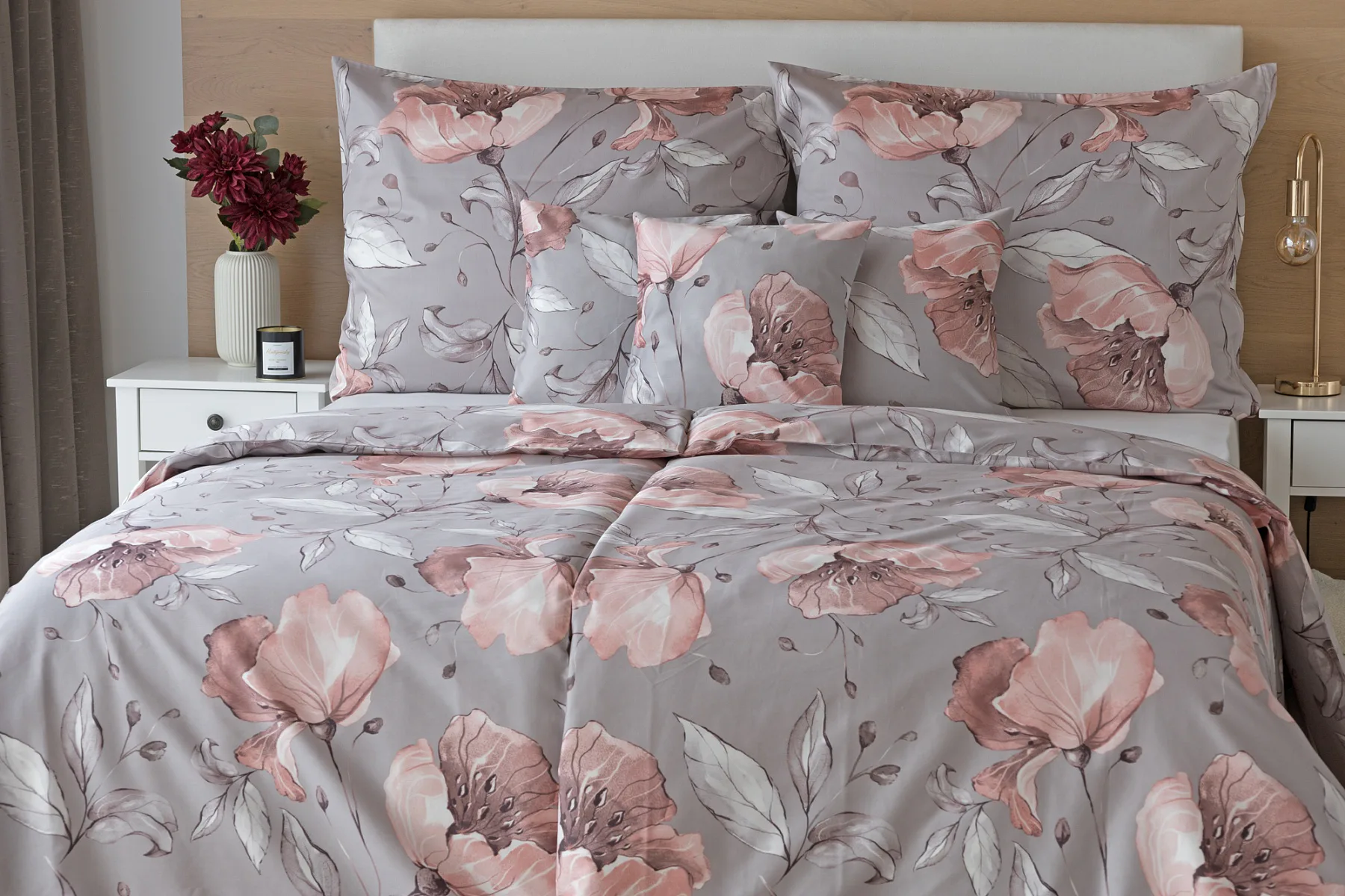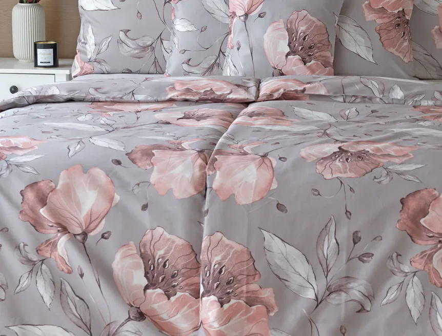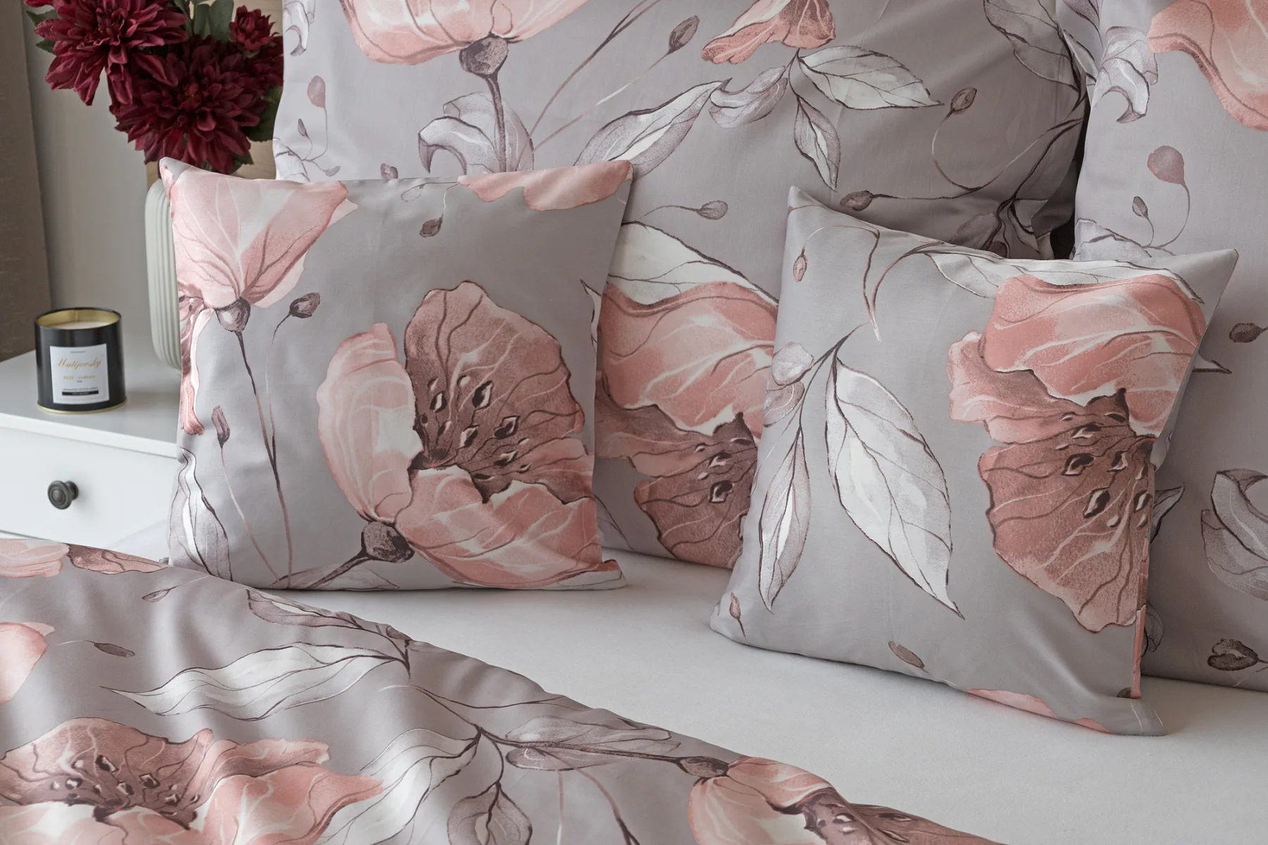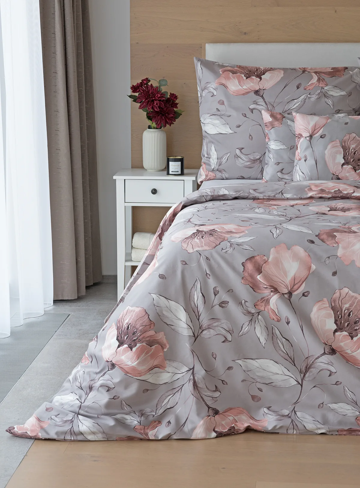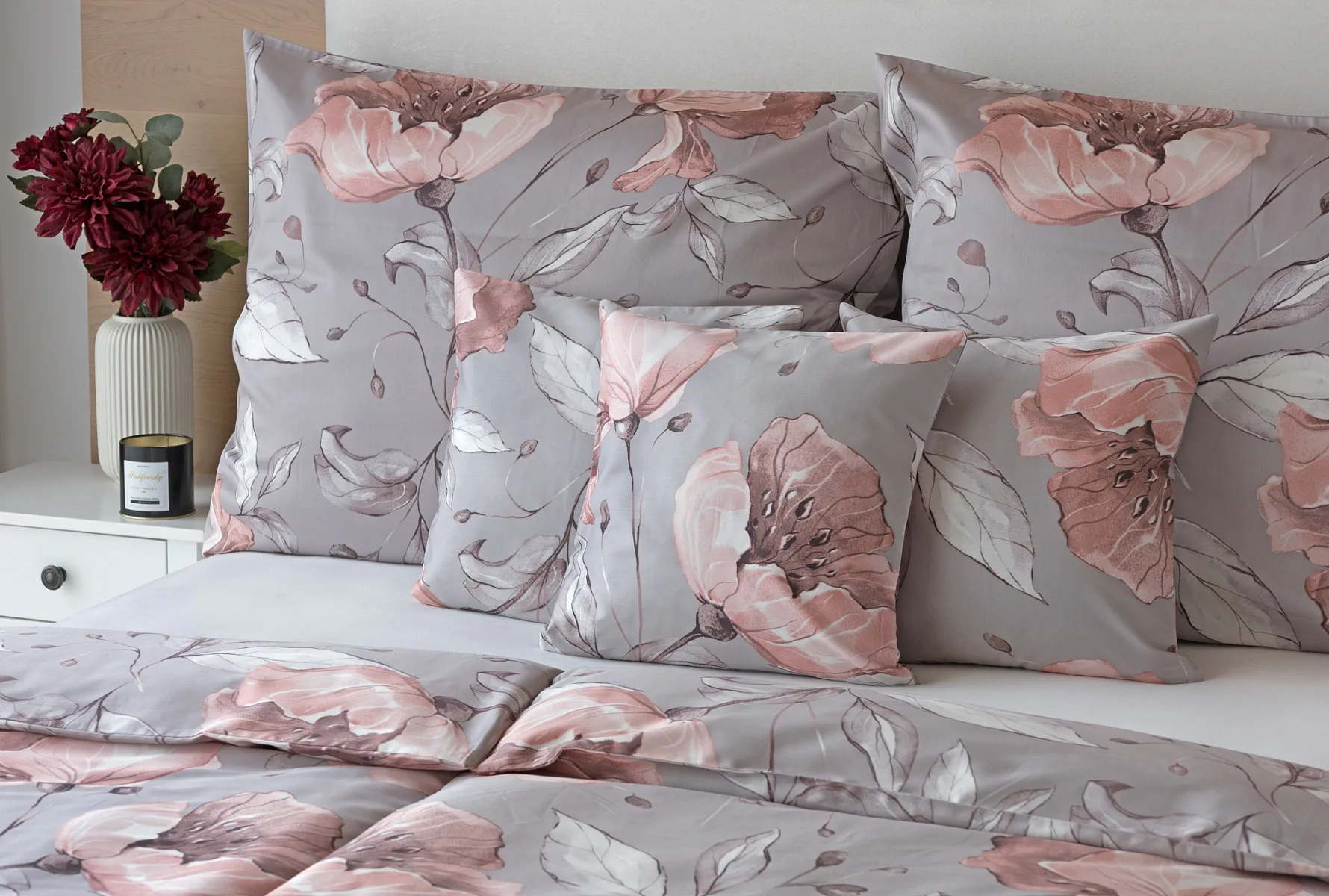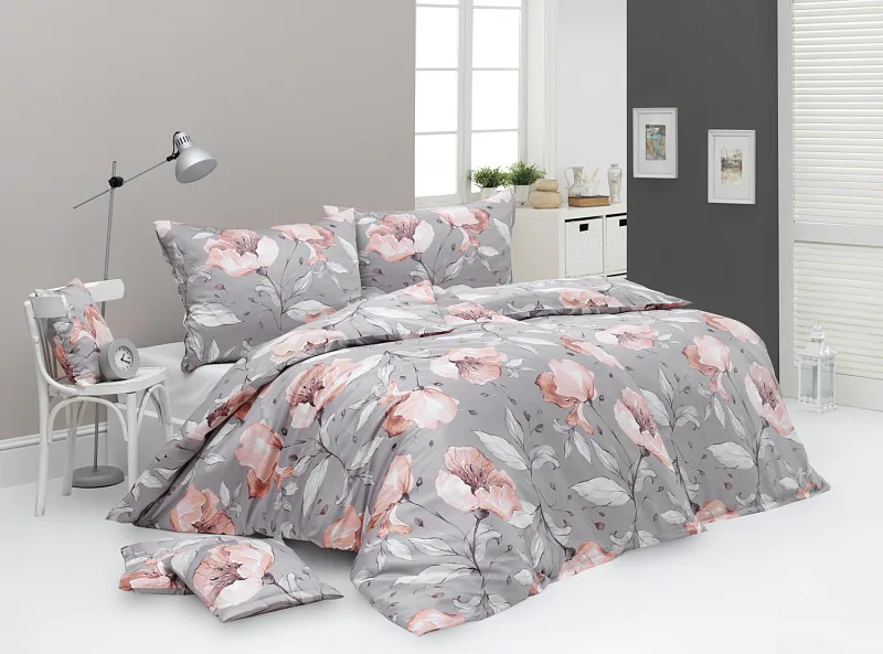 Nechte se okouzlit nadčasovou elegancí ložního povlečení Amabel. Jemný florální vzor v paletě pudrových a růžových tónů je v dokonalé harmonii s pastelově šedým podkladem. Jemné šedobílé prvky podtrhují plastičnost okvětních lístků.