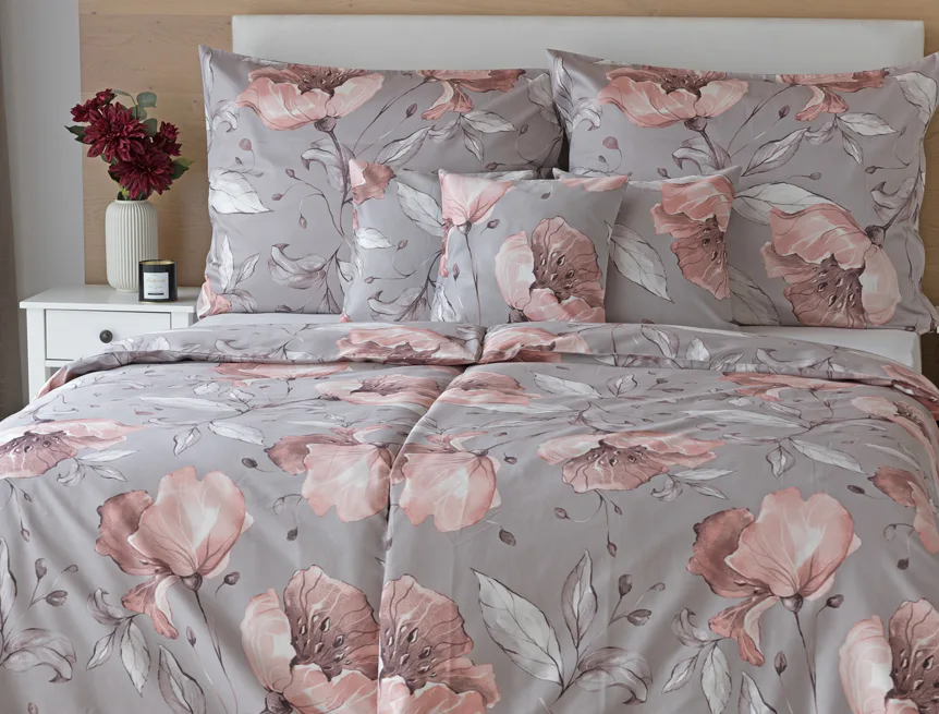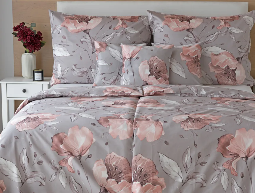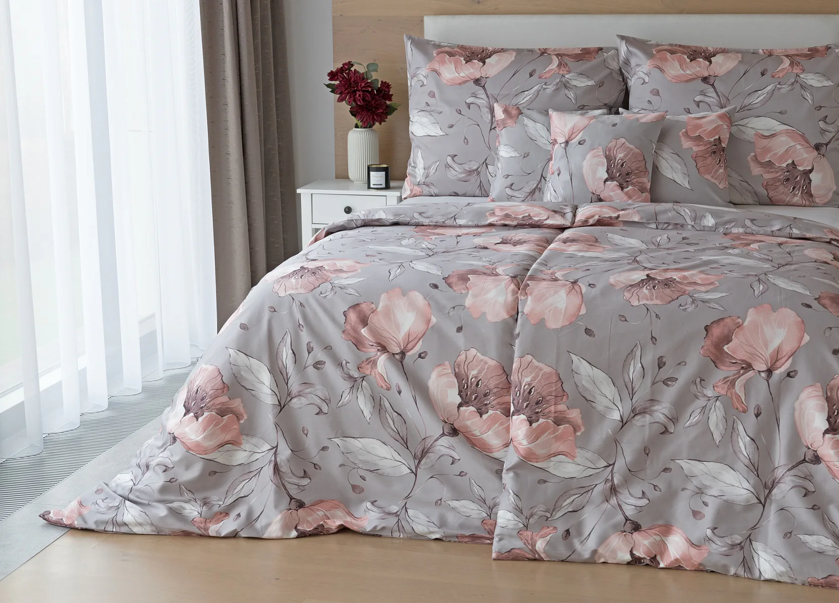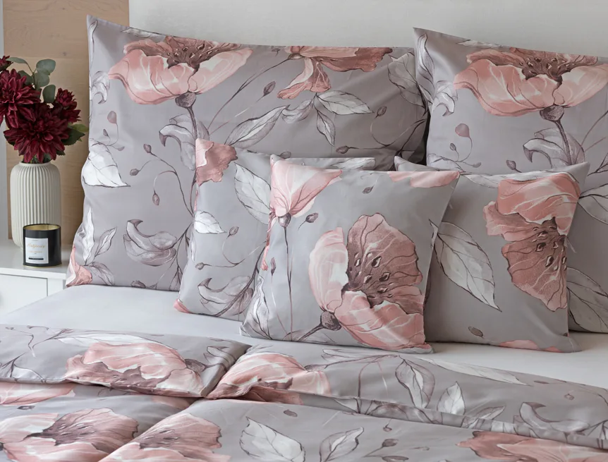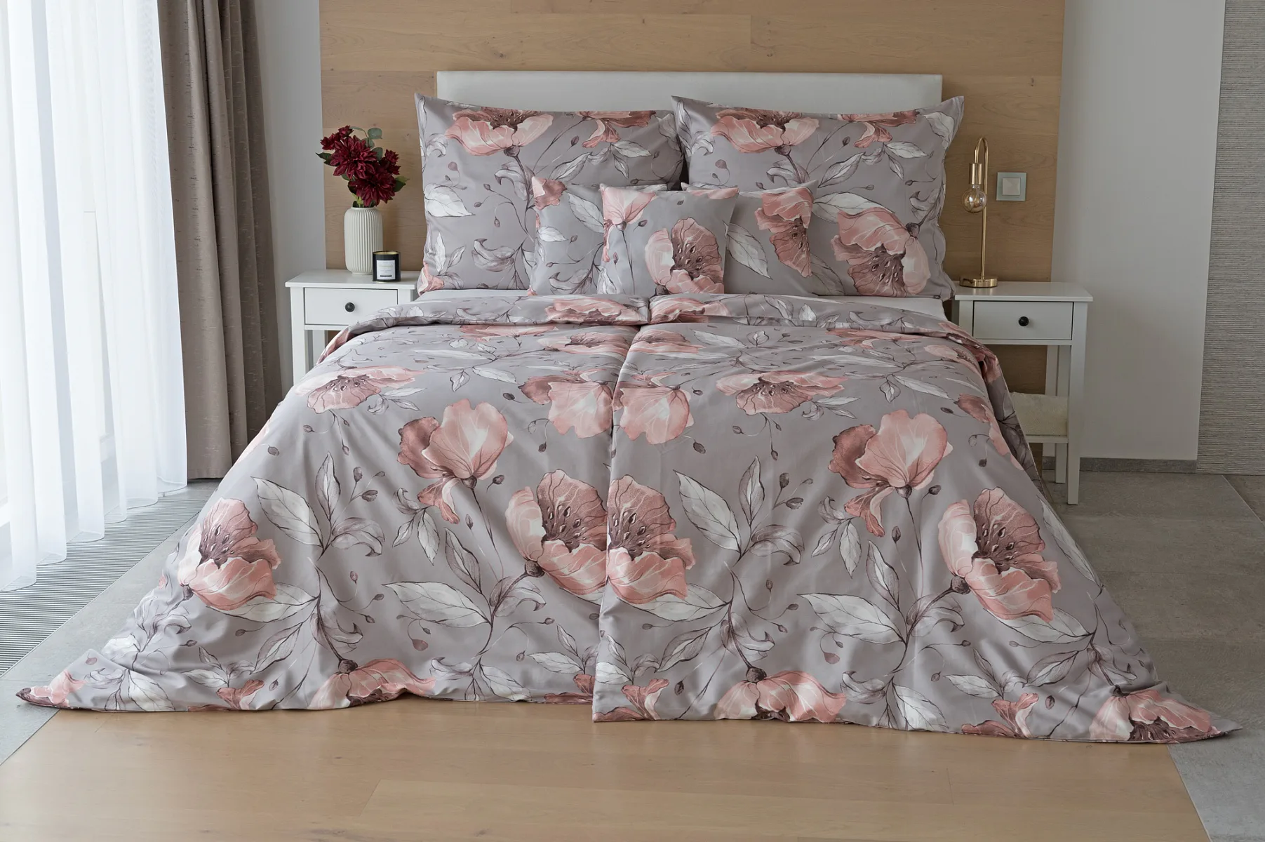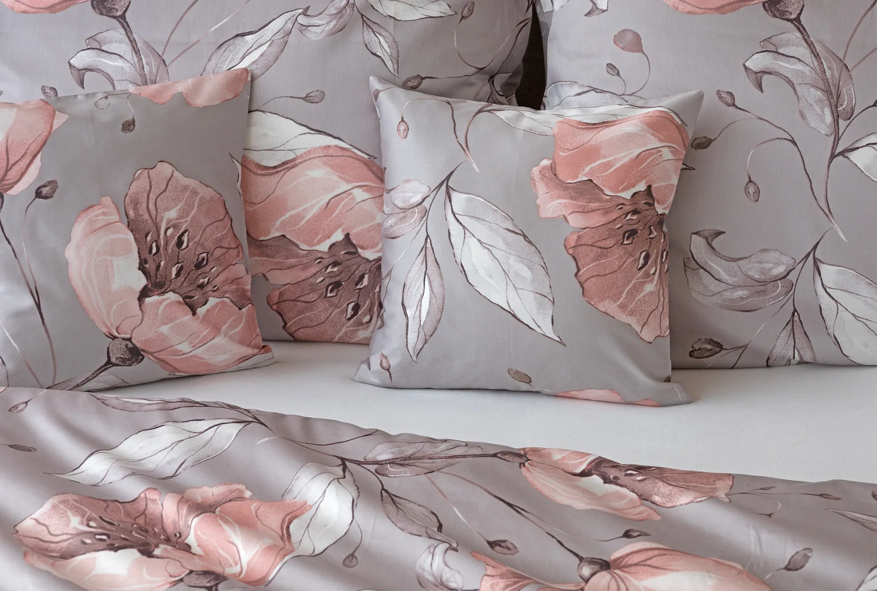 Nechte se okouzlit nadčasovou elegancí ložního povlečení Amabel. Jemný florální vzor v paletě pudrových a růžových tónů je v dokonalé harmonii s pastelově šedým podkladem. Jemné šedobílé prvky podtrhují plastičnost okvětních lístků.