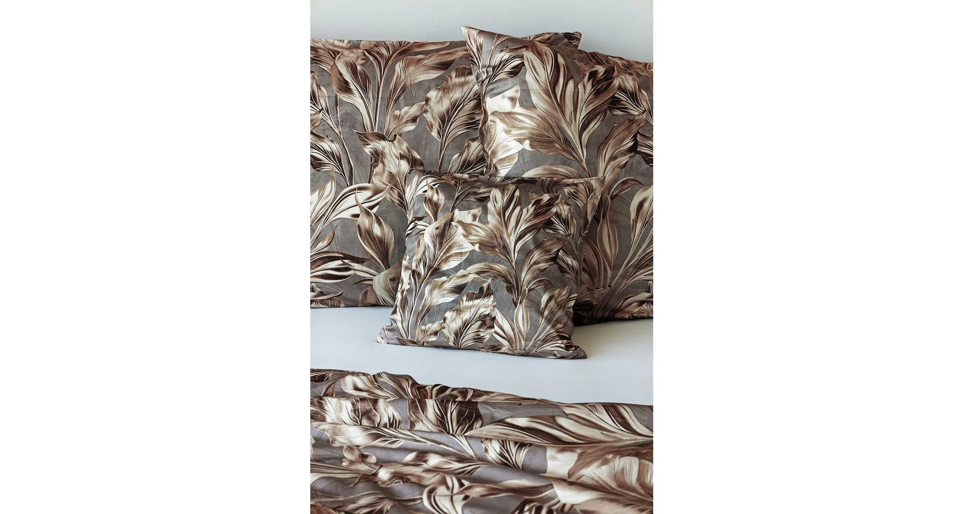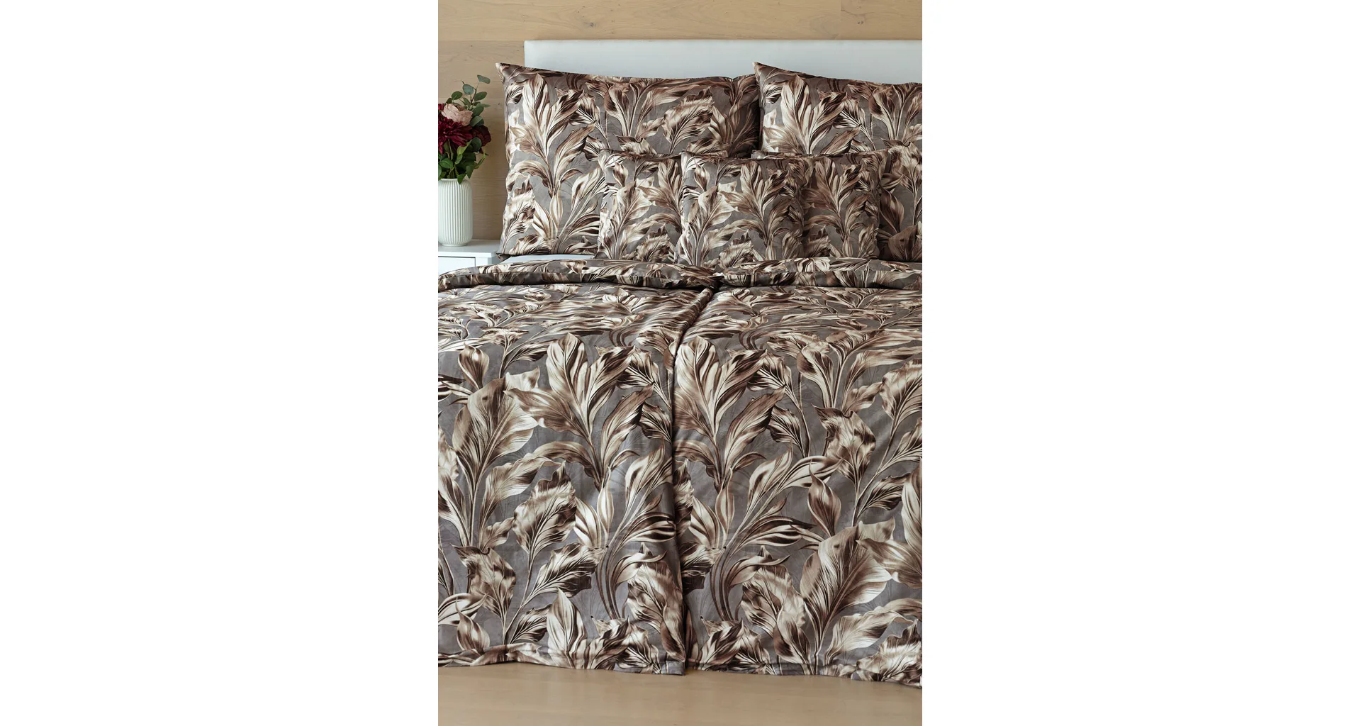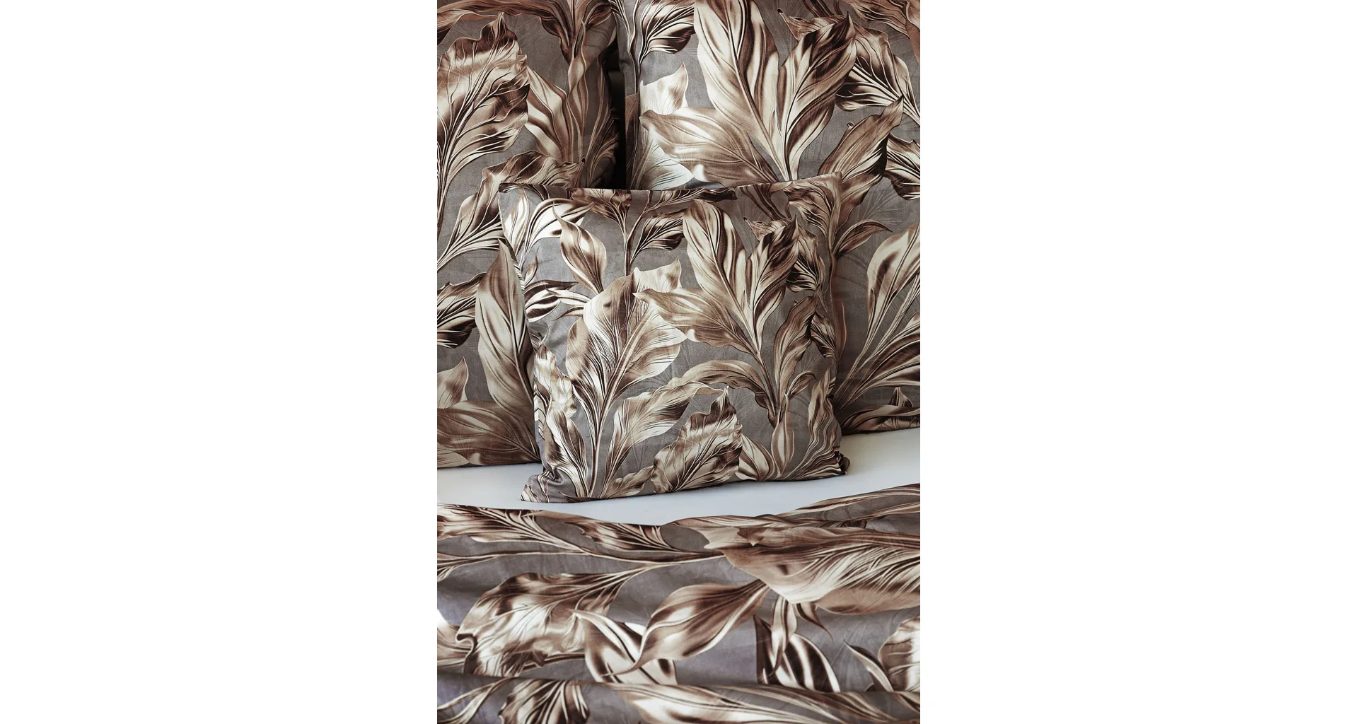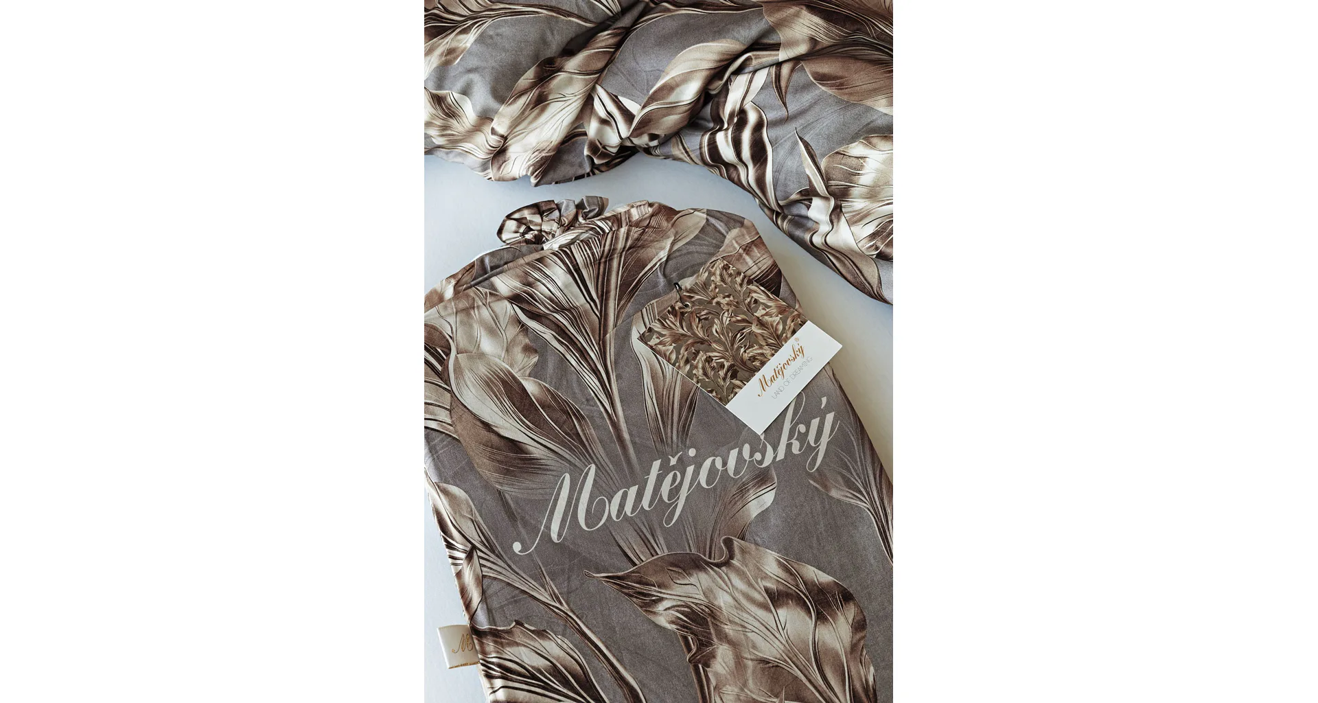 Vzor Ambient zdobí po celé ploše hnědo-zlaté listy na kovově šedém podkladu. Povlak na polštář i na přikrývku je z obou stran stejný, povlečení je opatřeno komfortním zipovým uzávěrem.