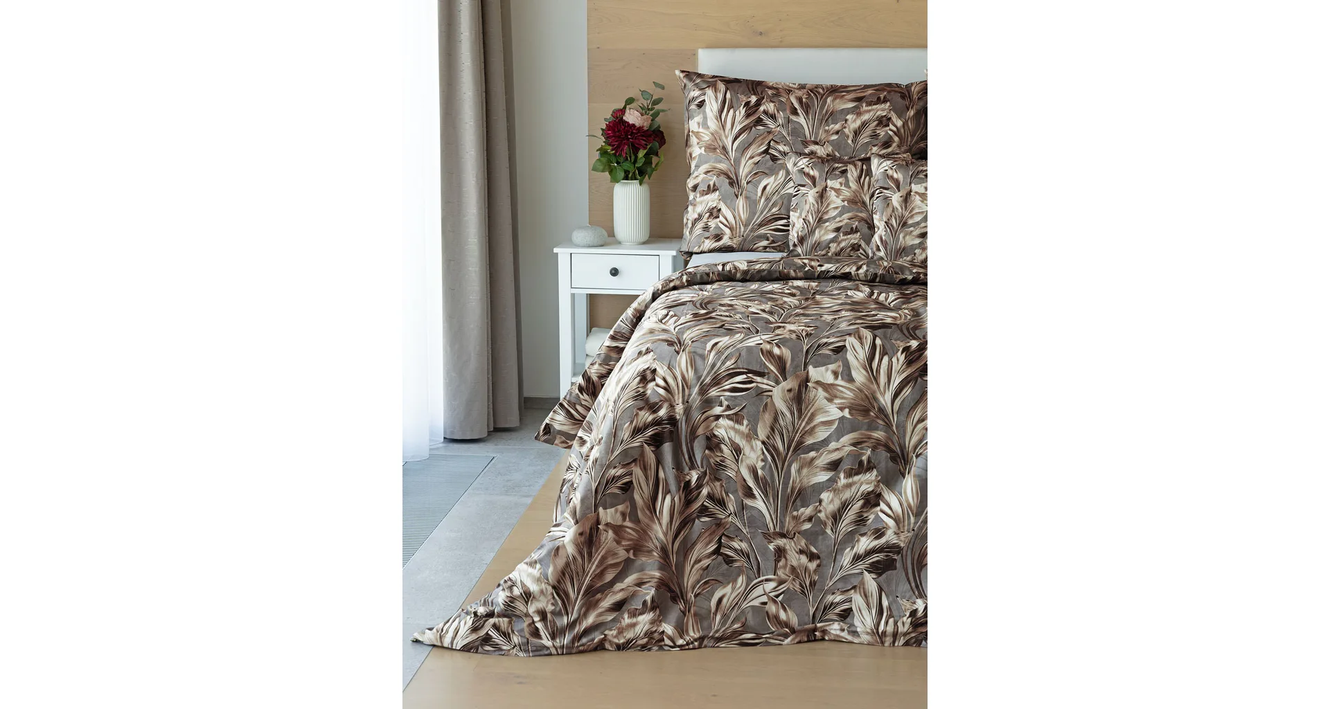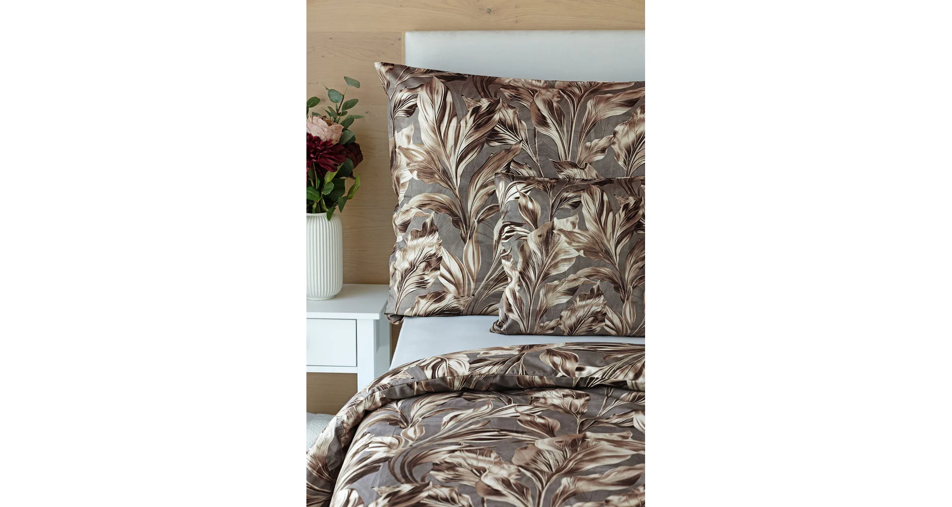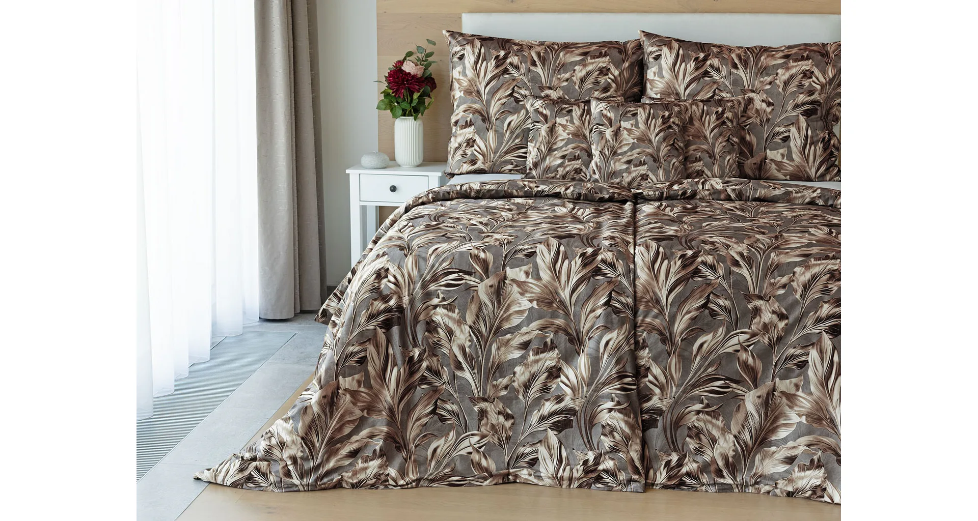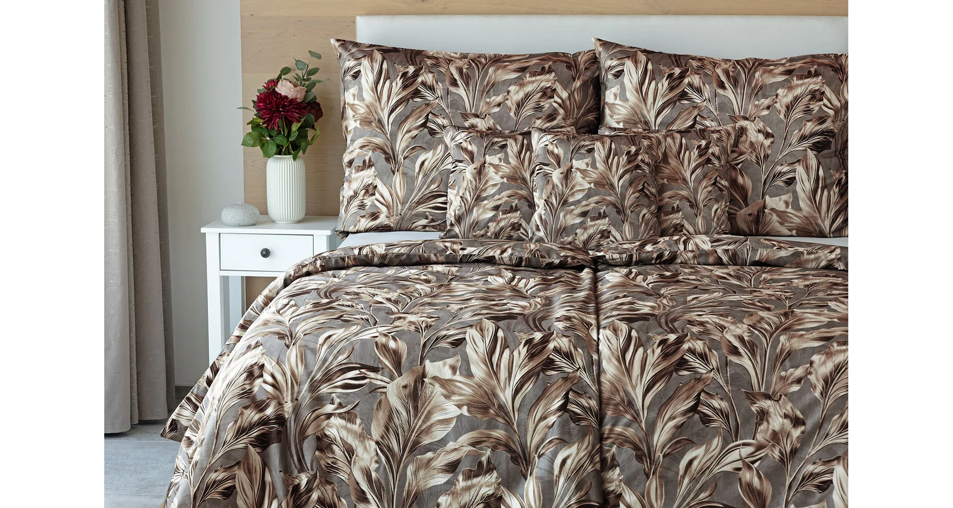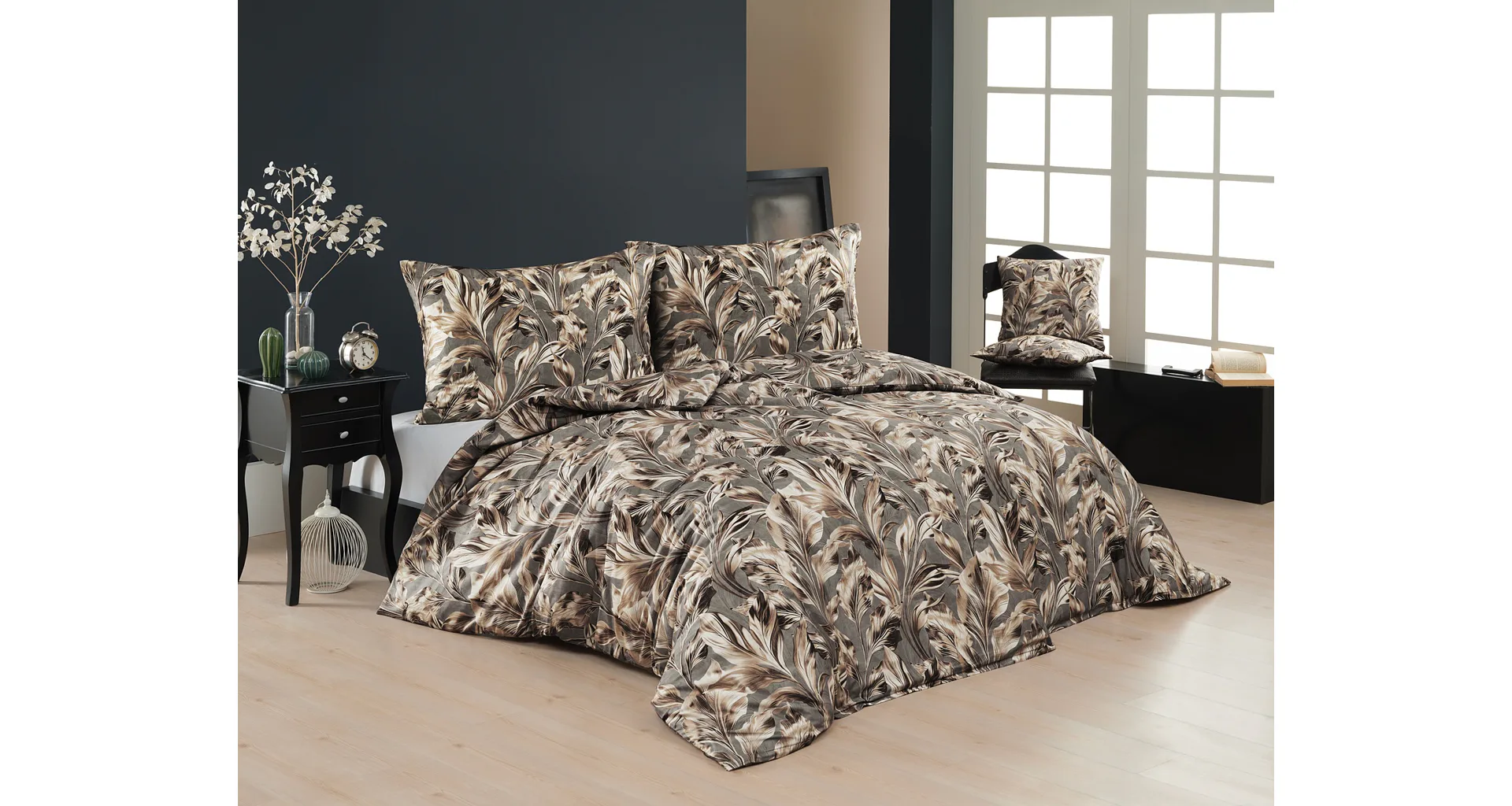 Vzor Ambient zdobí po celé ploše hnědo-zlaté listy na kovově šedém podkladu. Povlak na polštář i na přikrývku je z obou stran stejný, povlečení je opatřeno komfortním zipovým uzávěrem.