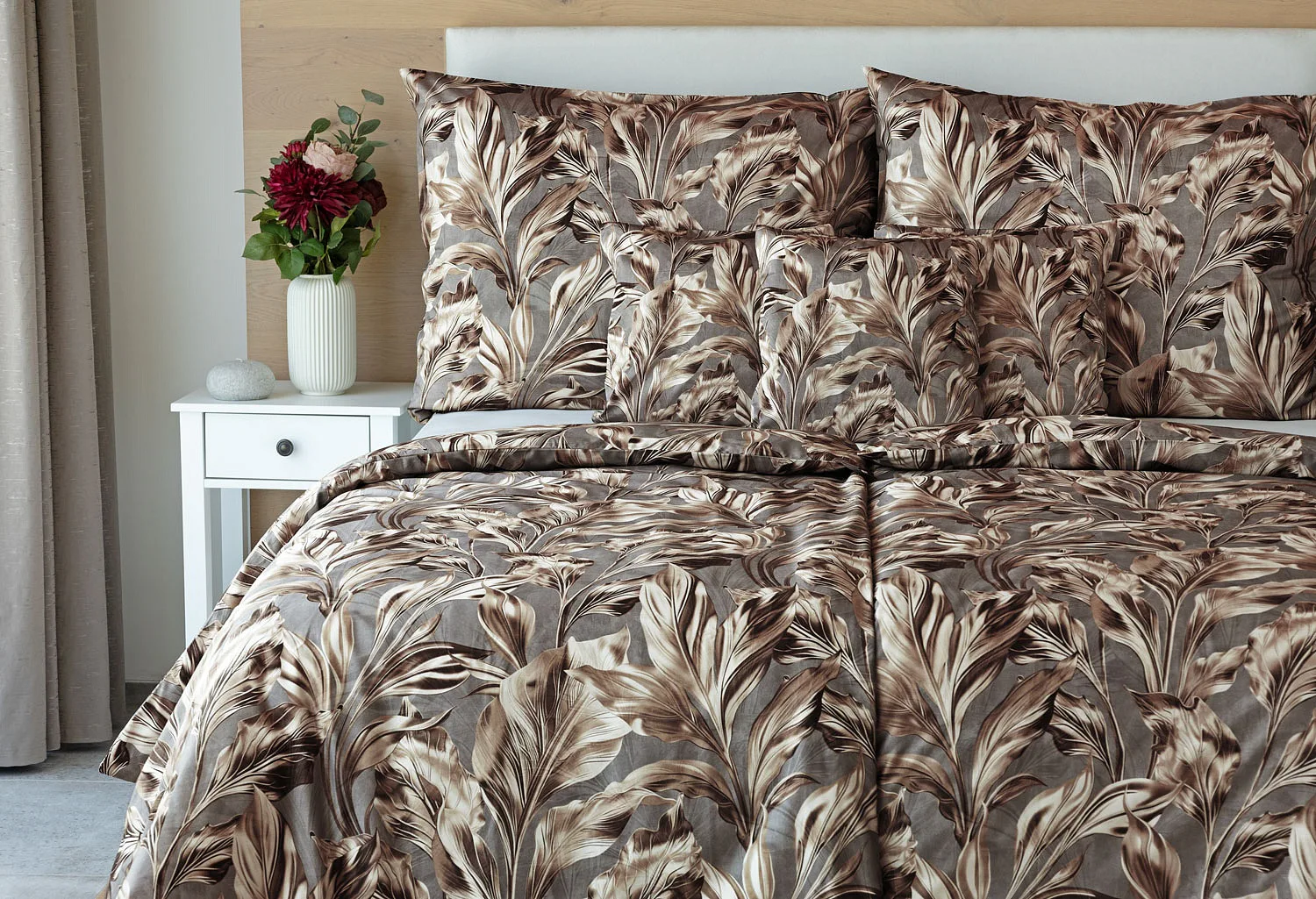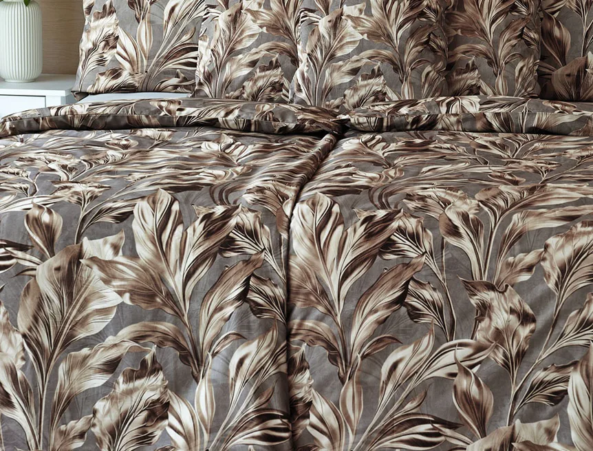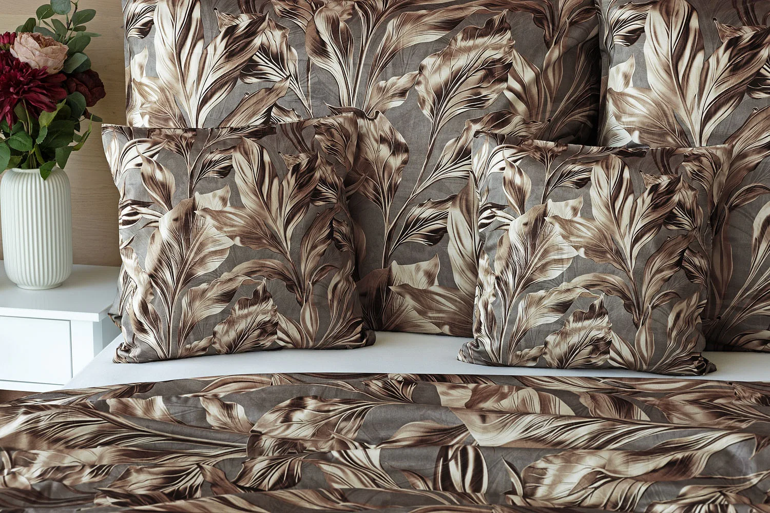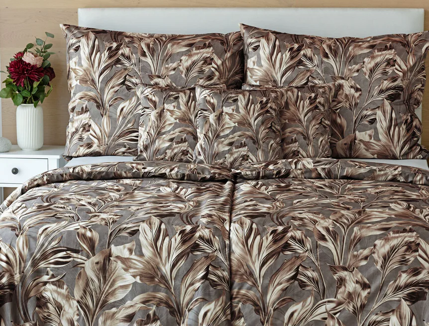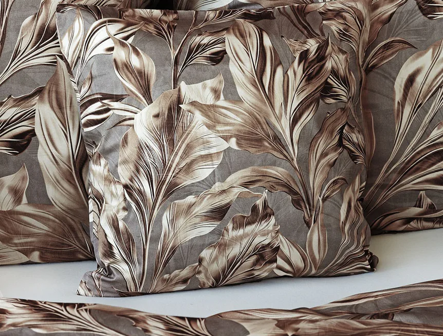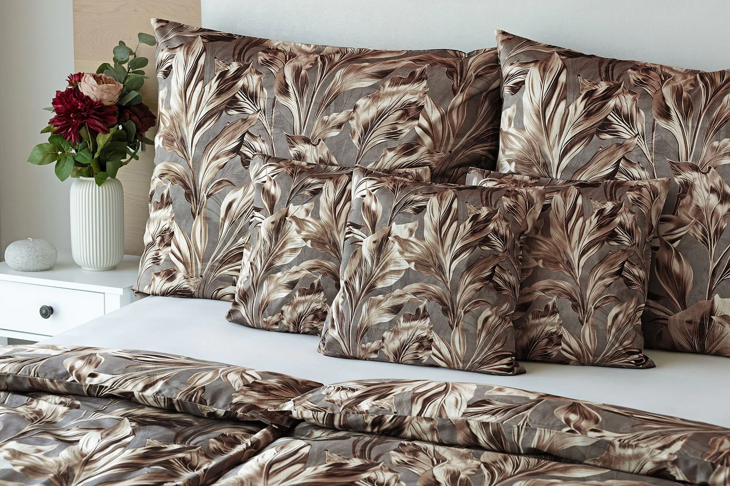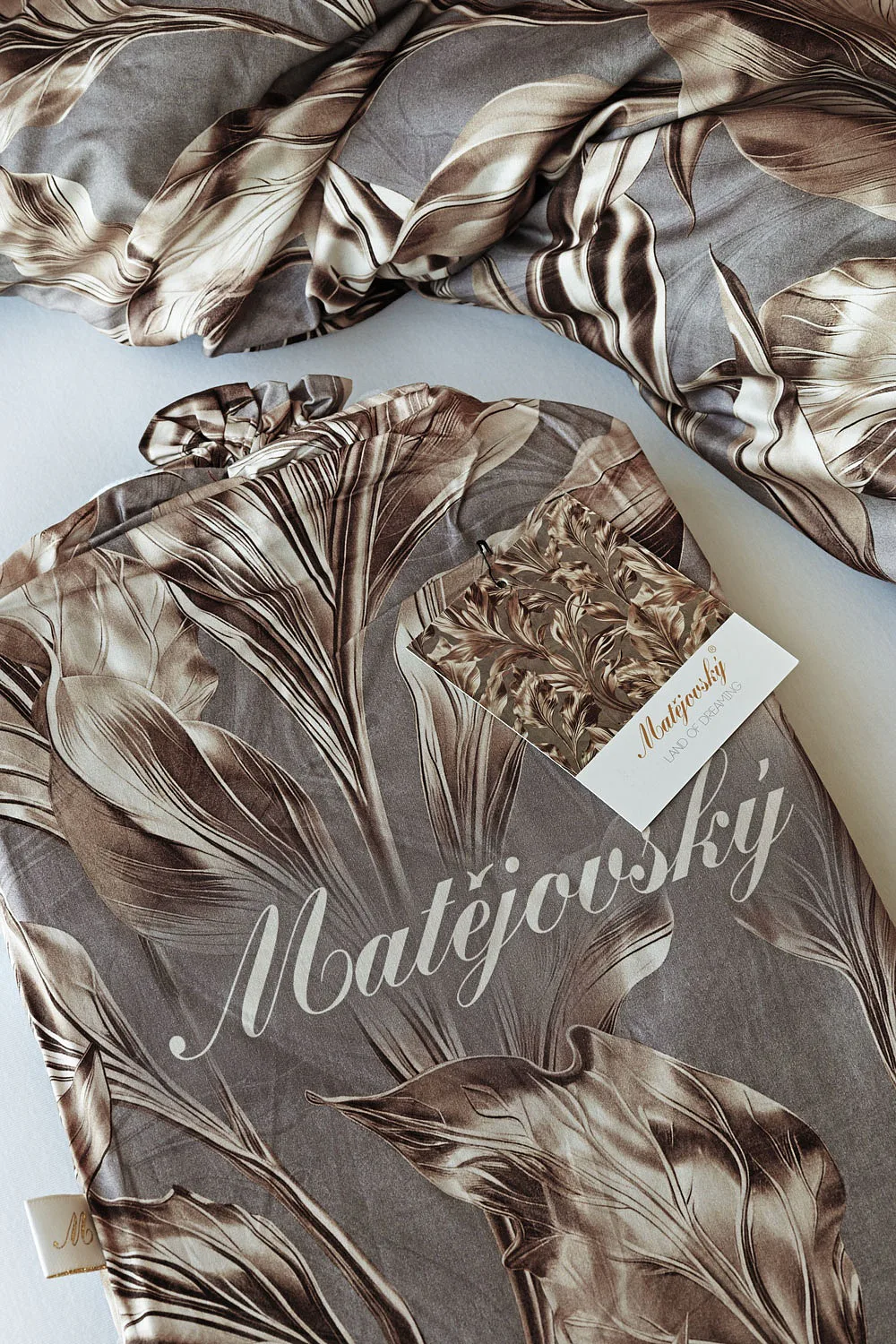 Vzor Ambient zdobí po celé ploše hnědo-zlaté listy na kovově šedém podkladu. Povlak na polštář i na přikrývku je z obou stran stejný, povlečení je opatřeno komfortním zipovým uzávěrem.