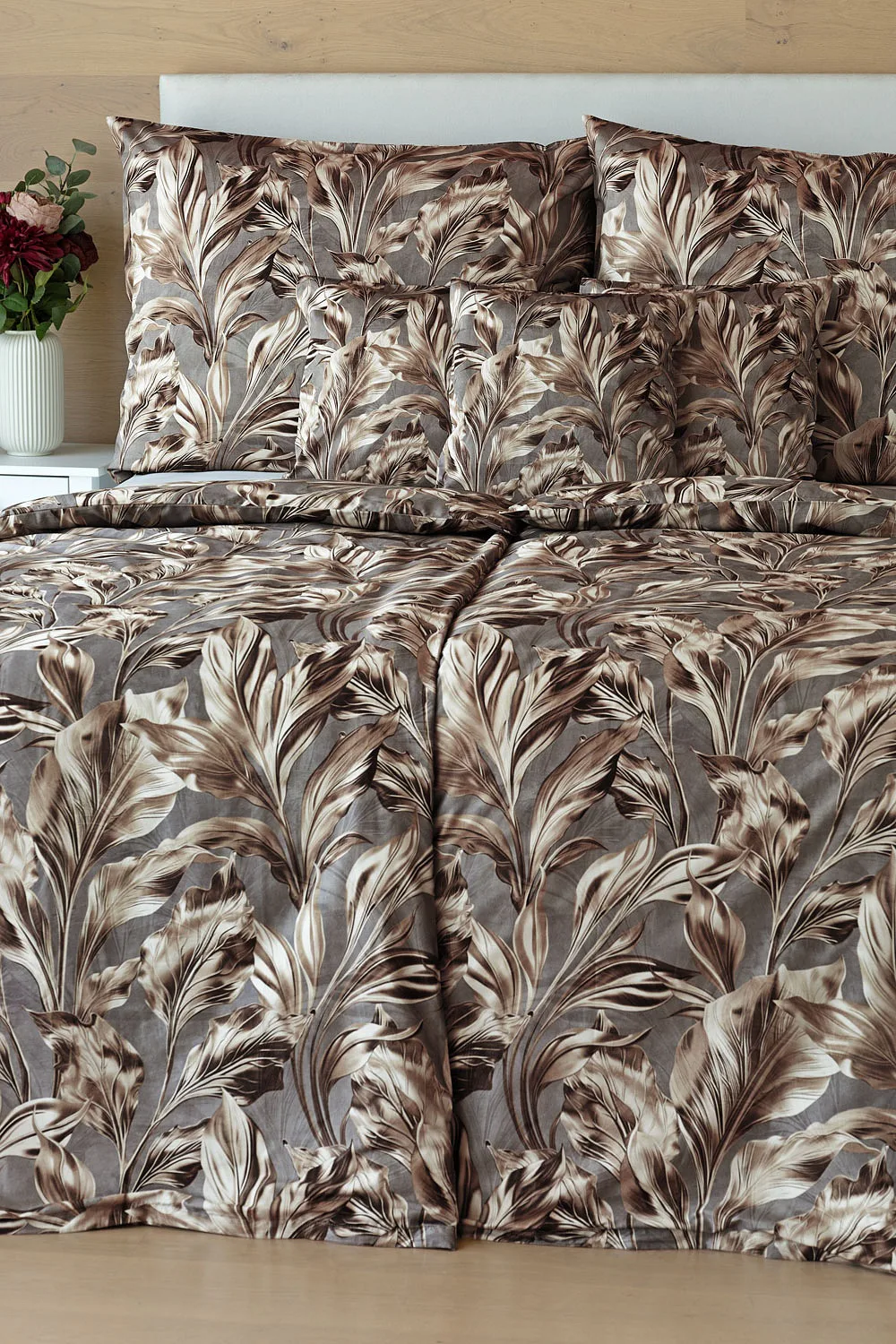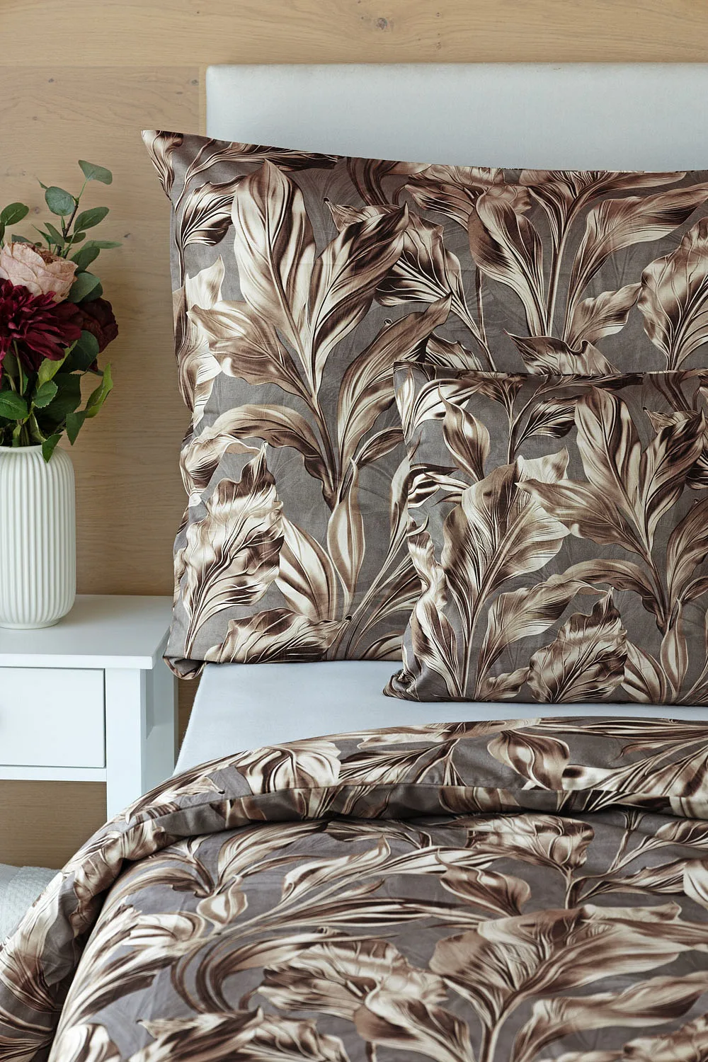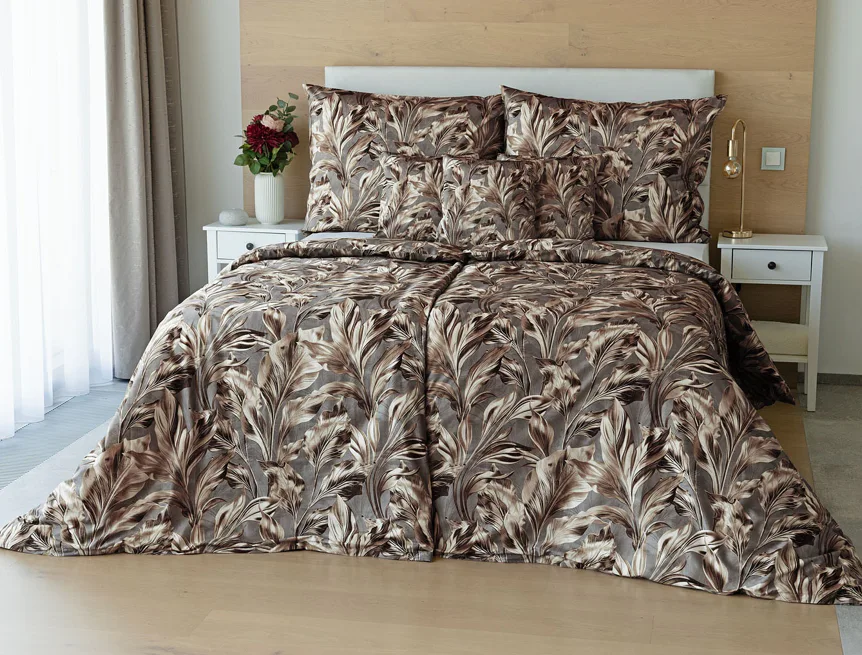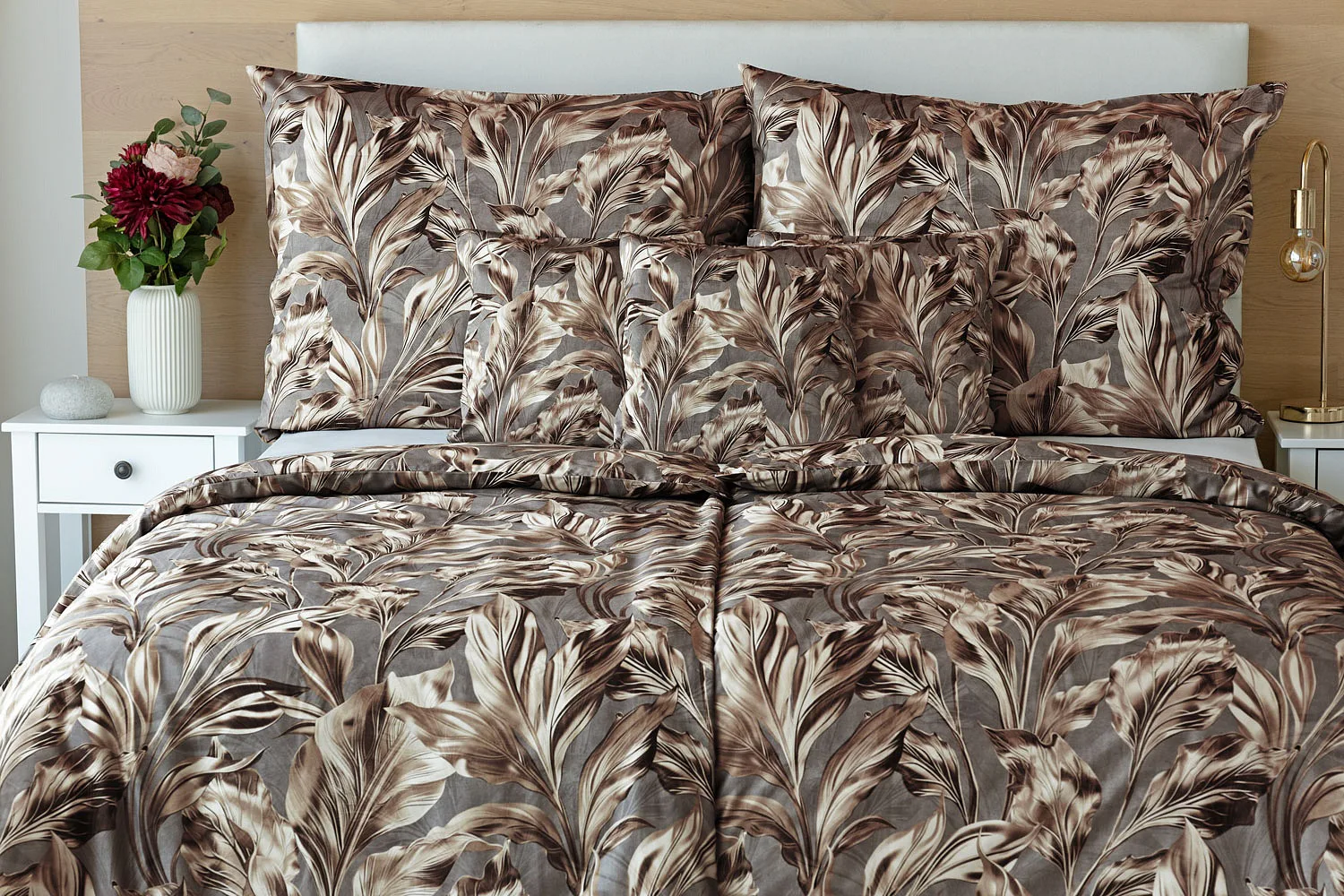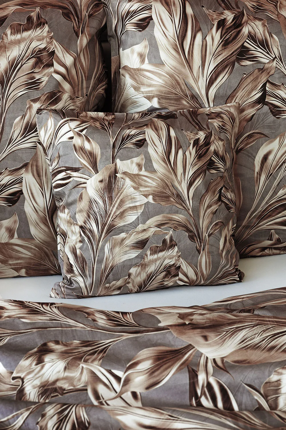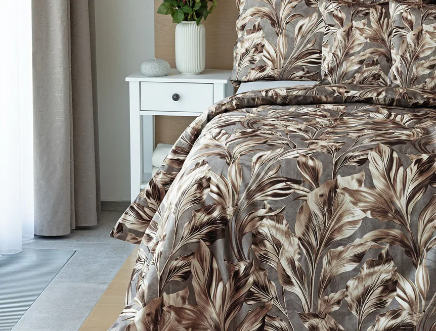 Vzor Ambient zdobí po celé ploše hnědo-zlaté listy na kovově šedém podkladu. Povlak na polštář i na přikrývku je z obou stran stejný, povlečení je opatřeno komfortním zipovým uzávěrem.