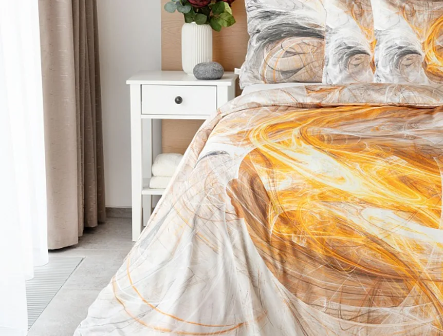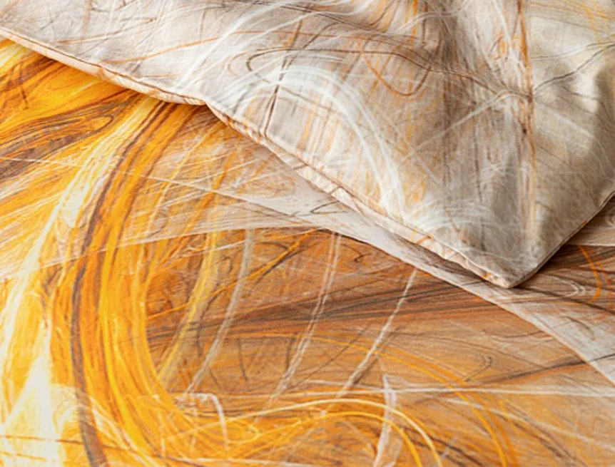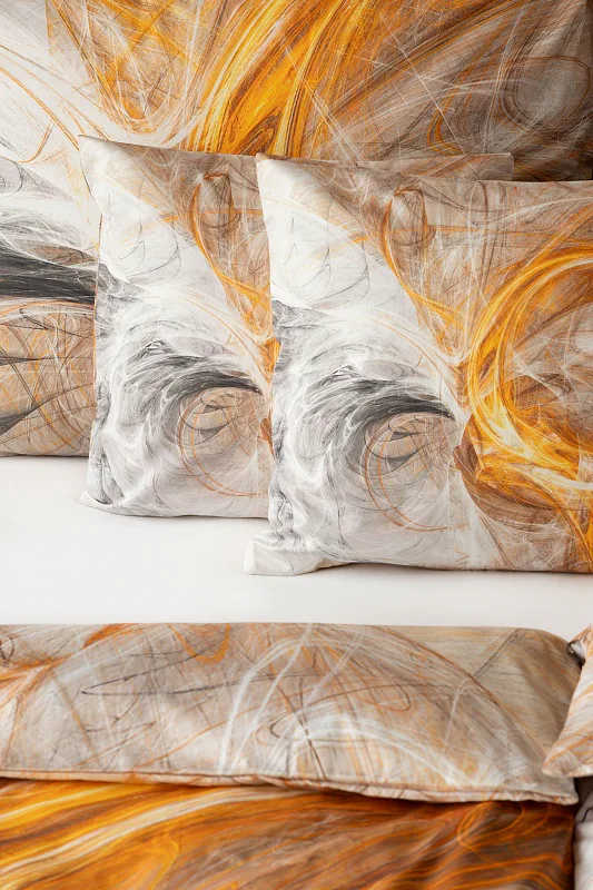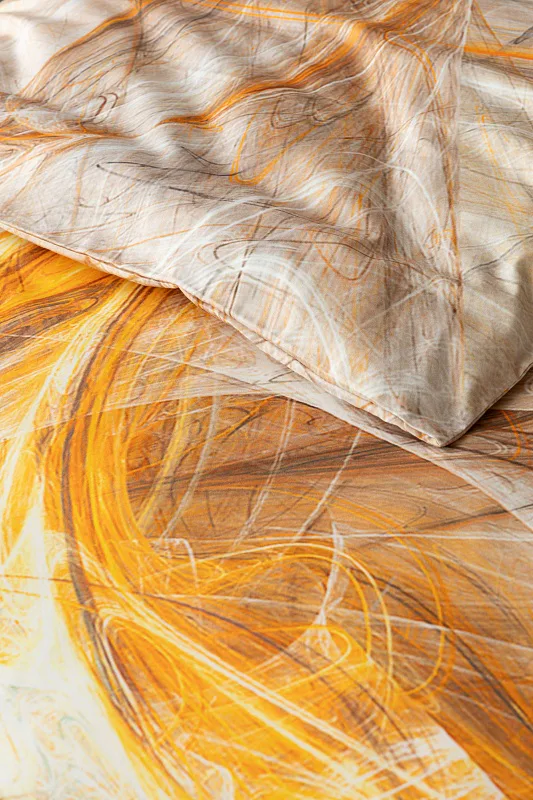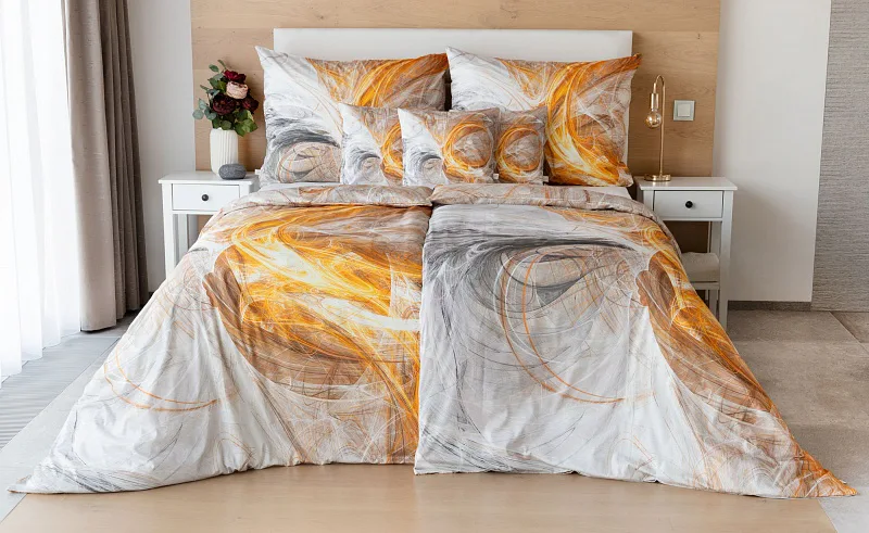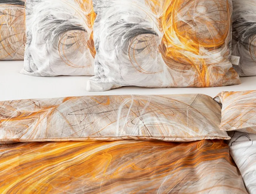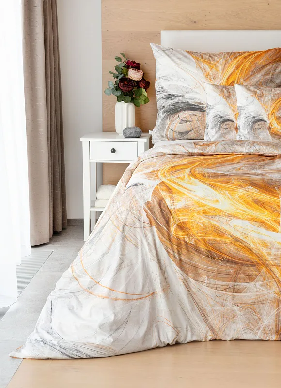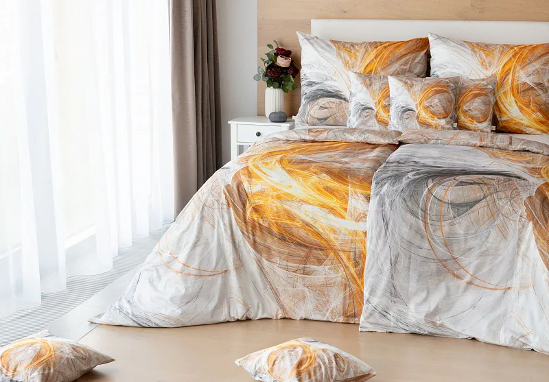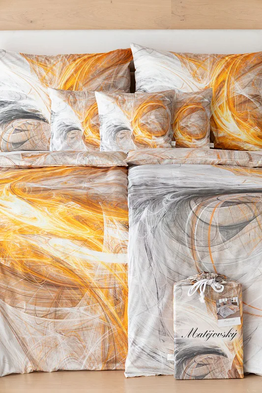 Dynamický vzor povlečení Ambrosia si získá vaši pozornost na první pohled. Umělecký dojem umocňuje originální souhra šedozlatých tónů protnutých v efektní kresbě plné energie. Díky úžasně hebkému mako bavlněnému saténu budete ložní povlečení Ambrosia zbožňovat i na dotek.