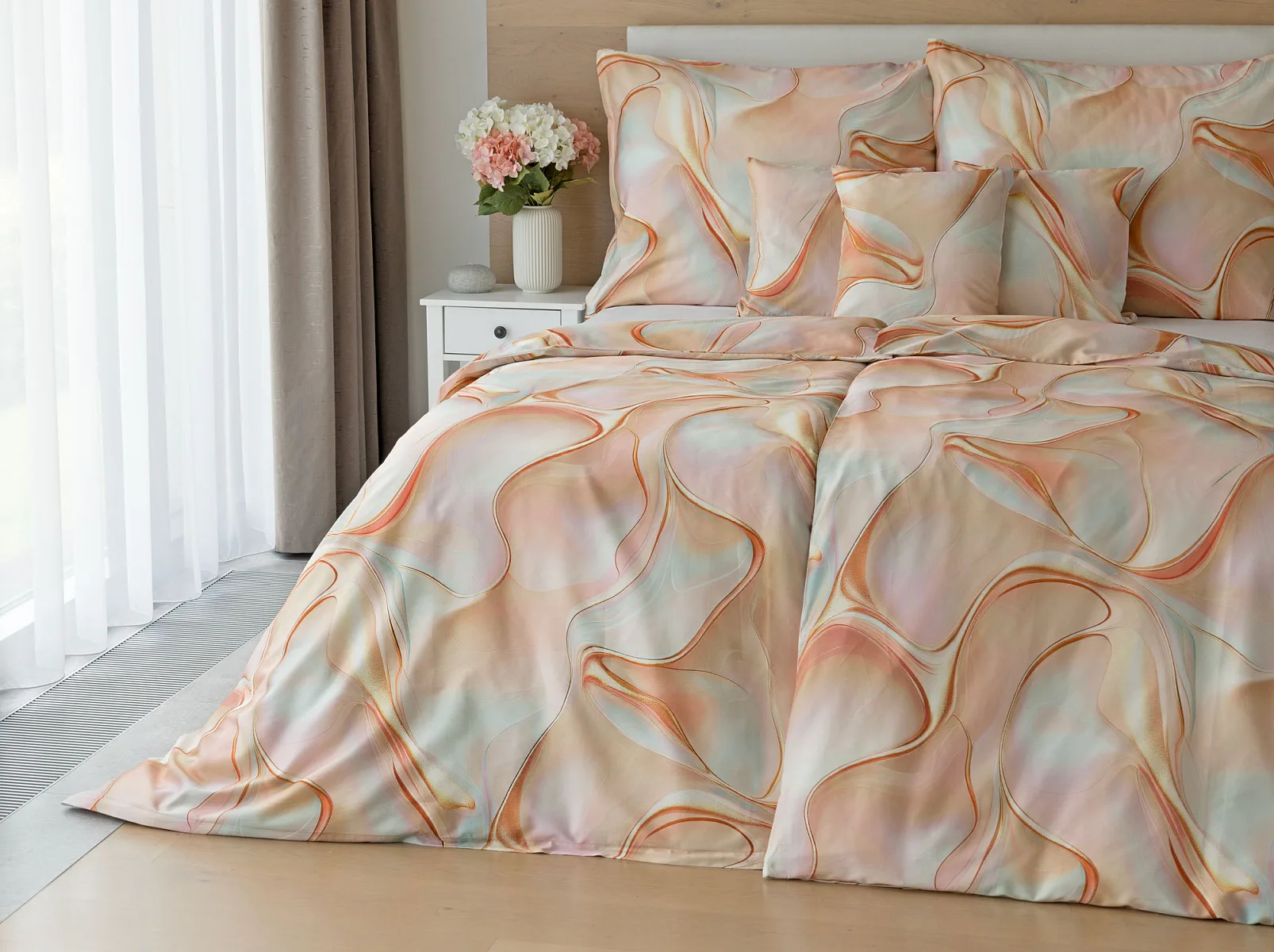 Nechte se uchvátit originálním designem bavlněného ložního povlečení Amulet. V abstraktním vzoru se snoubí celá paleta atraktivních růžových a meruňkových tónů protnutých oranžovými a žlutými konturami autorského návrhu. Díky nejmodernějšímu digitálnímu tisku vynikají barevné přechody i ostré prvky v precizním detailu. Eleganci vzoru podtrhuje hebký bavlněný satén s decentním leskem.