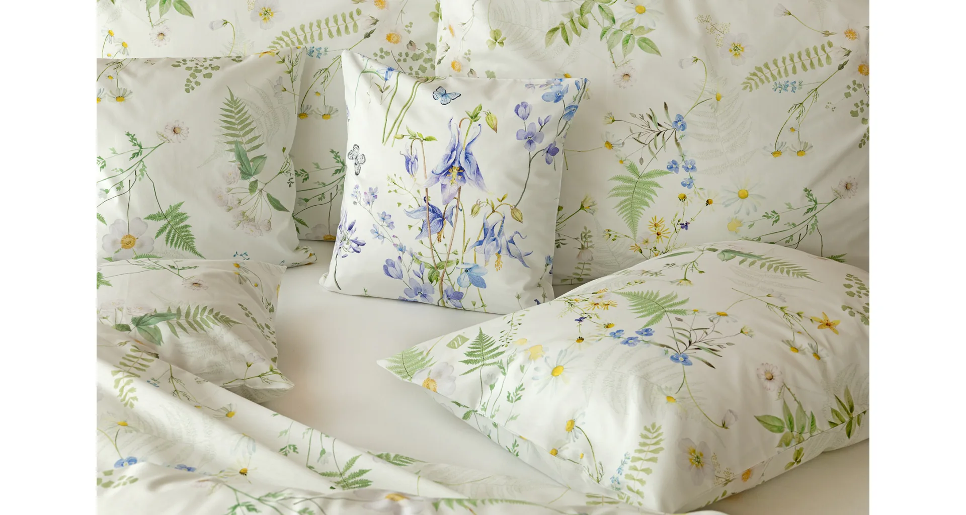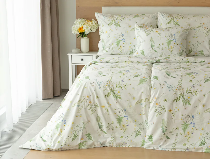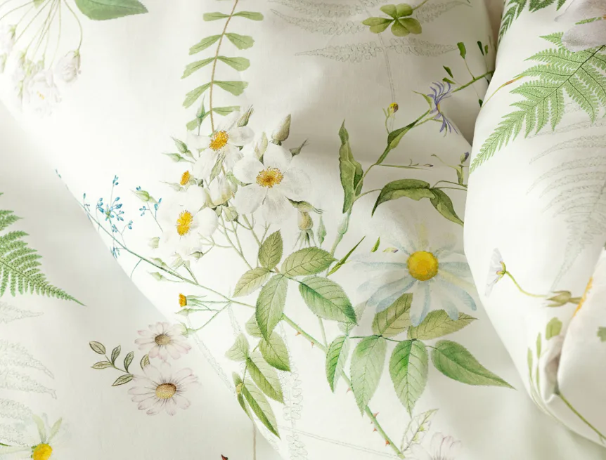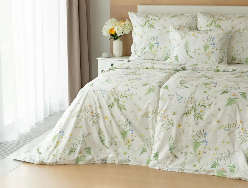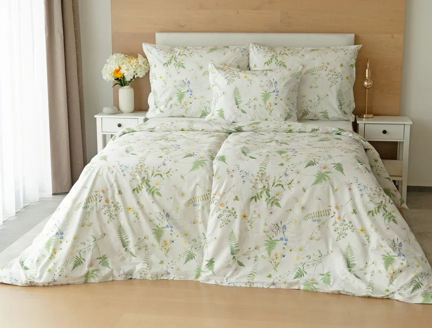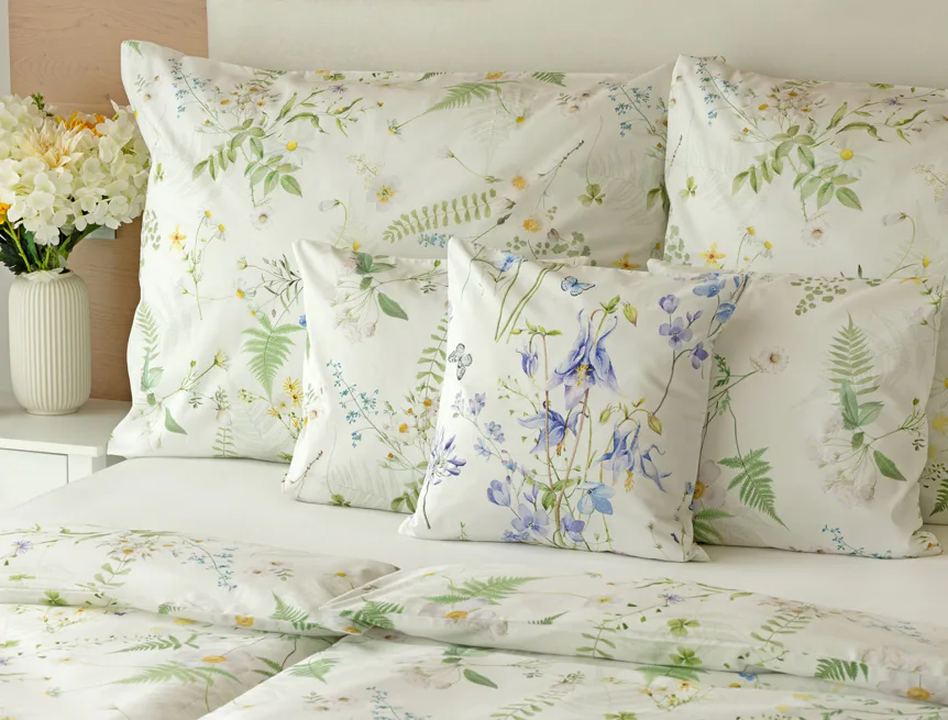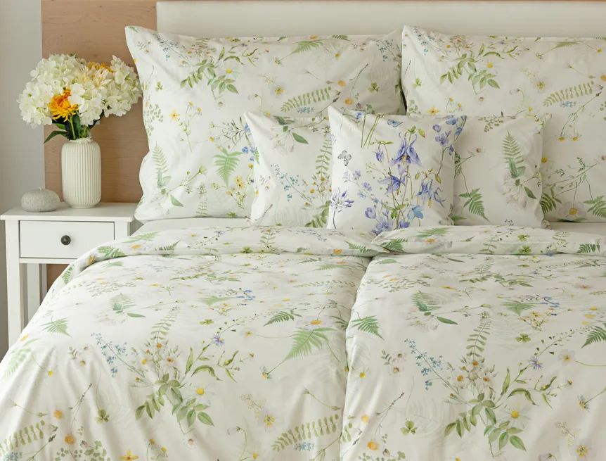 Něžný květinový motiv ložního povlečení Aria se zaslouží o vaši pozornost. Jemné luční kvítí různě propletené vyniká na bílém podkladu a působí nesmírně čistým dojmem. Dokonalá jarní svěžest. Díky nejmodernější digitální tiskové technologii vyniká každý kvítek v precizním detailu.
