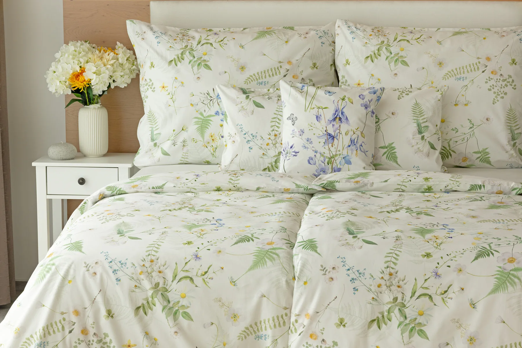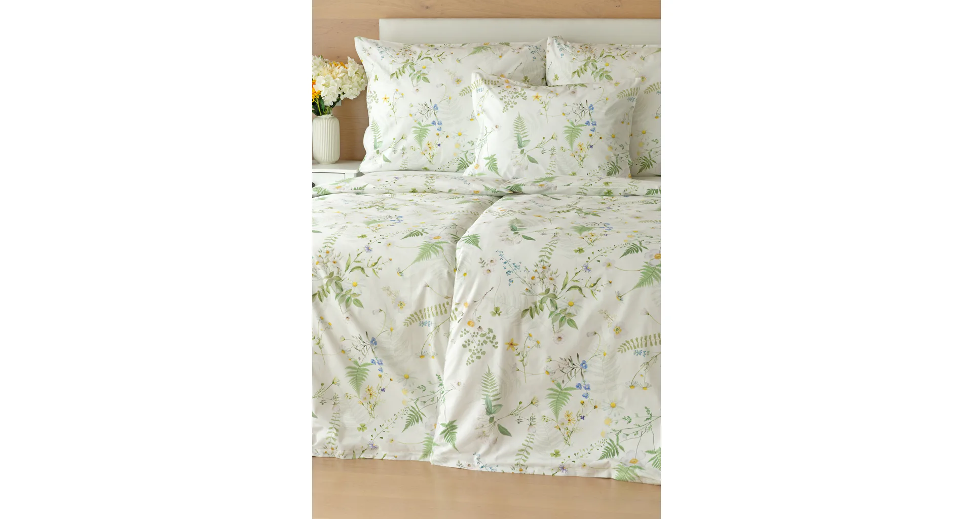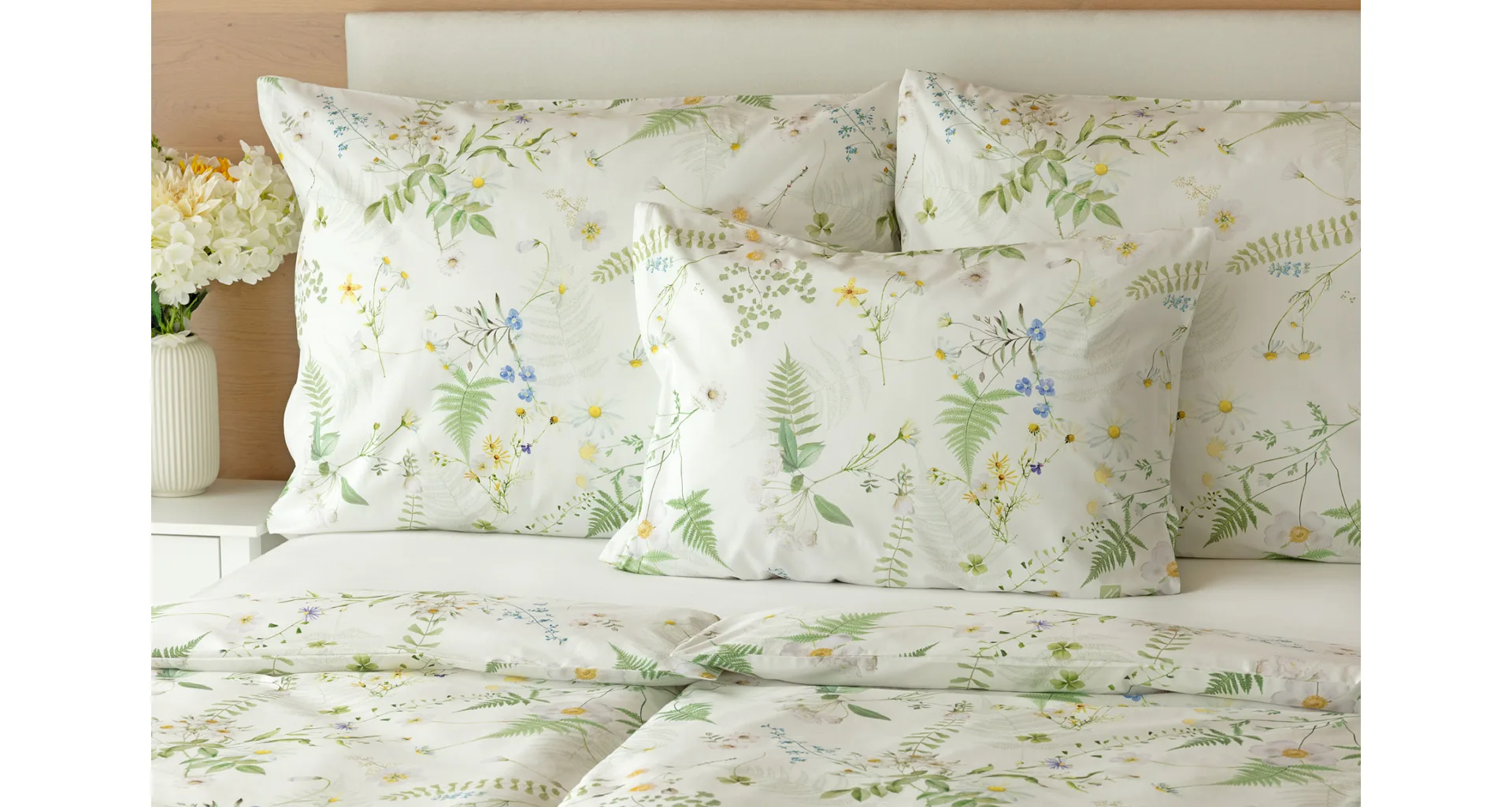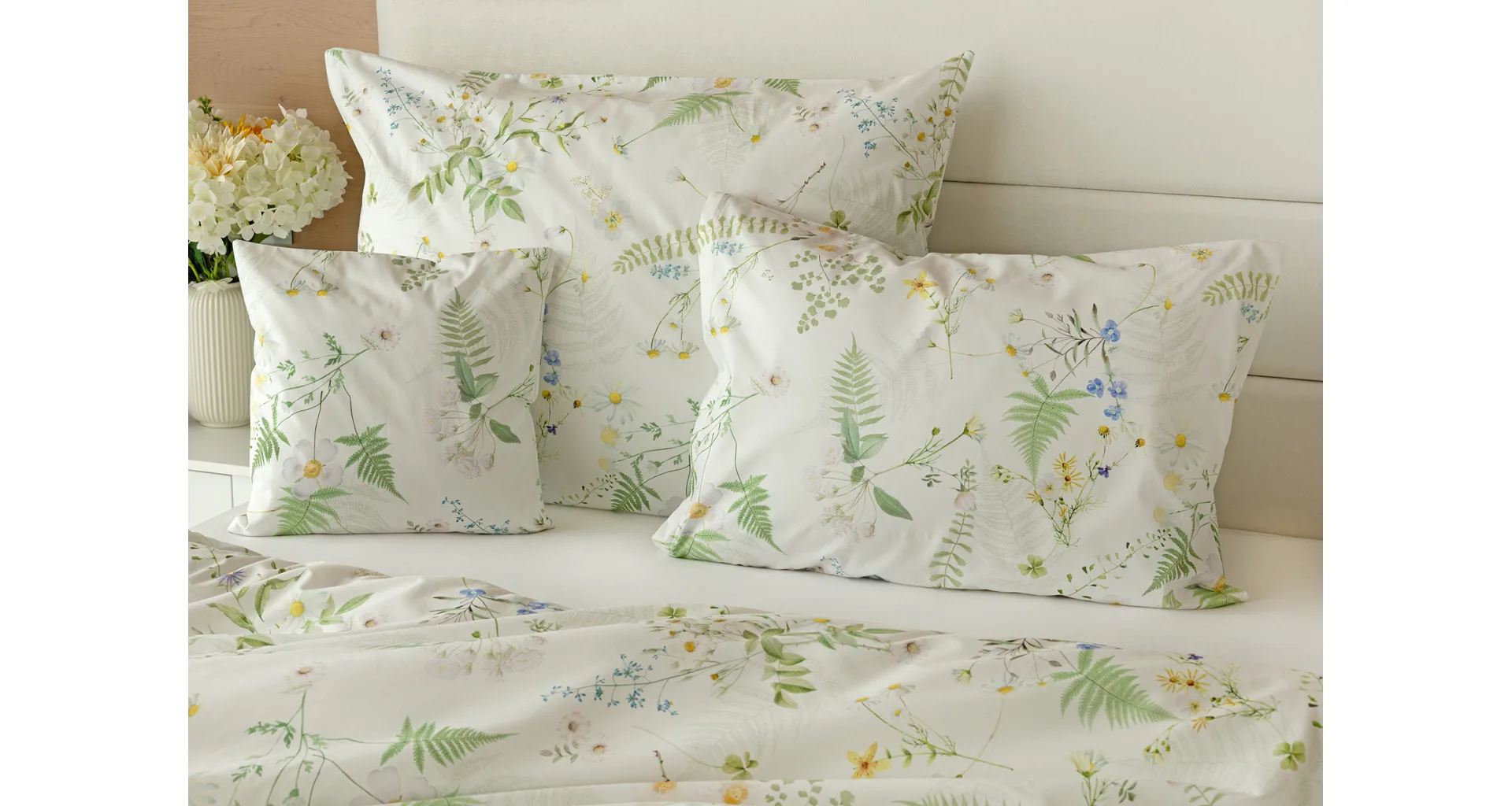 Něžný květinový motiv ložního povlečení Aria se zaslouží o vaši pozornost. Jemné luční kvítí různě propletené vyniká na bílém podkladu a působí nesmírně čistým dojmem. Dokonalá jarní svěžest. Díky nejmodernější digitální tiskové technologii vyniká každý kvítek v precizním detailu.