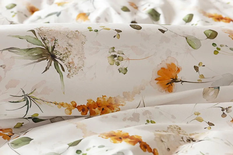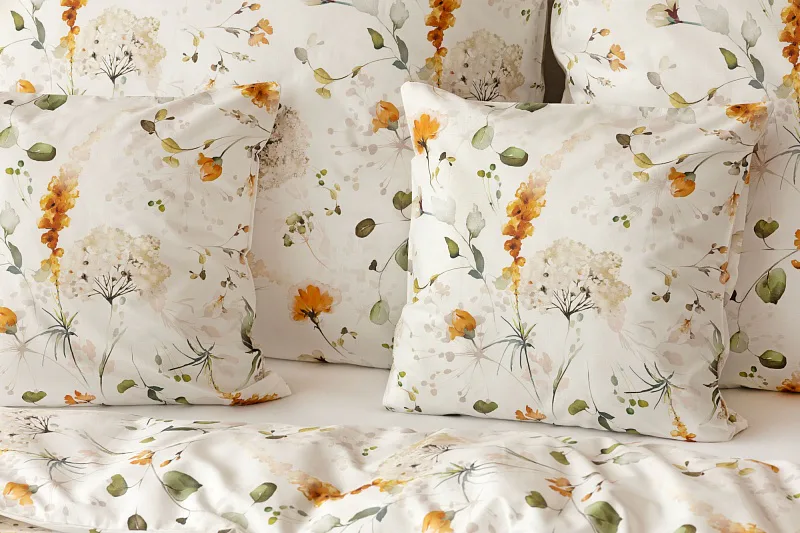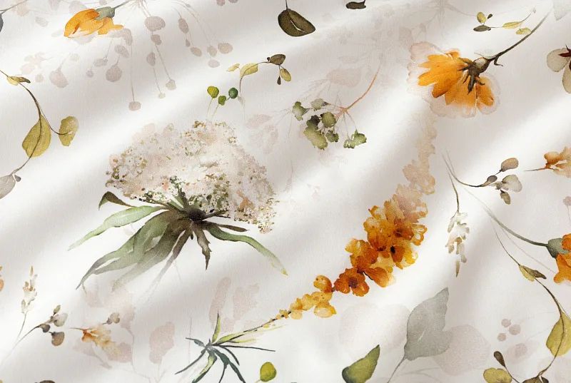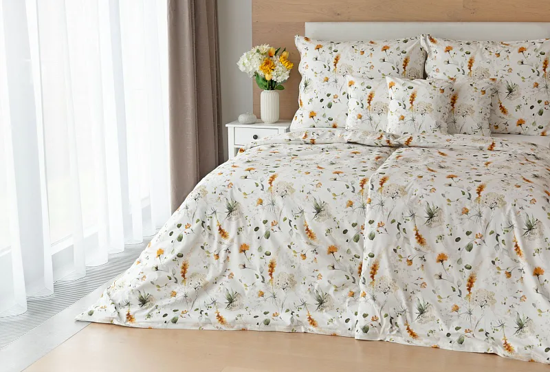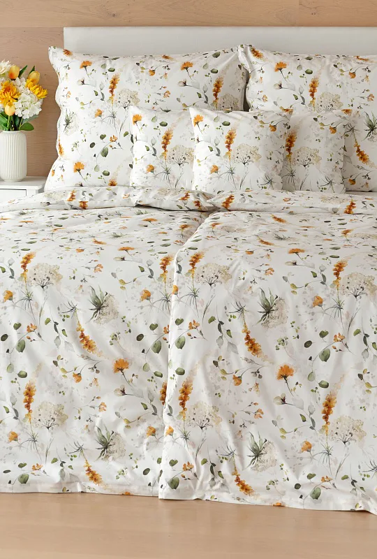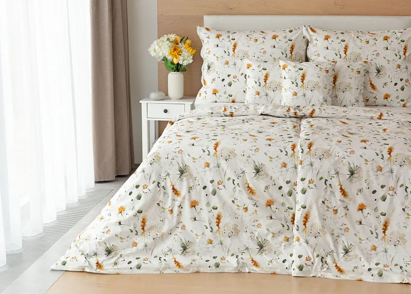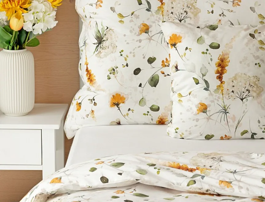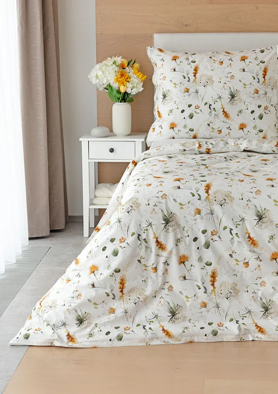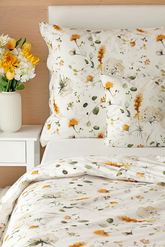 S něžným květinovým povlečením Arleen bude vaše ložnice dýchat jarní svěžestí v každé roční době. Jemný florální vzor v paletě medově žlutých a mátově zelených tónů vyniká na krémově bílém podkladu. Díky preciznímu digitálnímu tisku si vychutnáte každičký detail tištěné květinové malby.