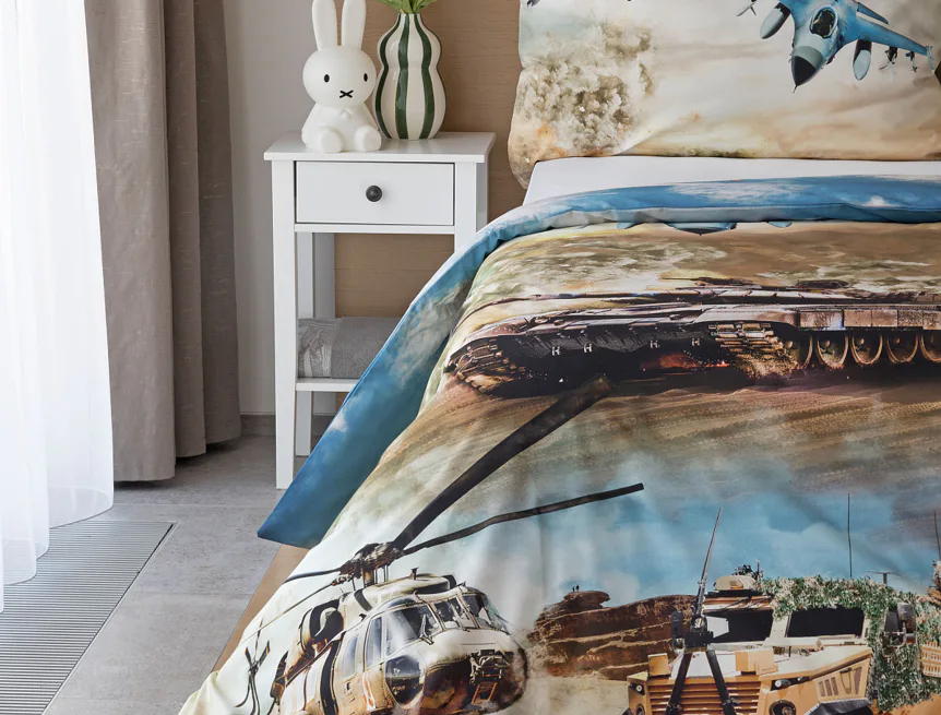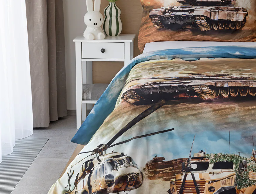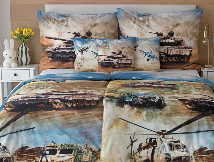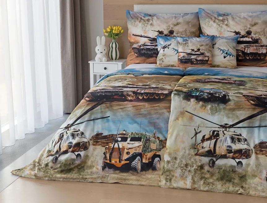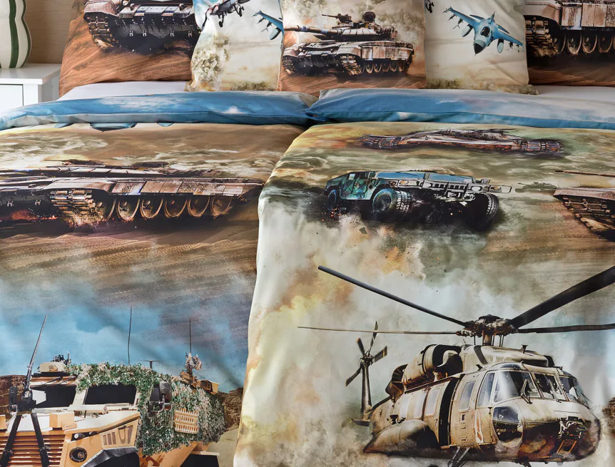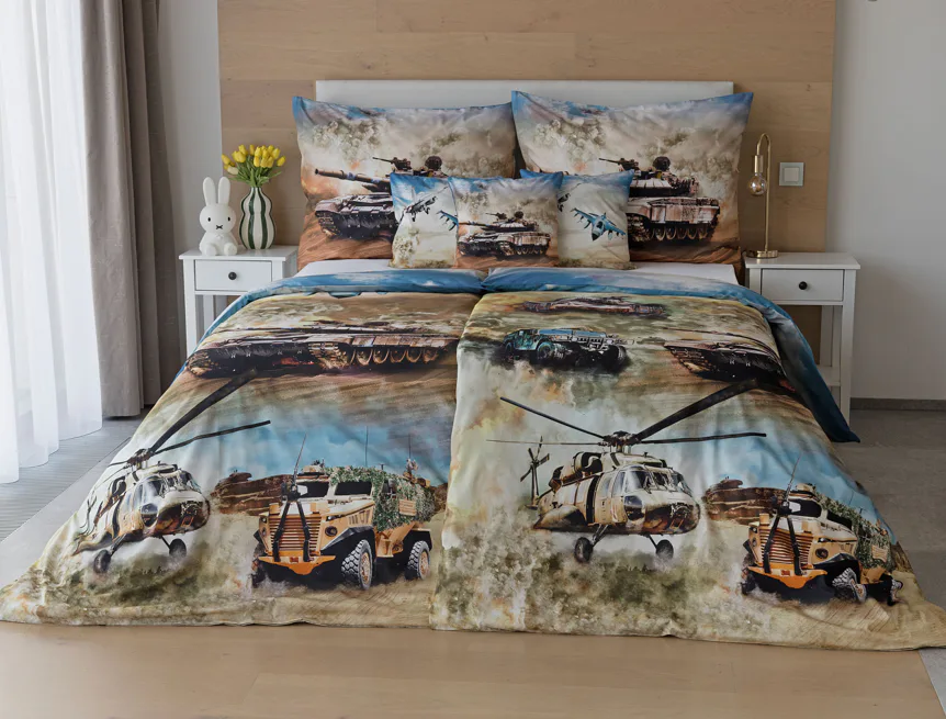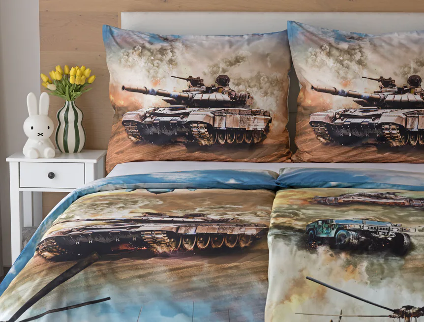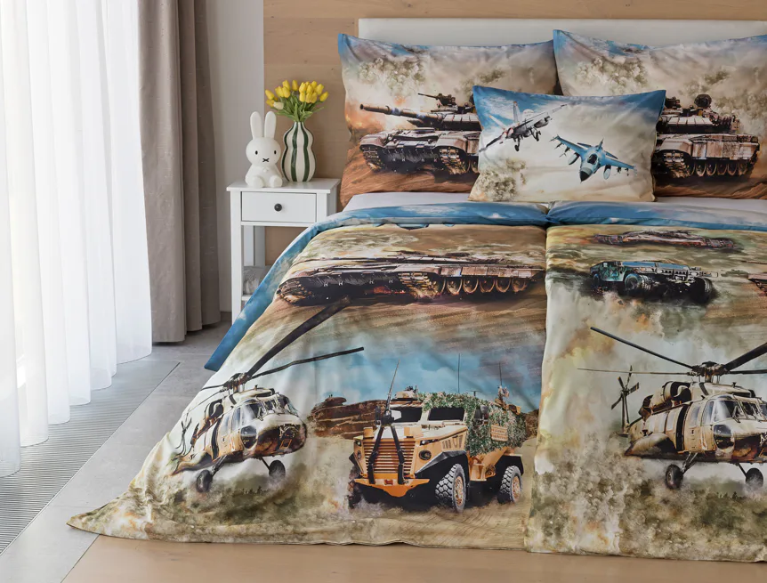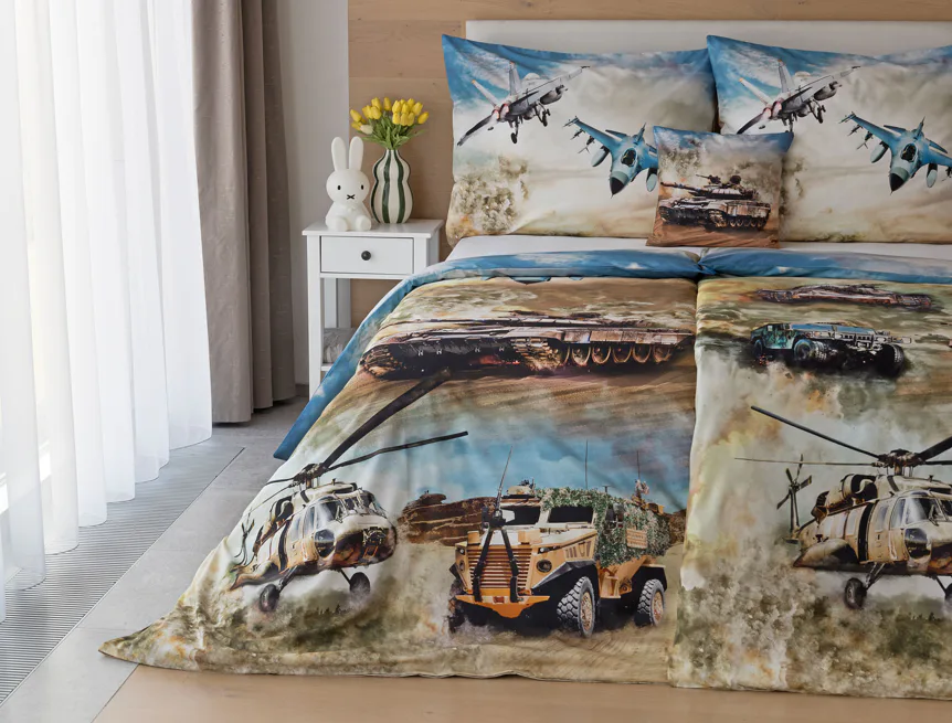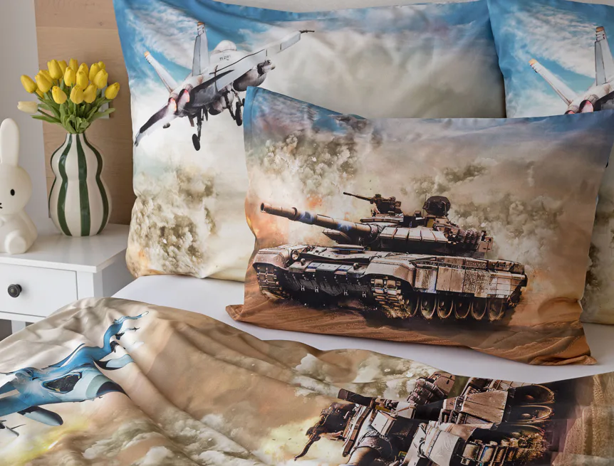 Proměňte dětský pokoj v akční bojiště plné dobrodružství! Stylové bavlněné povlečení Army s dynamickým motivem vojenské techniky nadchne všechny malé (i větší) fanoušky letadel, vrtulníků a terénních vozidel. Realistický digitální potisk vtáhne dítě přímo do děje a podpoří jeho fantazii i chuť k objevování.