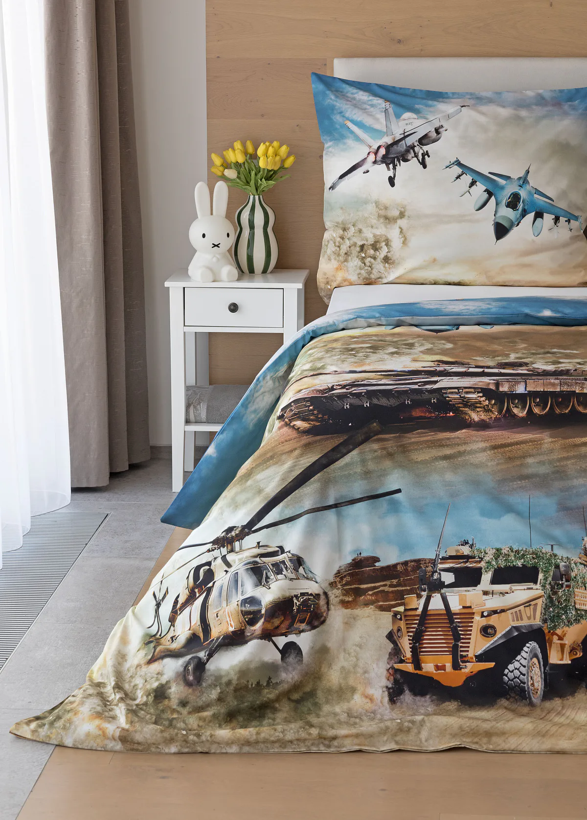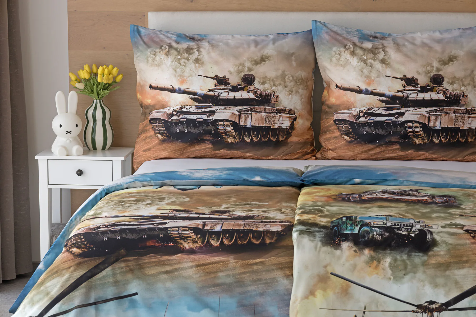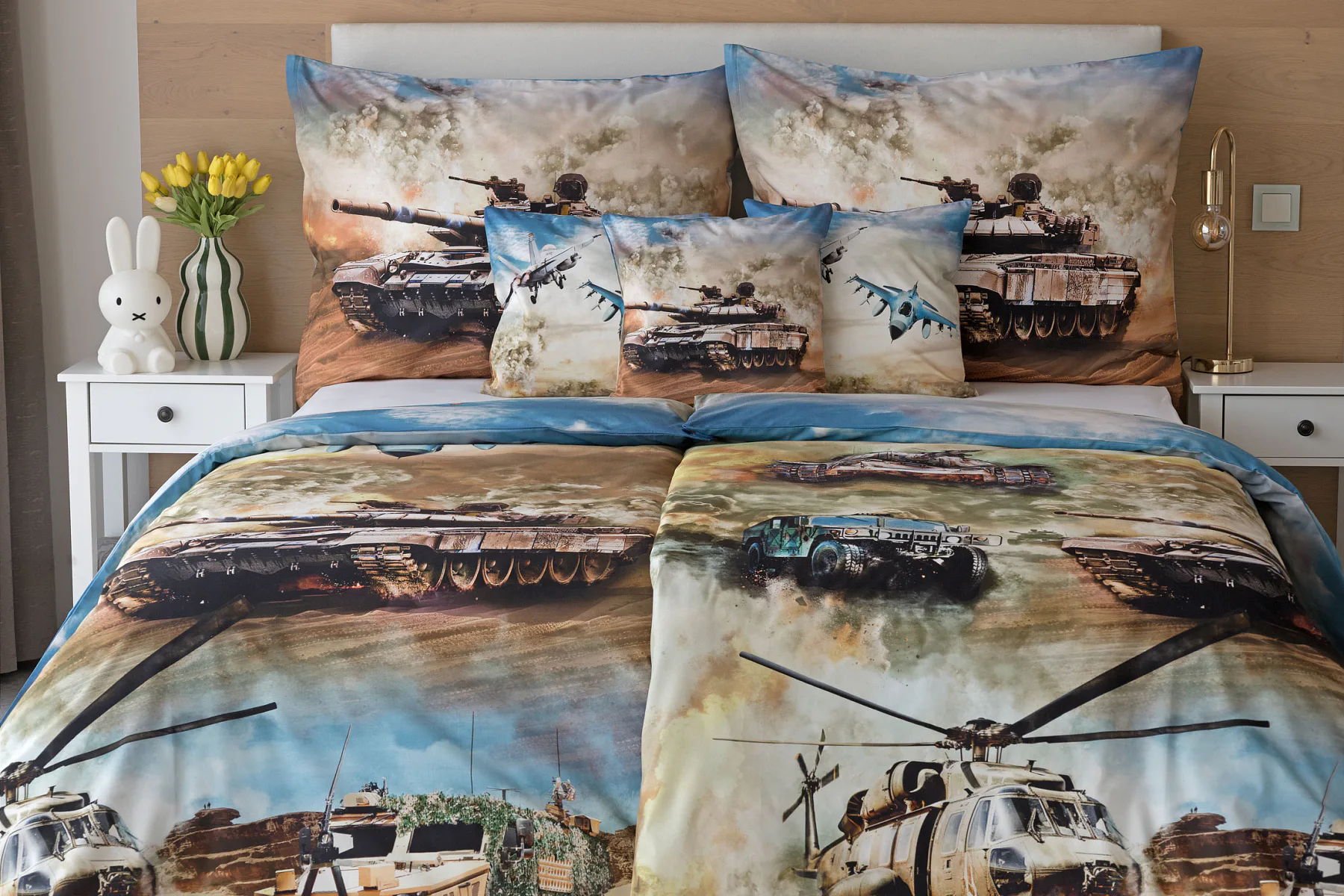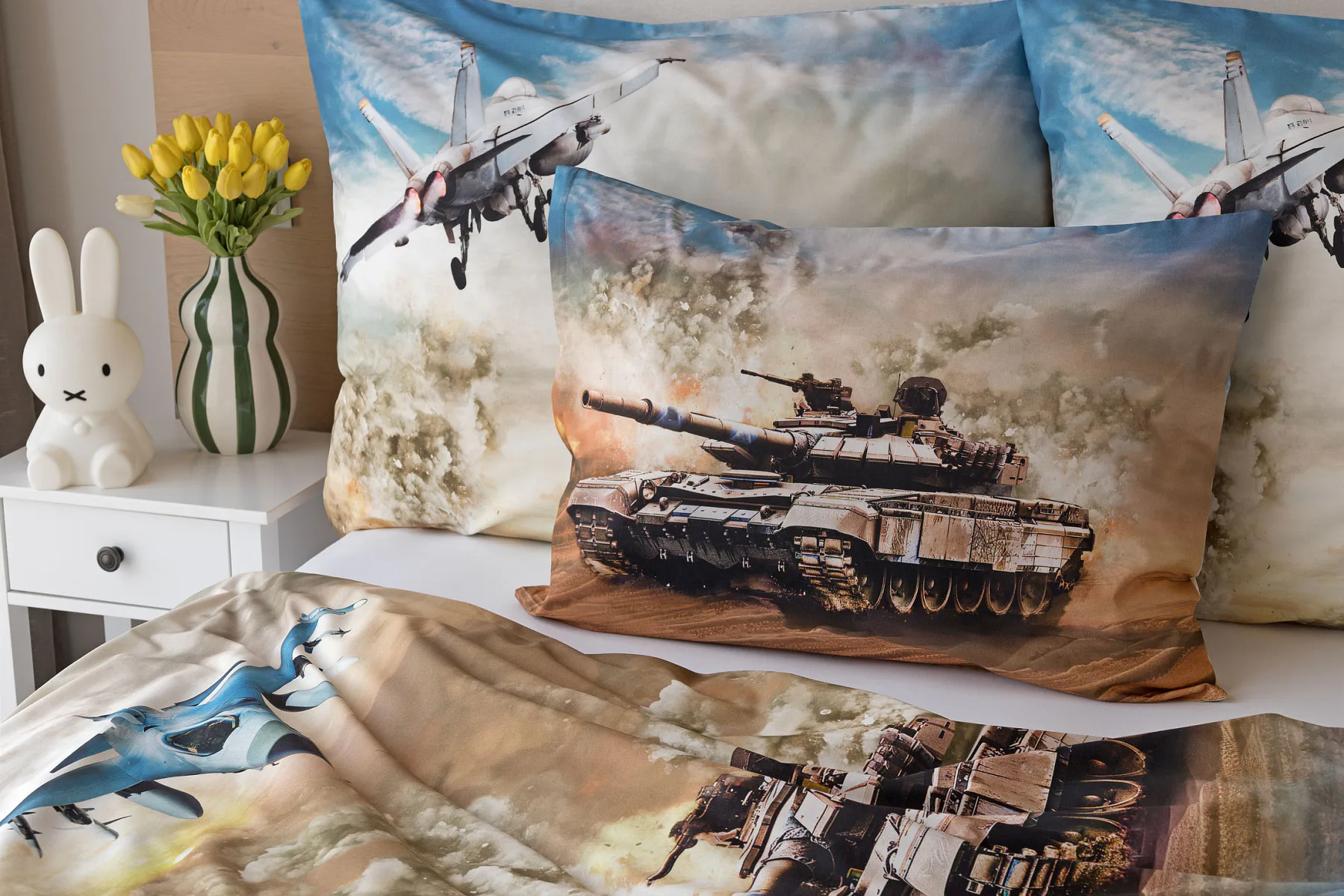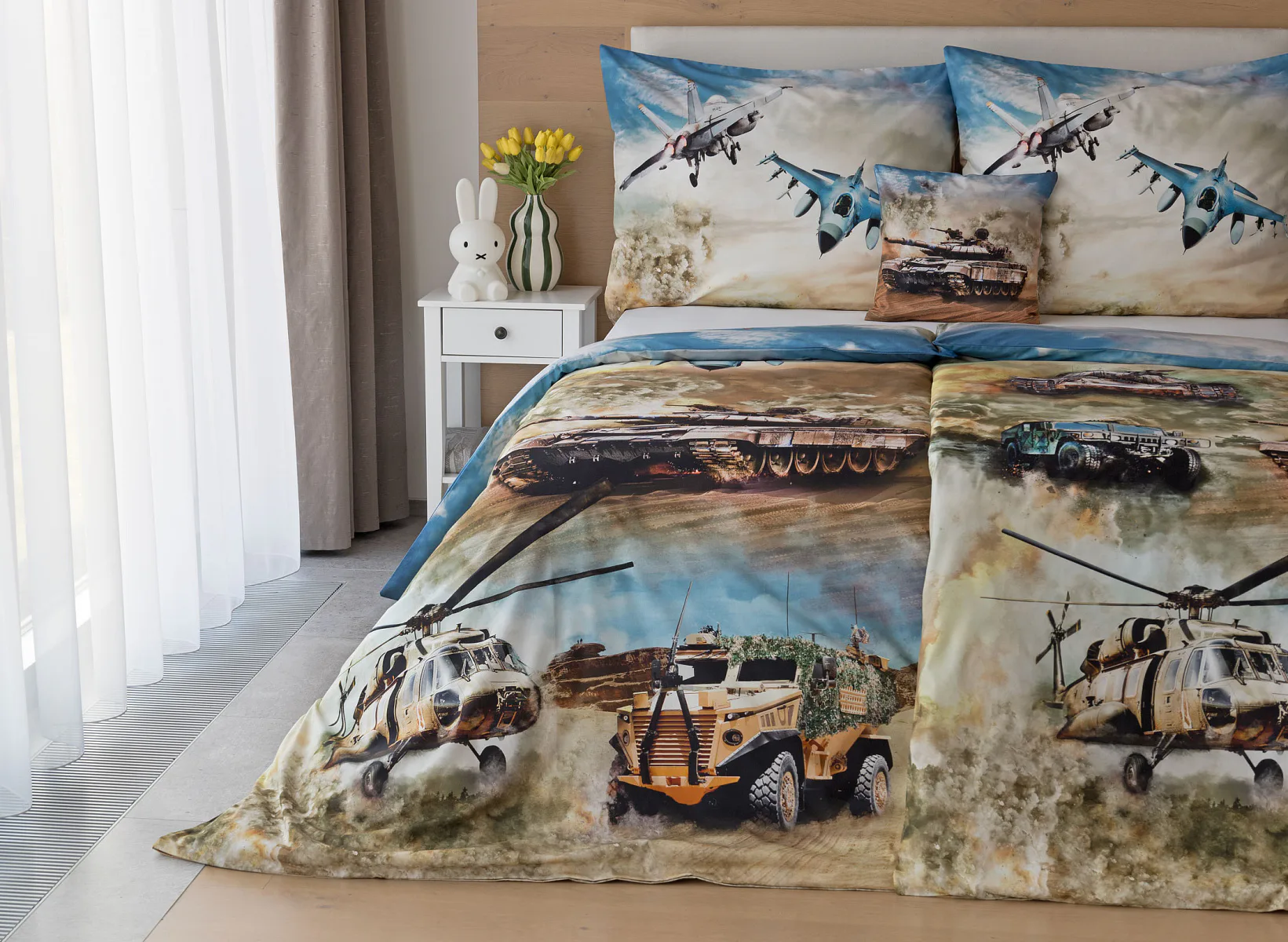 Proměňte dětský pokoj v akční bojiště plné dobrodružství! Stylové bavlněné povlečení Army s dynamickým motivem vojenské techniky nadchne všechny malé (i větší) fanoušky letadel, vrtulníků a terénních vozidel. Realistický digitální potisk vtáhne dítě přímo do děje a podpoří jeho fantazii i chuť k objevování.