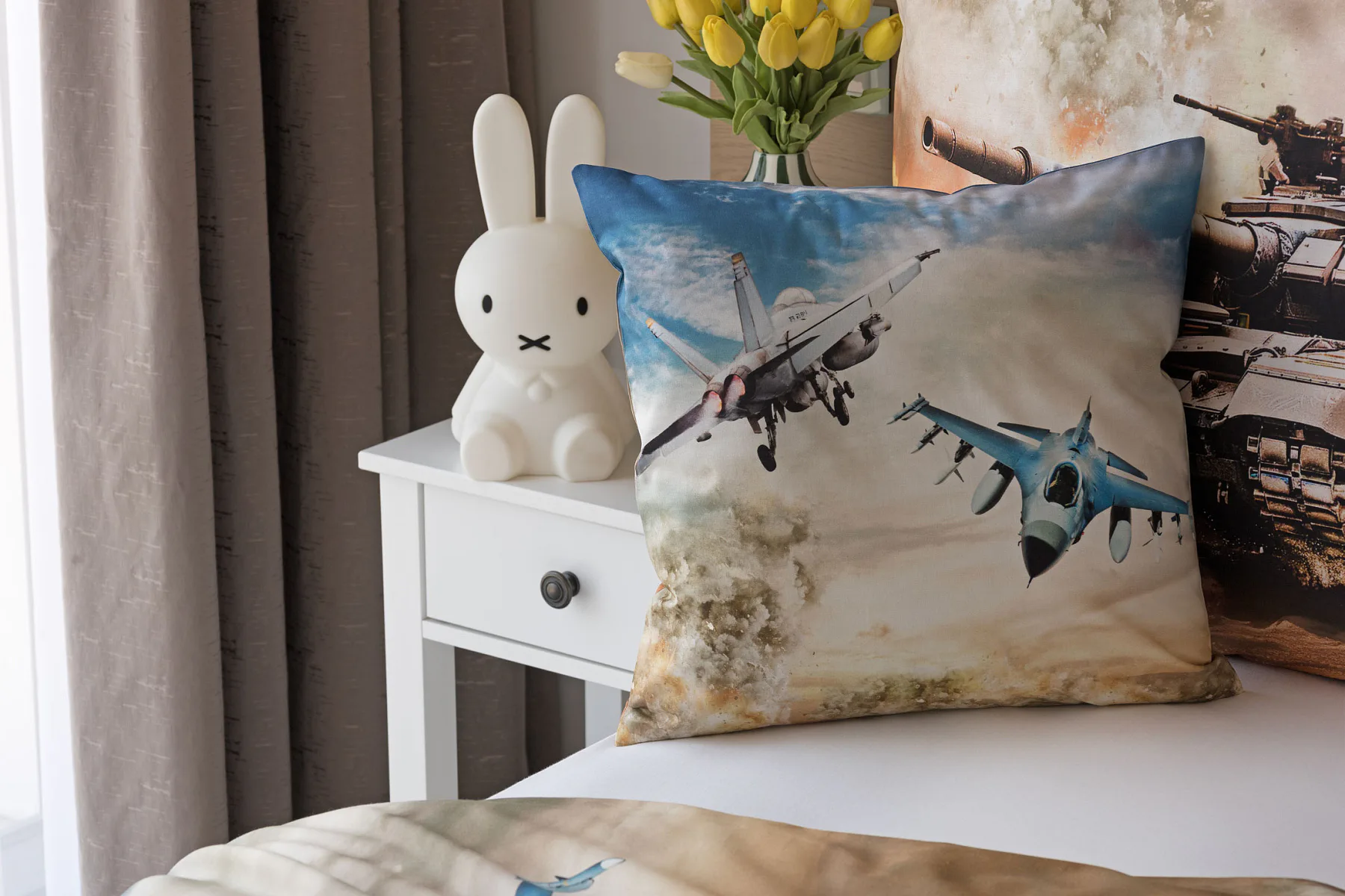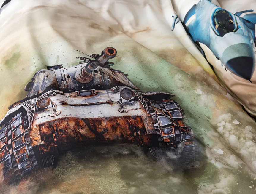 Povlak na přikrývku je z obou stran stejný. Povlak na polštář zachycuje z každé strany jiný motiv (vrchní stranu zdobí motiv stíhaček, spodní strana zachycuje motiv tanku). Na lícové straně polštáře je v pravém dolním rohu umístěno malé logo „M“. Povlečení je vyrobeno ze 100% bavlny a je opatřeno praktickým zipovým uzávěrem.