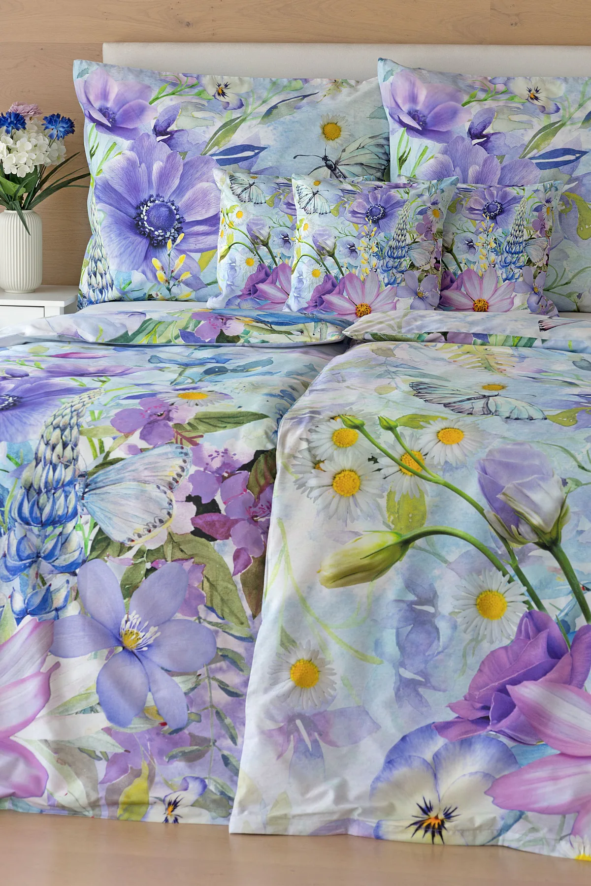 Kombinací akvarelové malby a fotoprvků vznikl poutavý květinový vzor povlečení Aurelia. Jemný bílomodrý podklad dává vyniknout květům v atraktivních fialových a růžových odstínech.