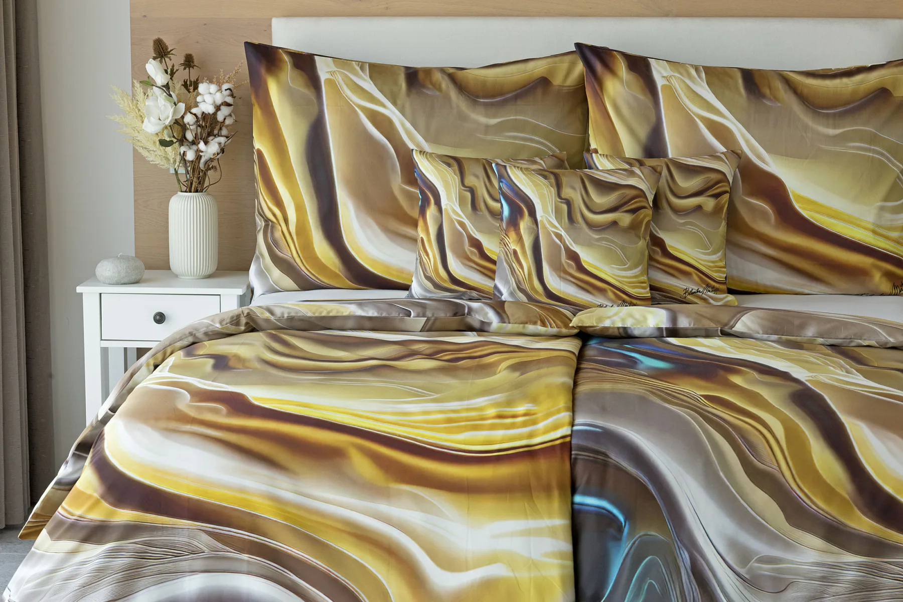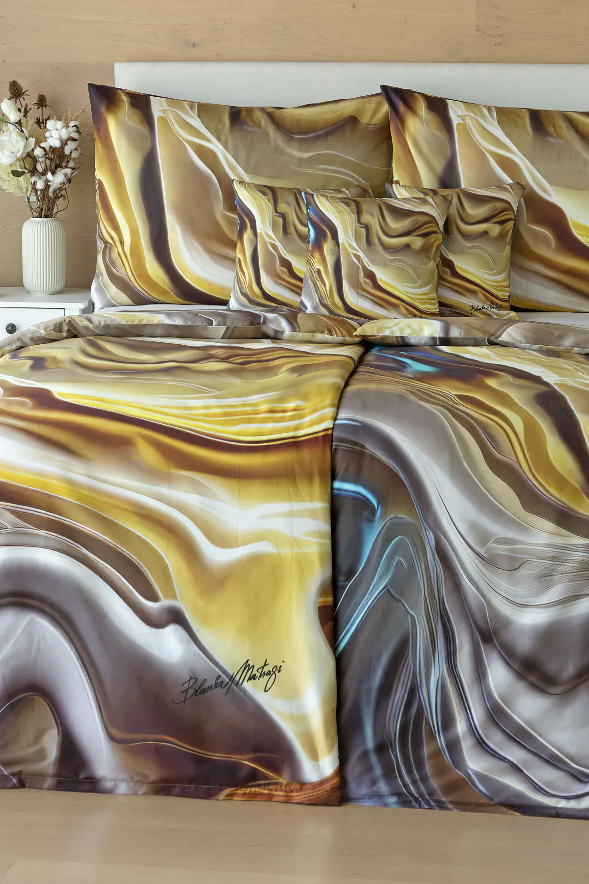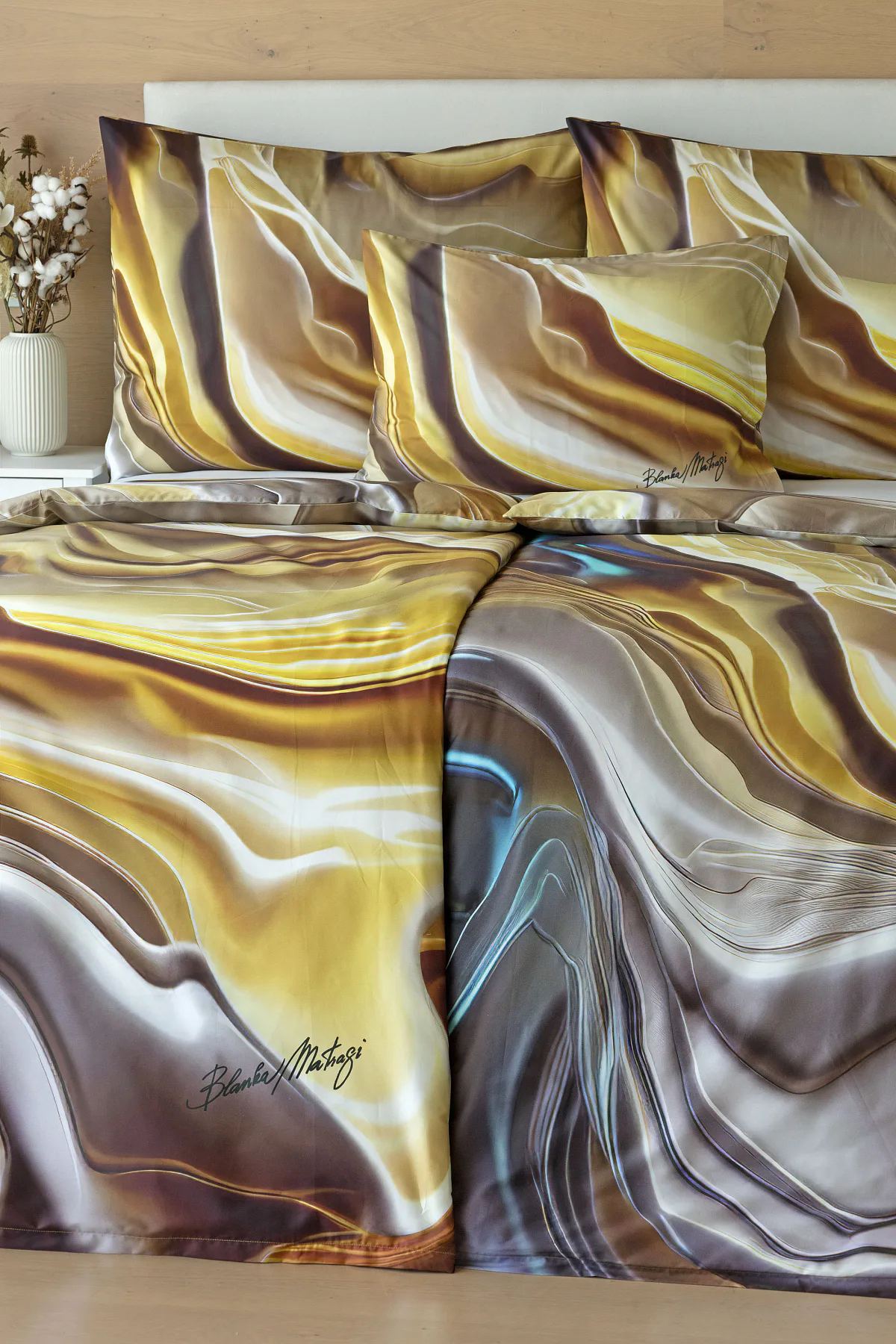Tento autorský digitálně zpracovaný motiv v sobě snoubí hřejivé odstíny zlaté, béžové a hnědé barvy. Nejmodernější digitální tisk zajišťuje věrný detail přesně dle autorčina záměru, motiv je z obou stran povlečení stejný.