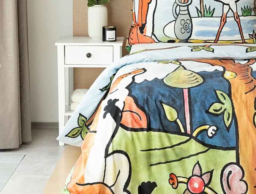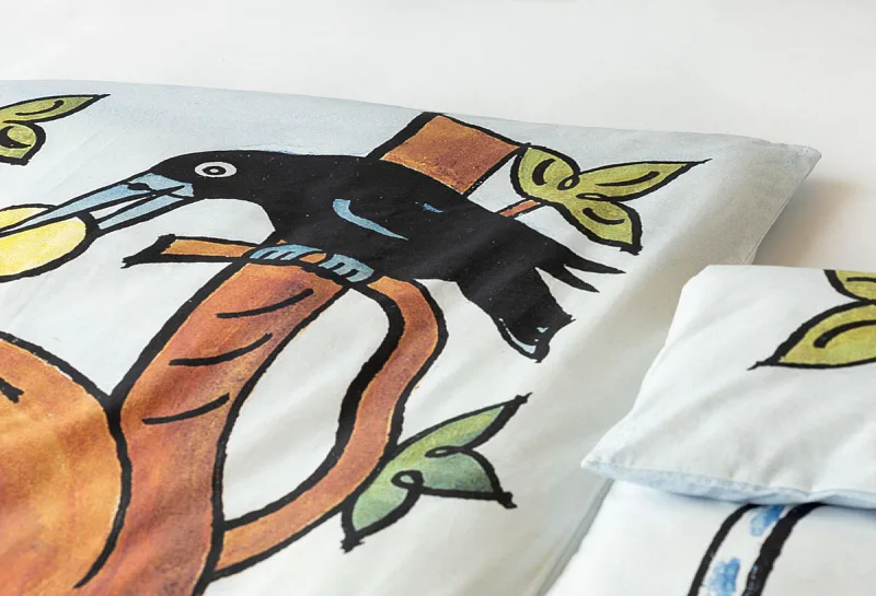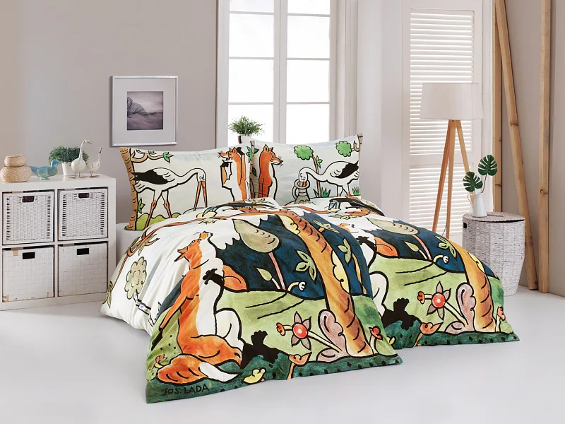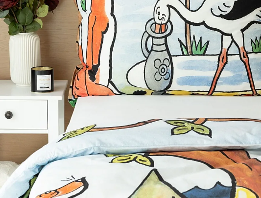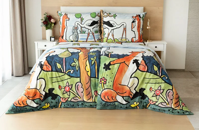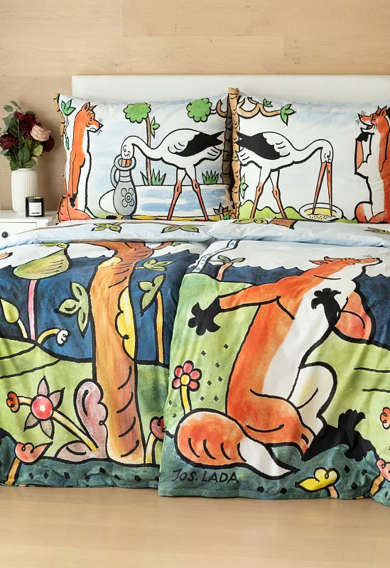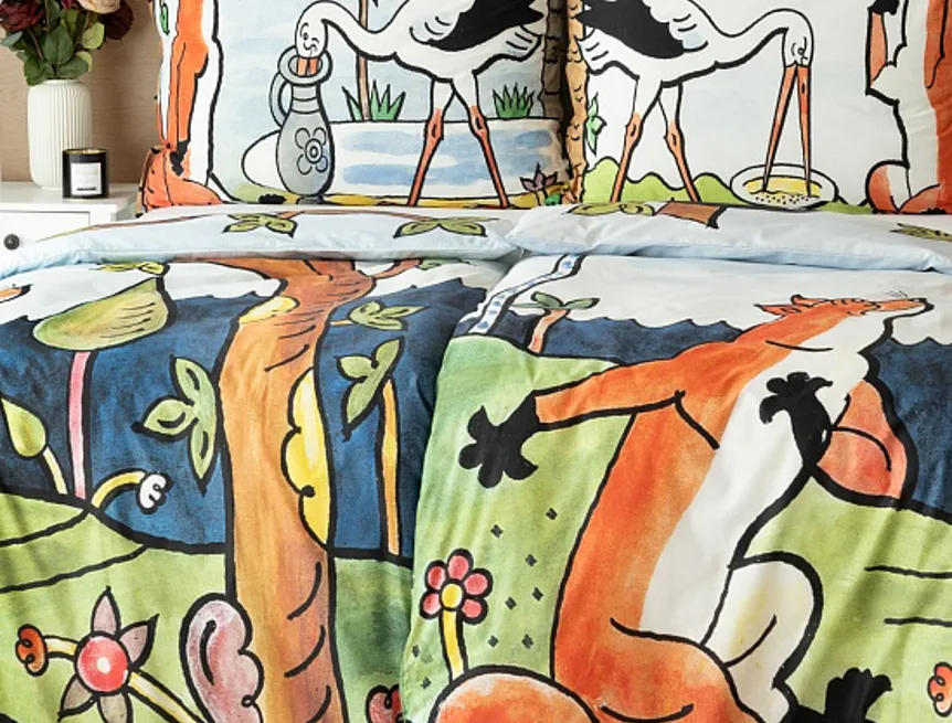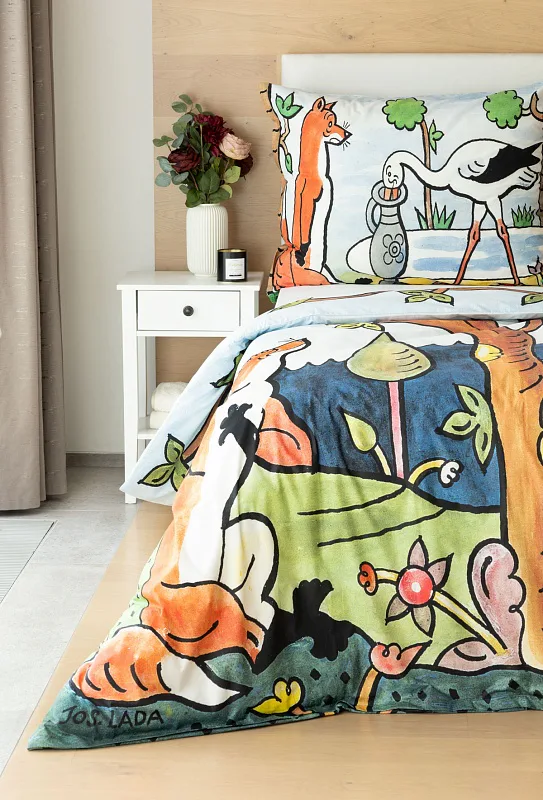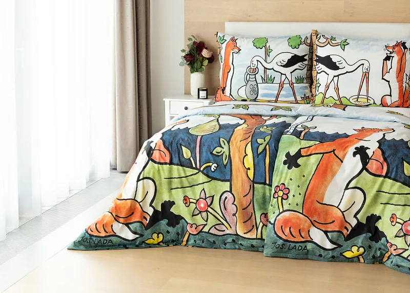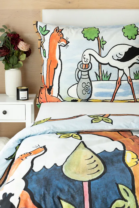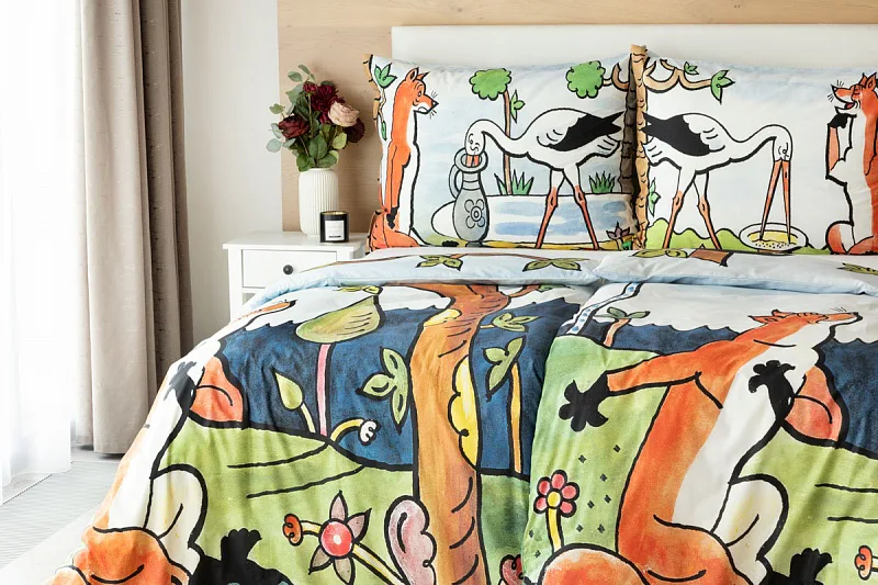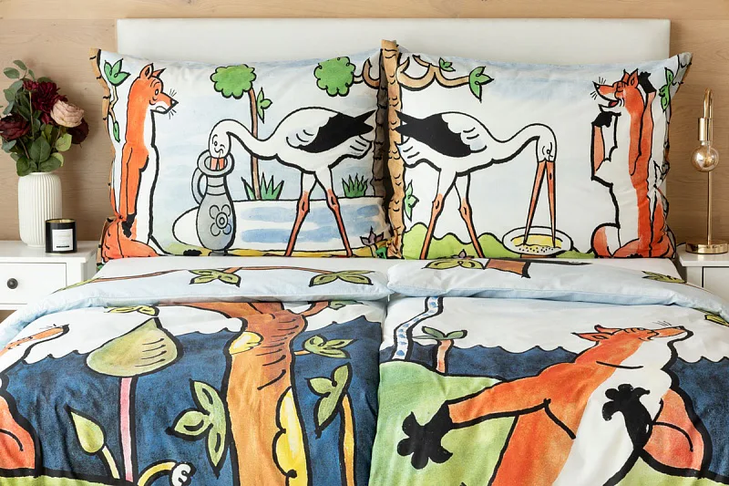Bavlněné povlečení Bajky přímo vybízí ke společnému večernímu čtení a vyprávění. Bajka O vráně, sýru a lišce je vyobrazena na povlaku cíchy, O lišce a čápu můžete vyprávět podle povlaku na polštář.