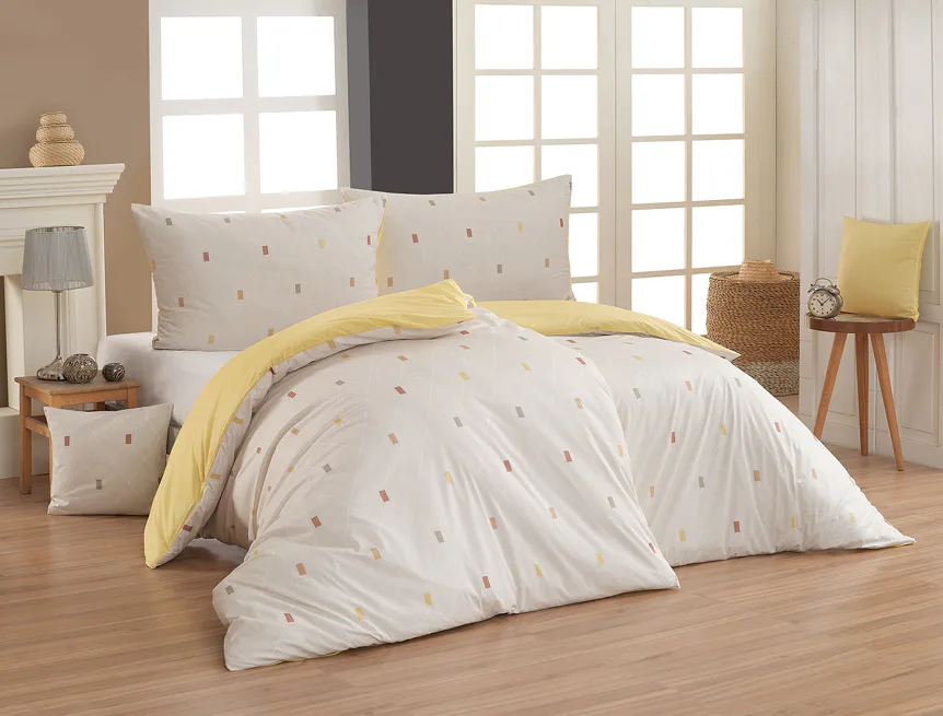 Užijte si hravé stlaní s bavlněným povlečením Bennett, které se stane decentní ozdobou každého interiéru, od moderní minimalistické ložnice až po ložnici v horské chaloupce. Vrchní stranu povlečení zdobí geometrický vzor se žlutými, cihlovými a béžovými obdélníčky na přírodním béžovém podkladu. Na spodní straně povlečení je zjednodušený geometrický vzor na vanilkově žlutém podkladu.