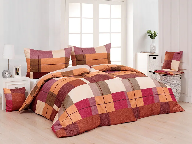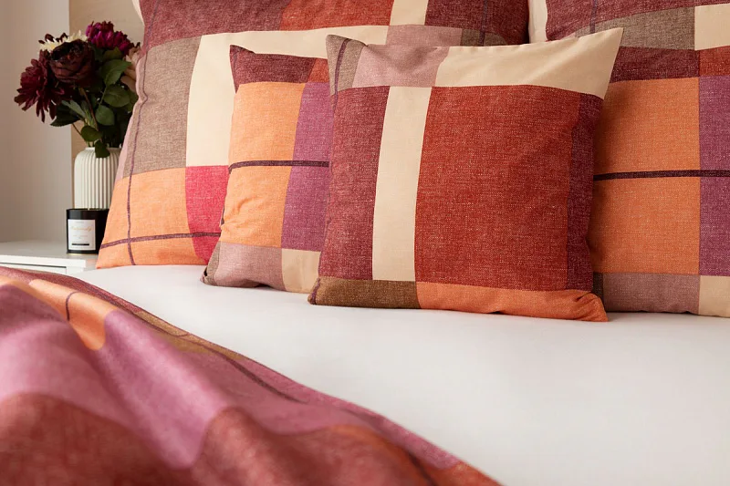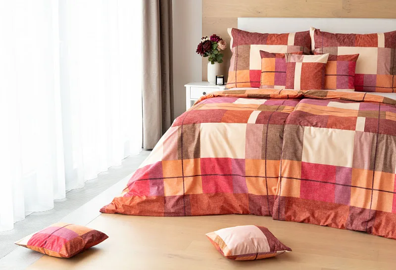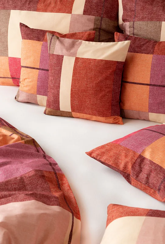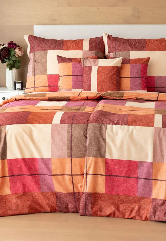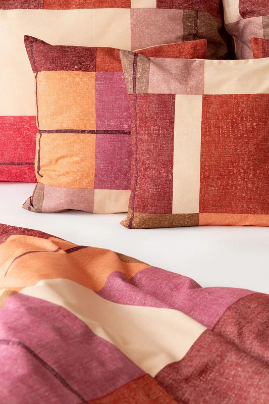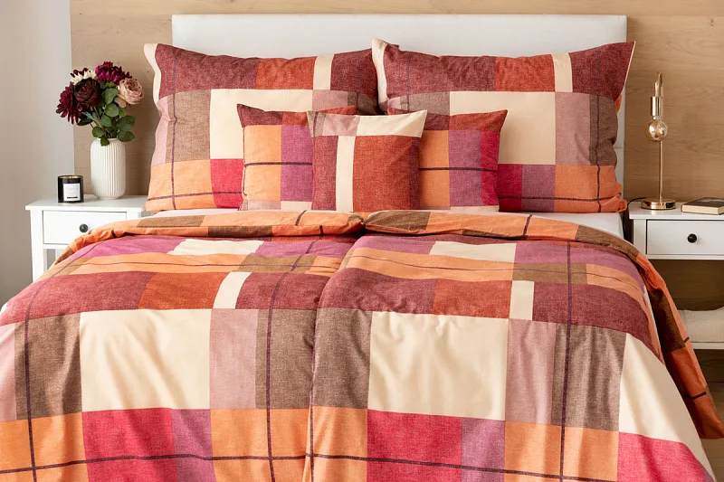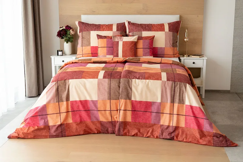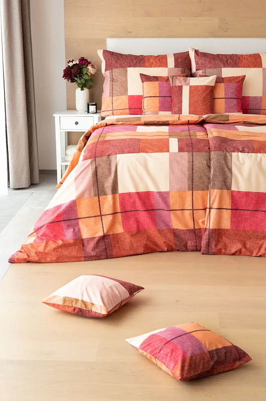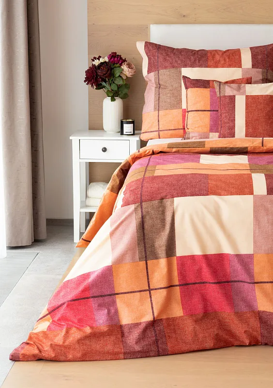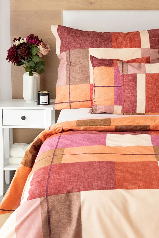 Bavlněné ložní povlečení Berkely rozzáří vaši ložnici. Kostkovaná koláž s přiznanou tečkovanou strukturou přináší spojení hřejivých barev, od světle meruňkové, přes odstíny oranžové a terakoty, až po vínově červenou. Vzhledem k výrazným barvám a okázalému vzoru je povlečení Berkely vhodné zejména do světlých, minimalistických interiérů.