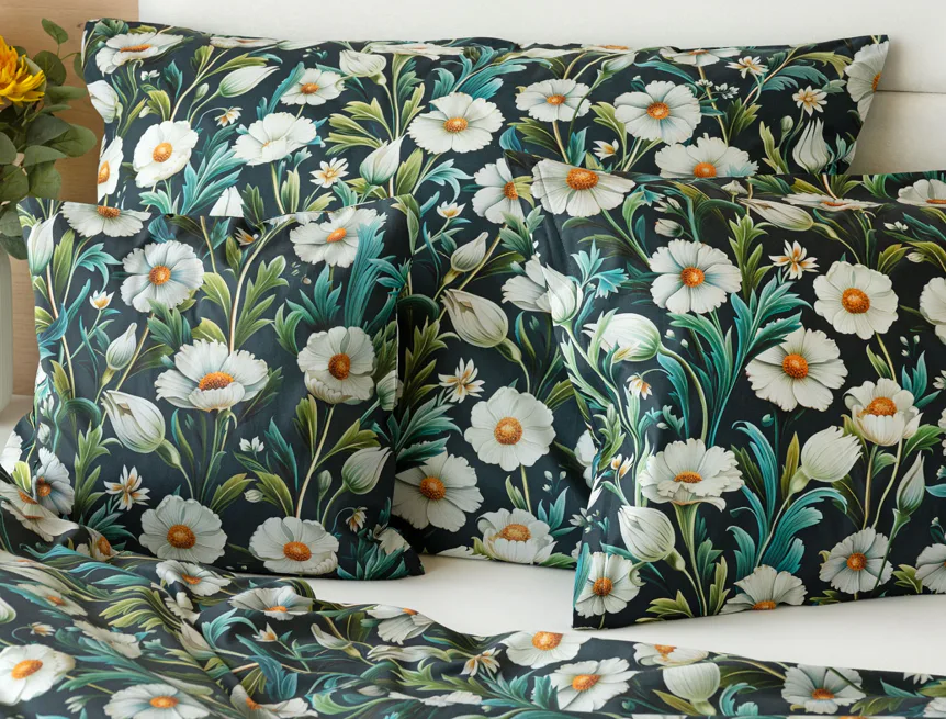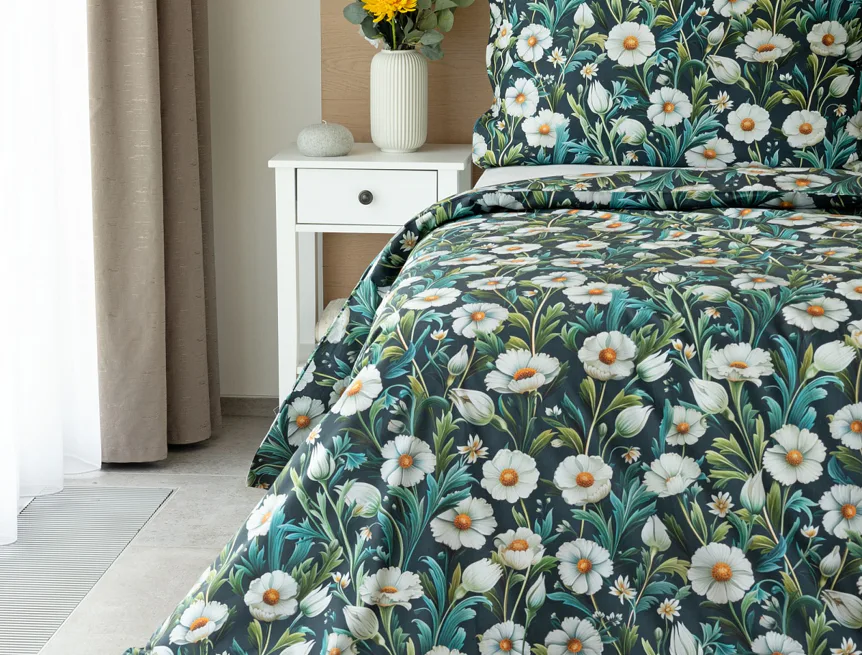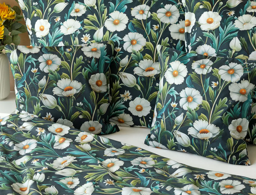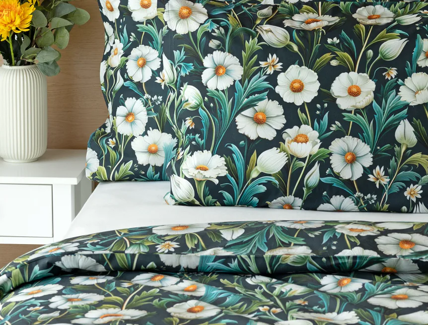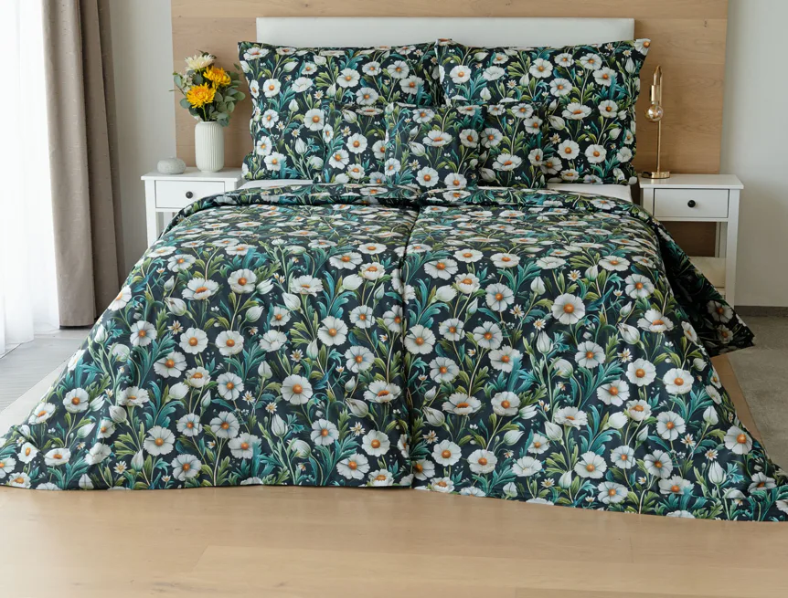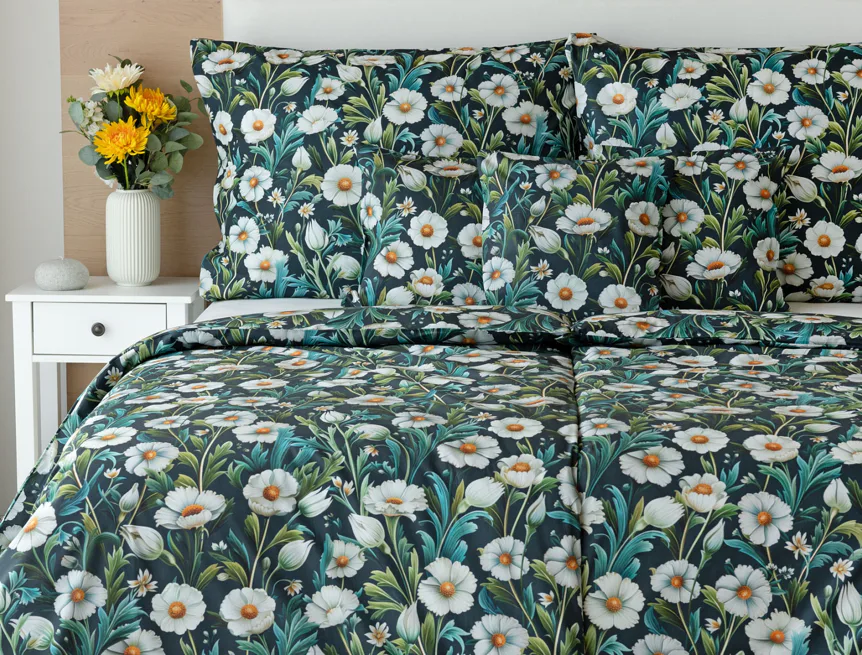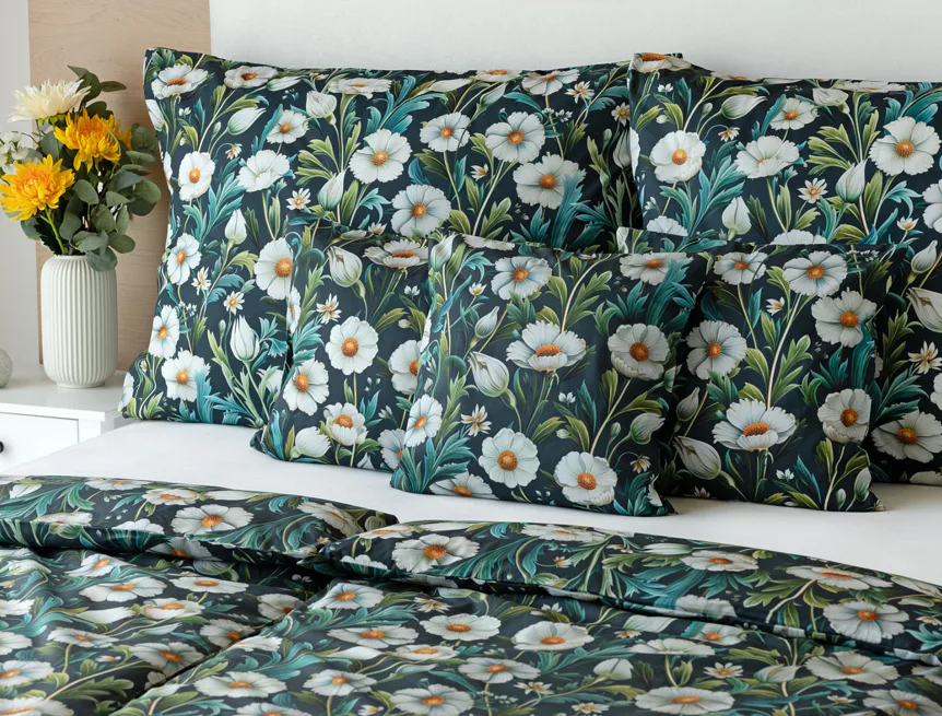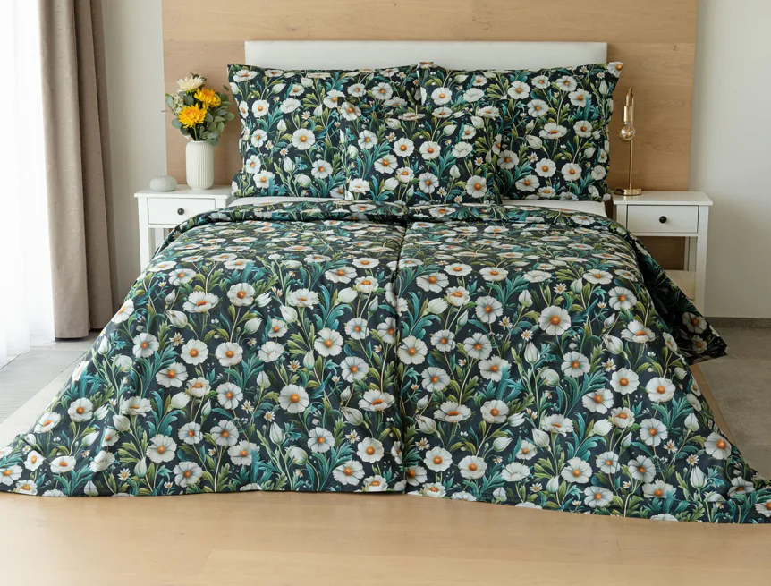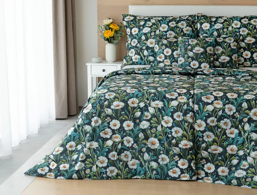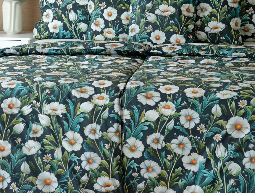Vychutnejte si uklidňující harmonii ložního povlečení Bonnie. V okouzlujícím květinovém vzoru se snoubí pestrá paleta zelených tónů, které vynikají mezi drobnými kvítky na temně modrozeleném podkladu. Díky nejmodernější digitální tiskové technologii se povlečení pyšní precizním detailem potisku.