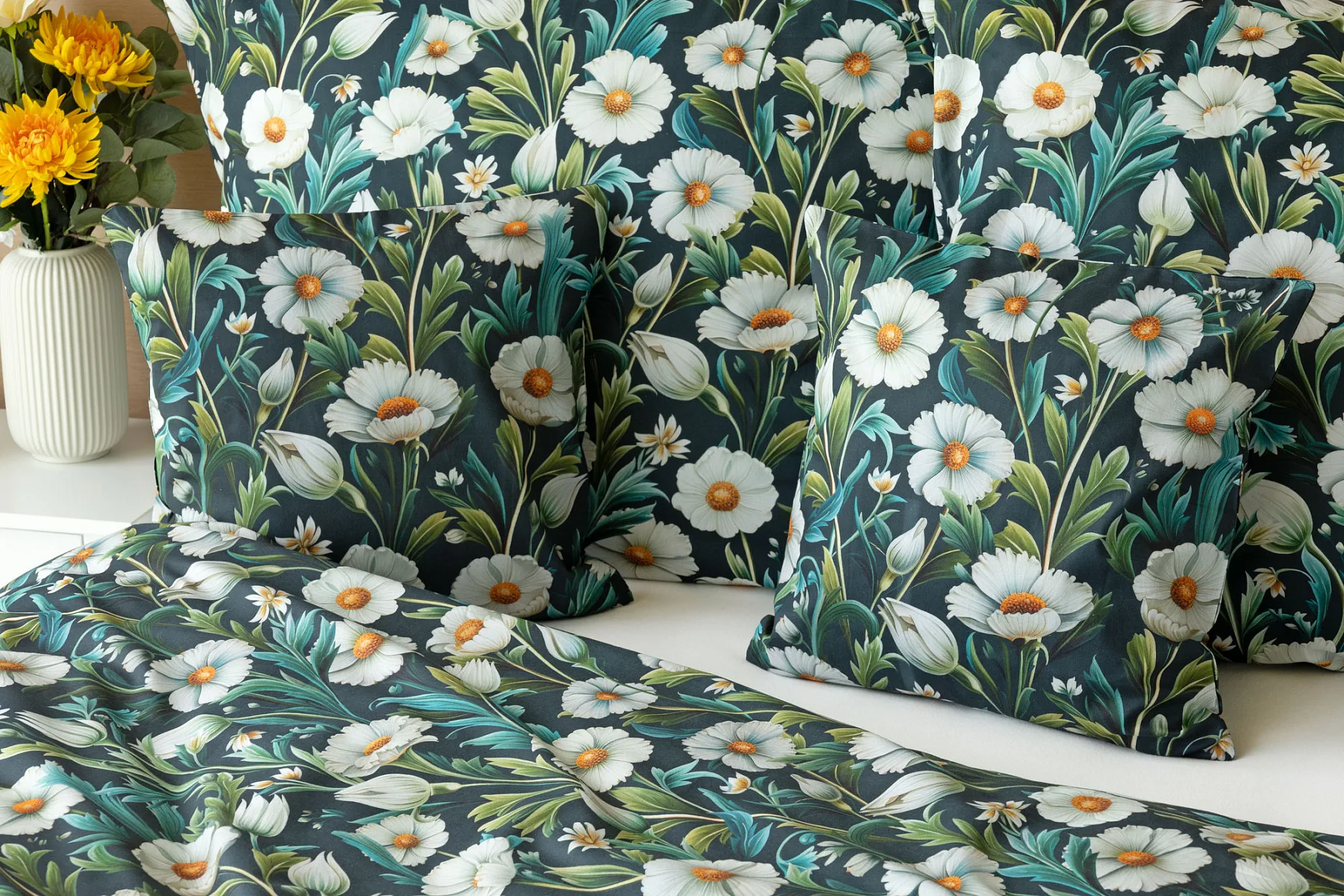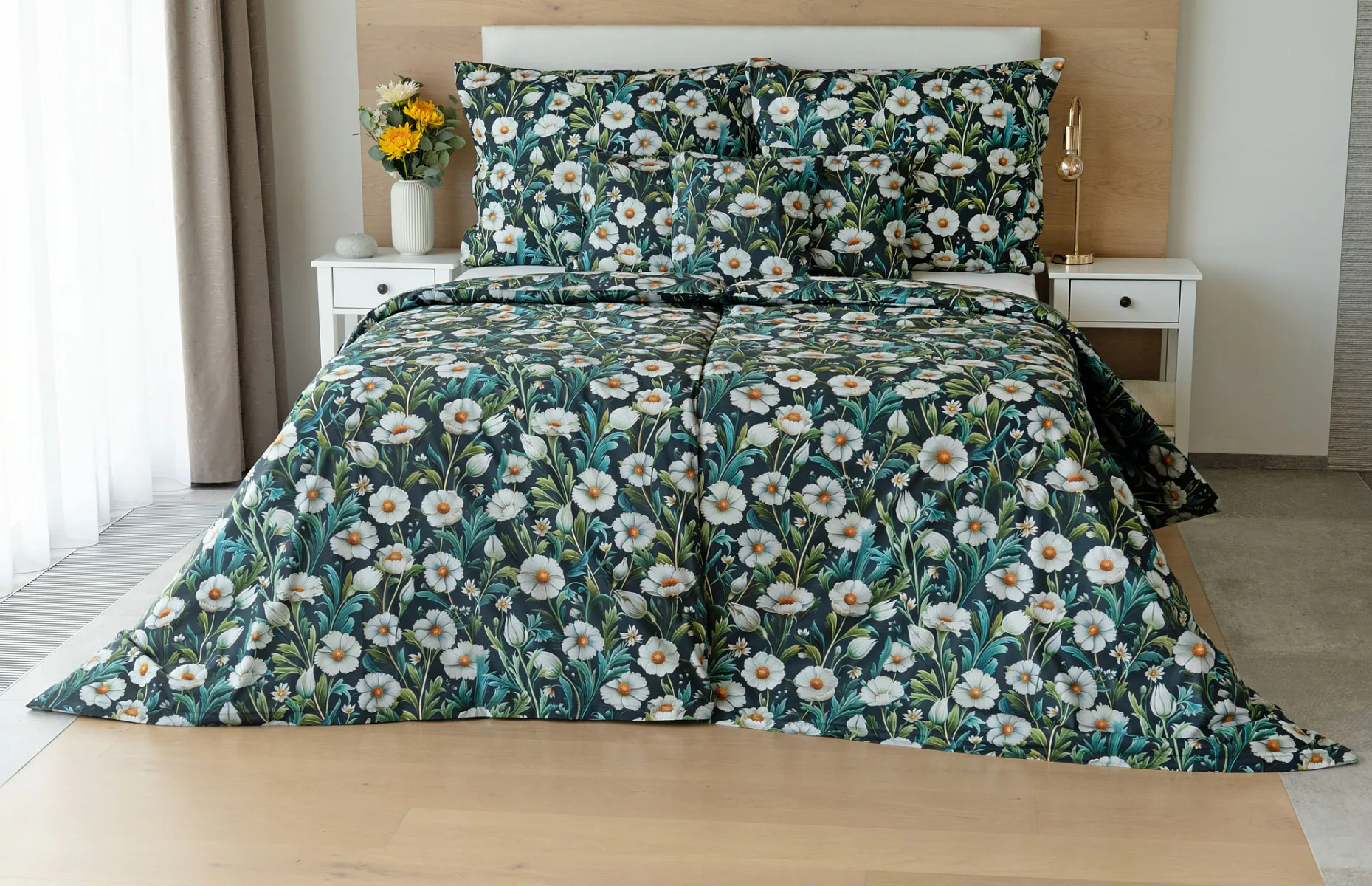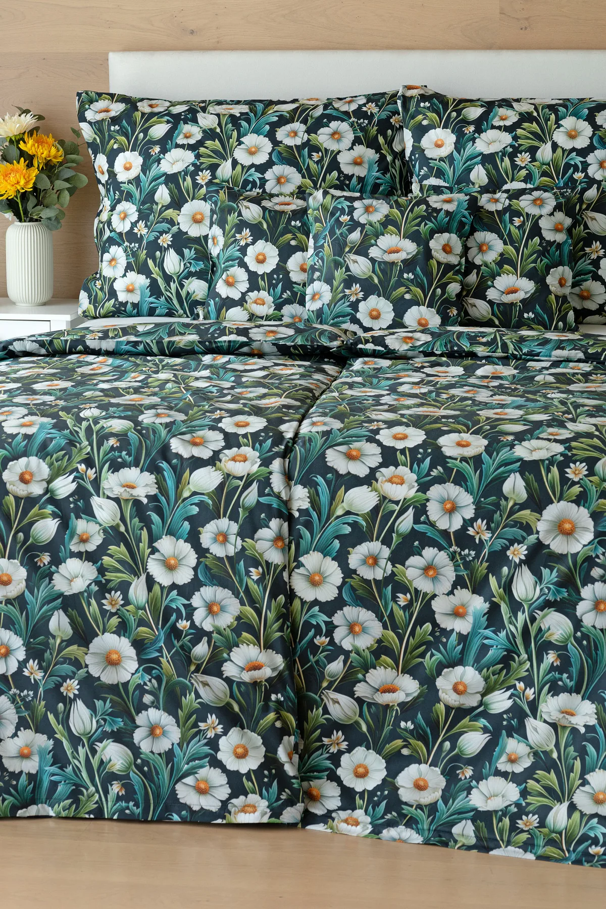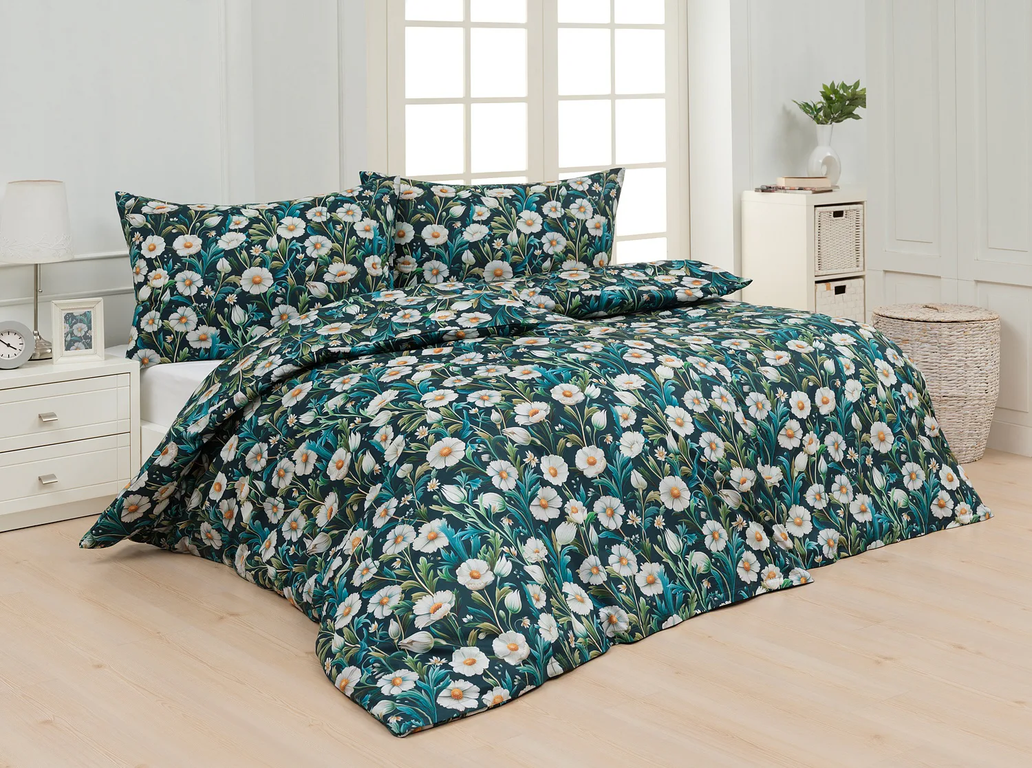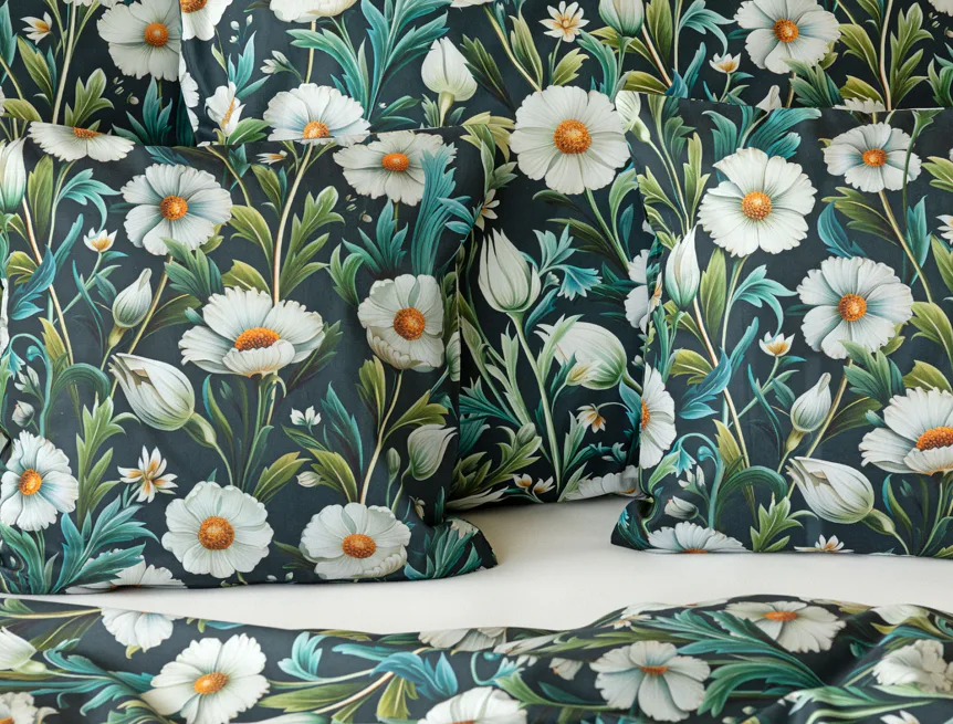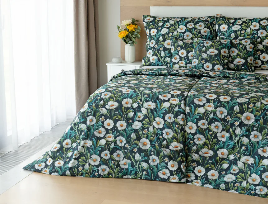Vychutnejte si uklidňující harmonii ložního povlečení Bonnie. V okouzlujícím květinovém vzoru se snoubí pestrá paleta zelených tónů, které vynikají mezi drobnými kvítky na temně modrozeleném podkladu. Díky nejmodernější digitální tiskové technologii se povlečení pyšní precizním detailem potisku.