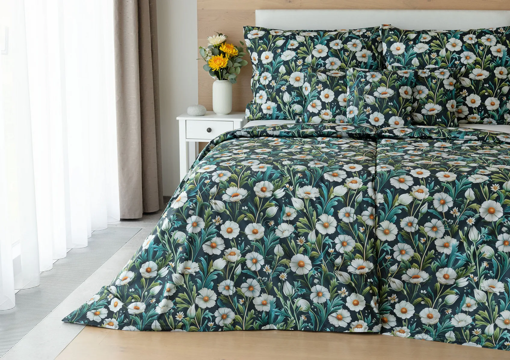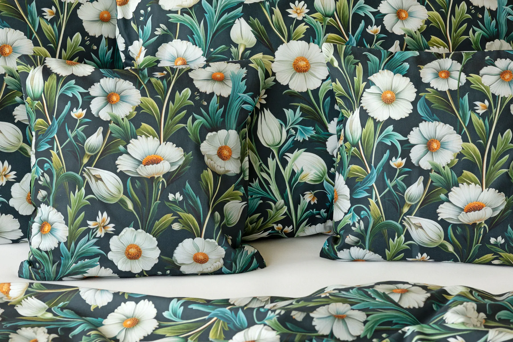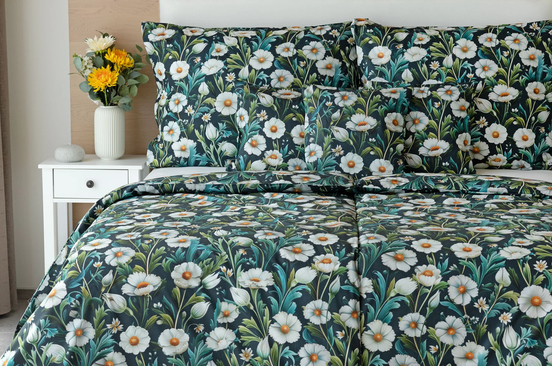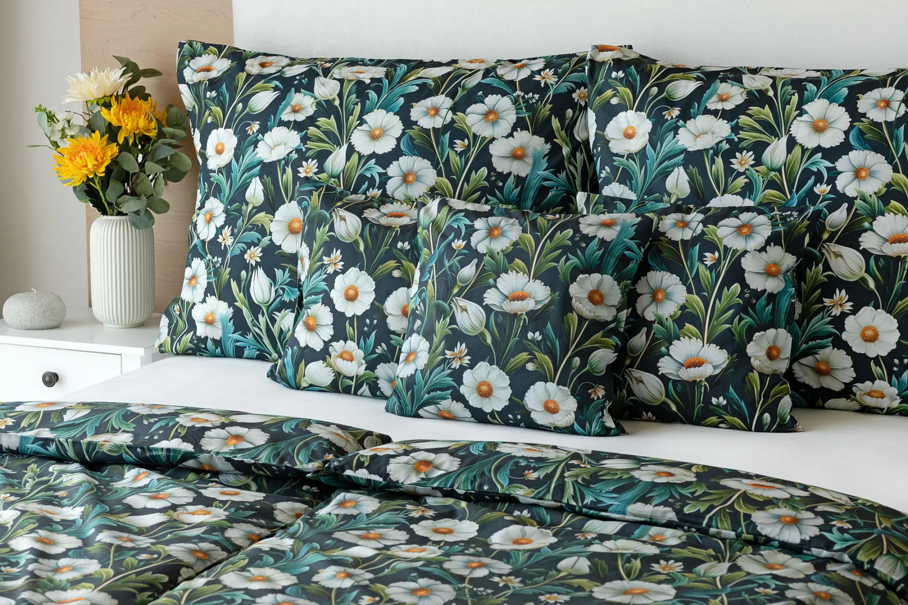Vychutnejte si uklidňující harmonii ložního povlečení Bonnie. V okouzlujícím květinovém vzoru se snoubí pestrá paleta zelených tónů, které vynikají mezi drobnými kvítky na temně modrozeleném podkladu. Díky nejmodernější digitální tiskové technologii se povlečení pyšní precizním detailem potisku.