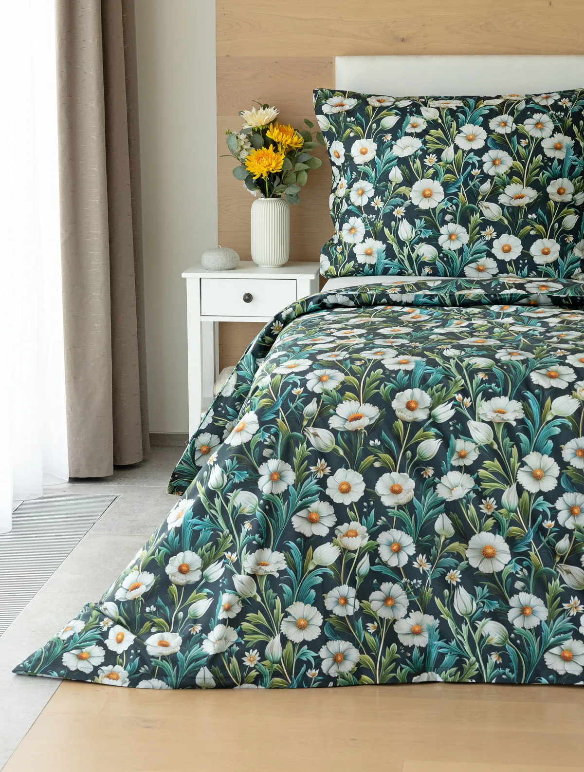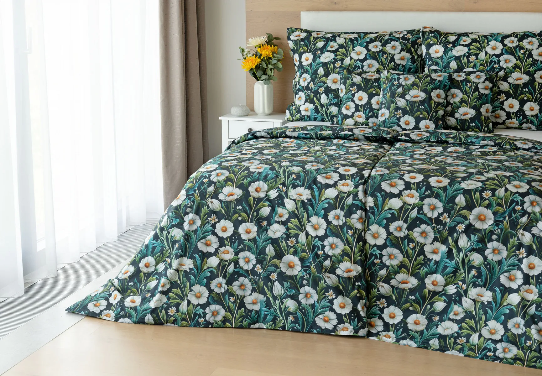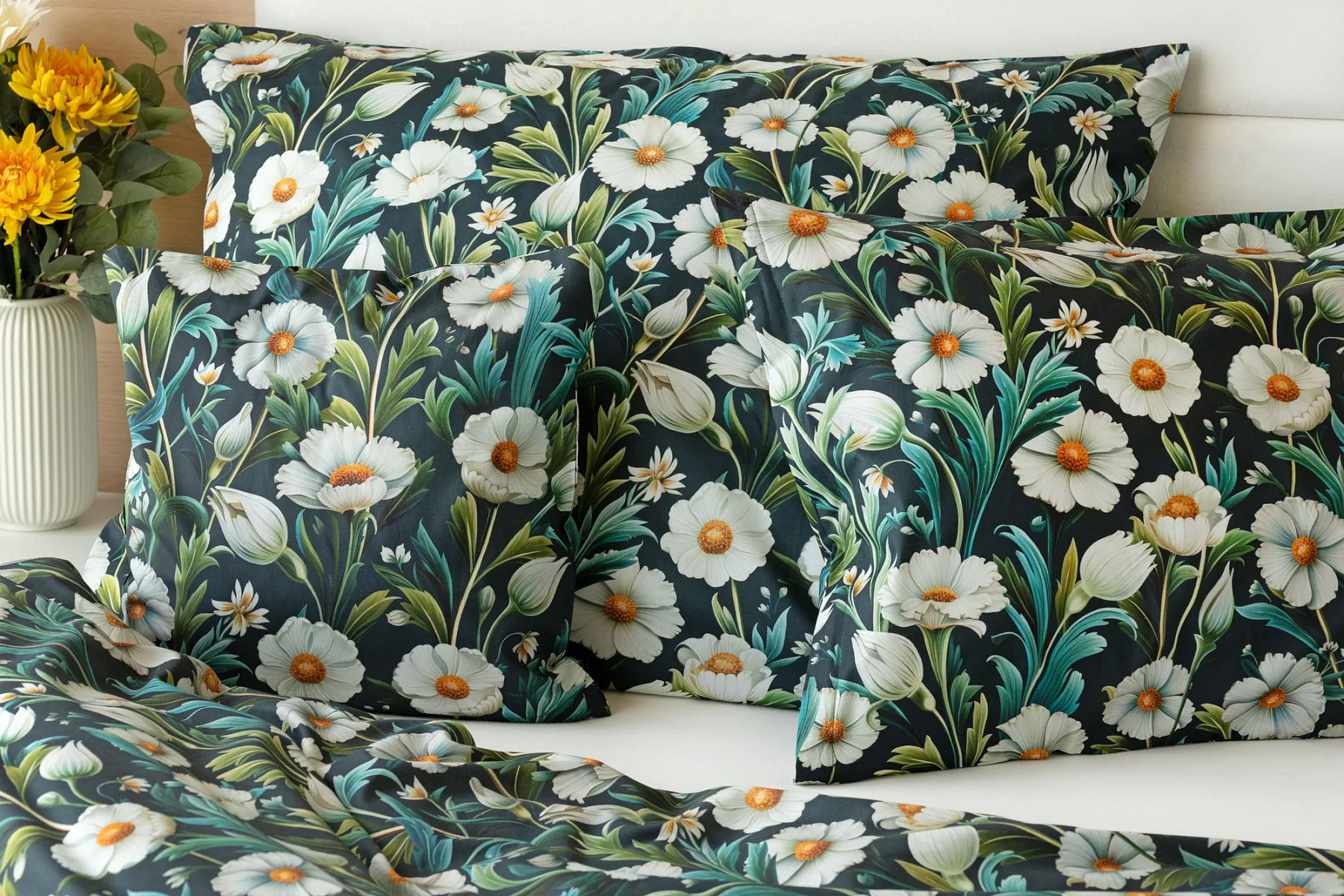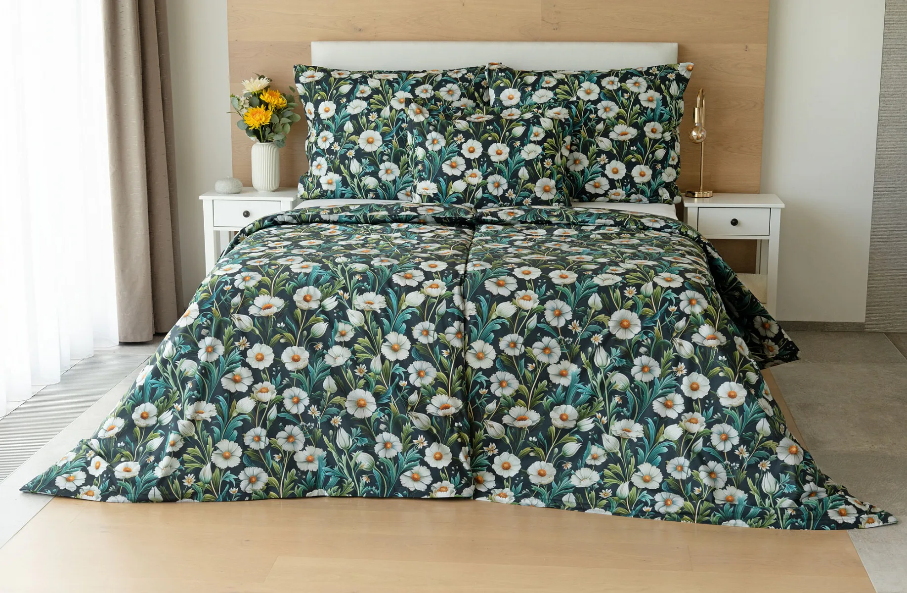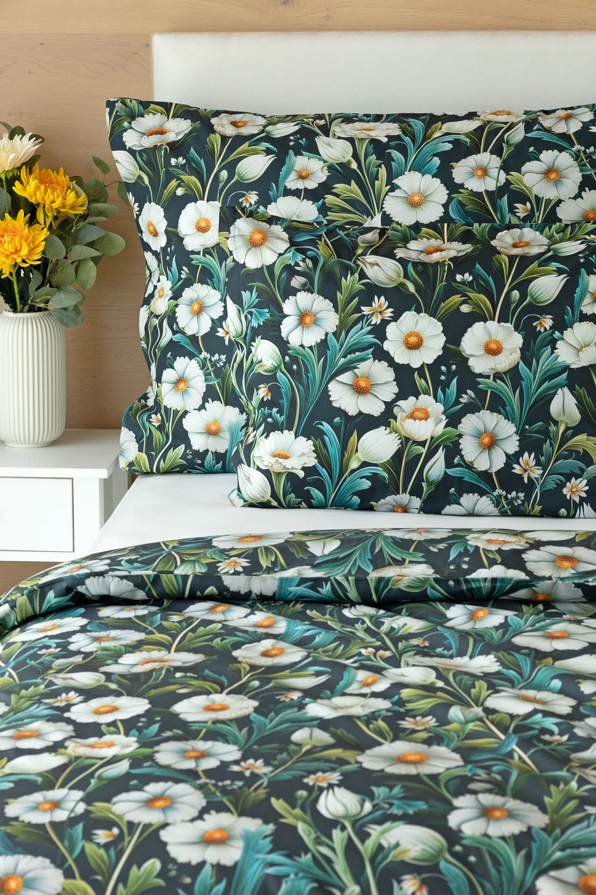 Vychutnejte si uklidňující harmonii ložního povlečení Bonnie. V okouzlujícím květinovém vzoru se snoubí pestrá paleta zelených tónů, které vynikají mezi drobnými kvítky na temně modrozeleném podkladu. Díky nejmodernější digitální tiskové technologii se povlečení pyšní precizním detailem potisku.