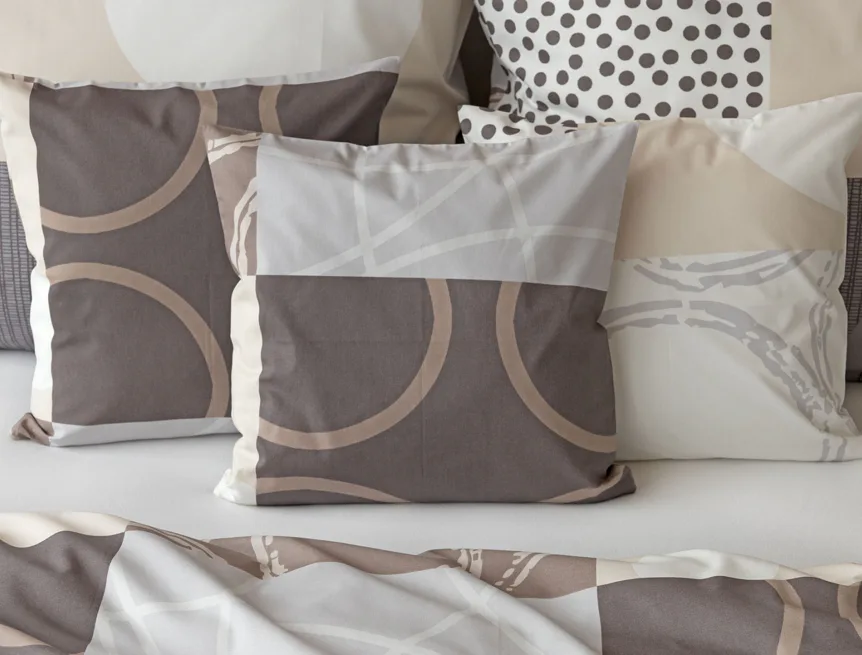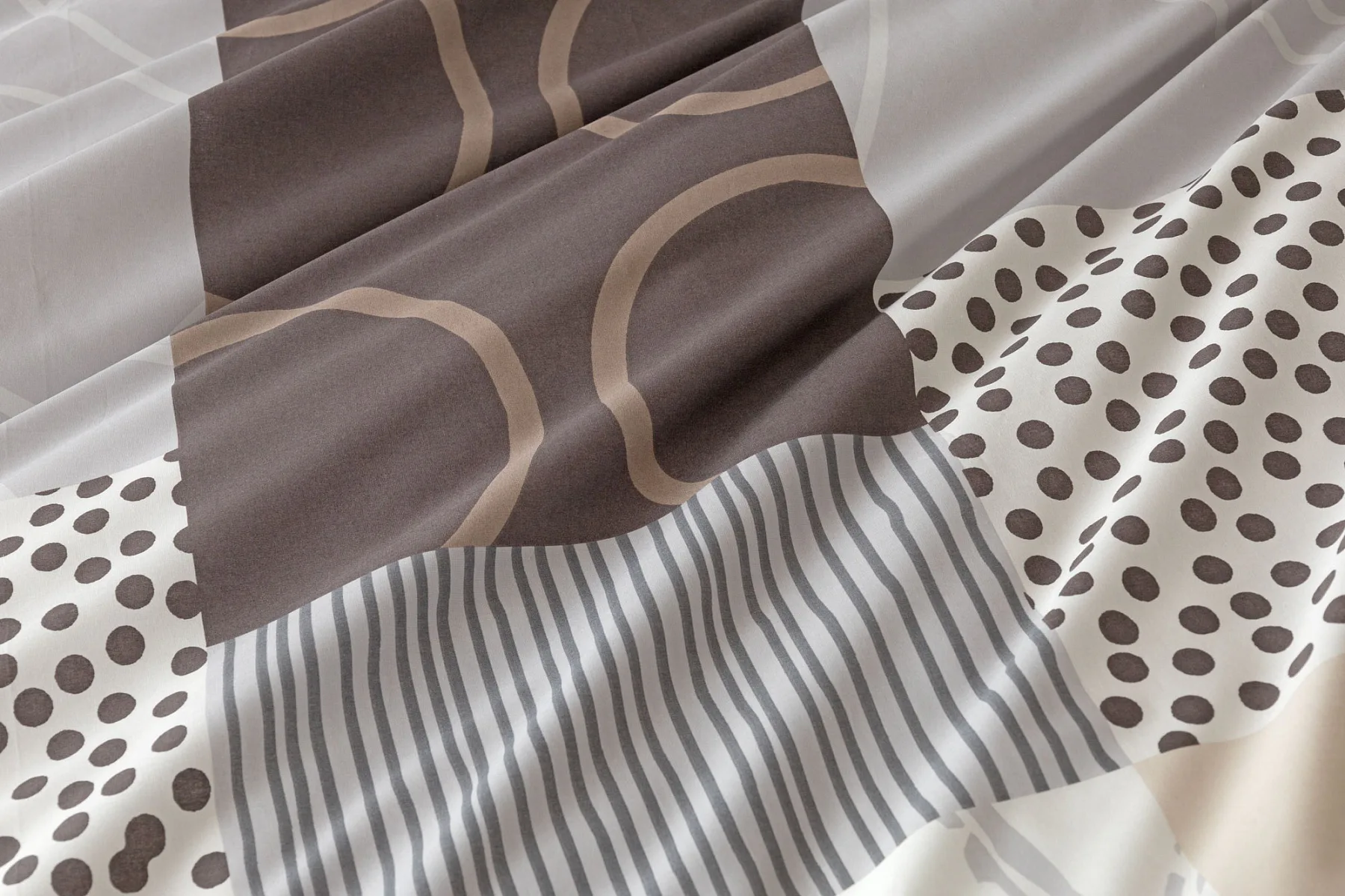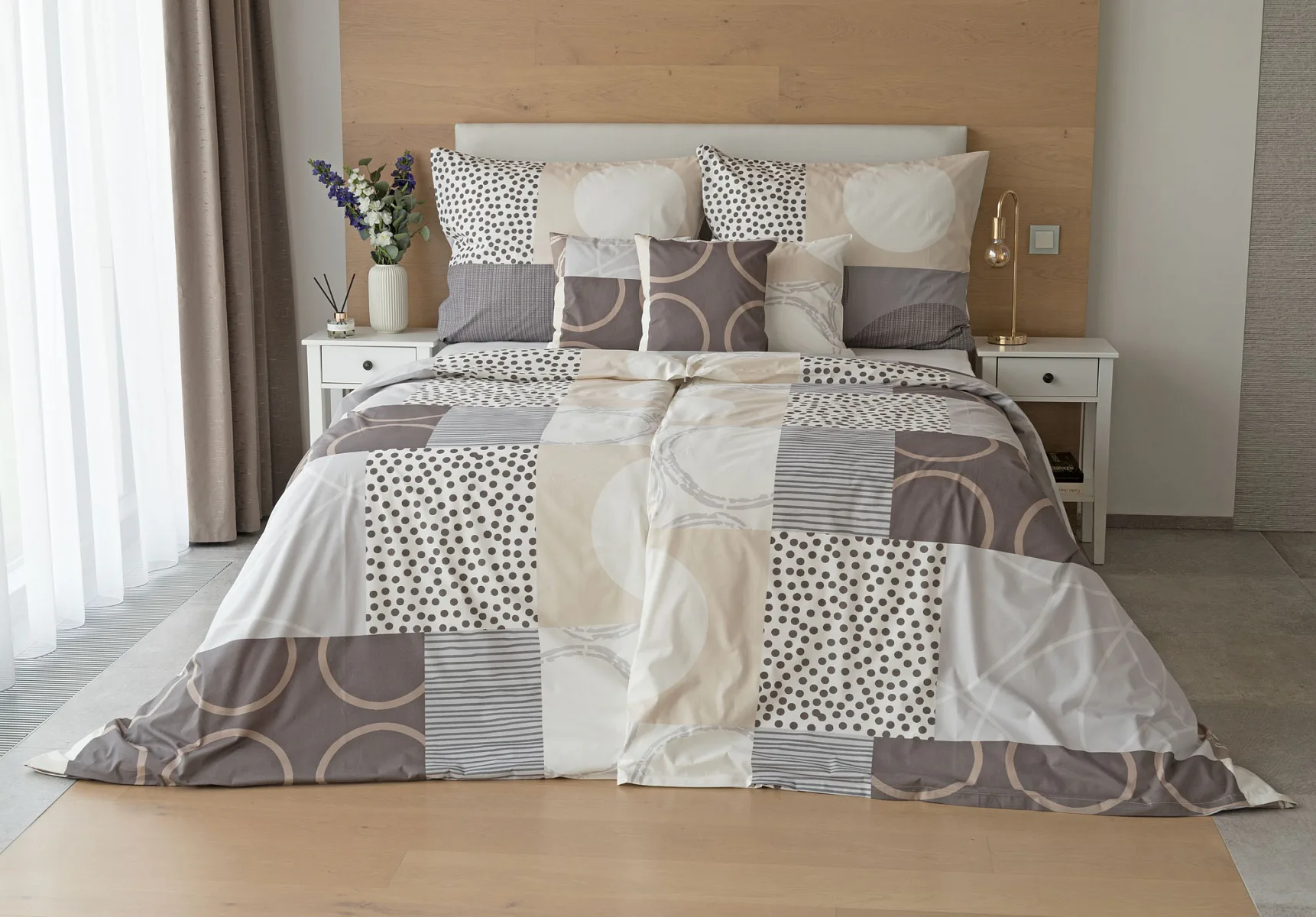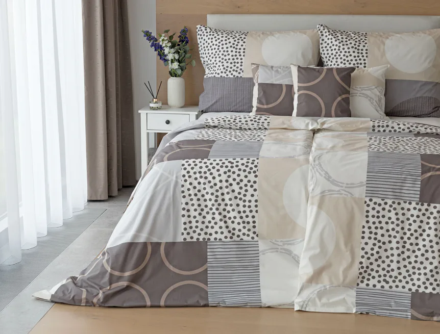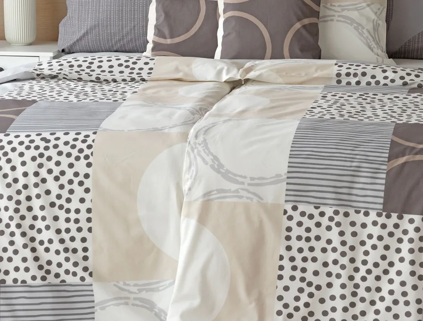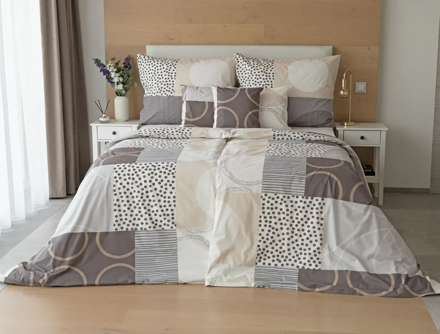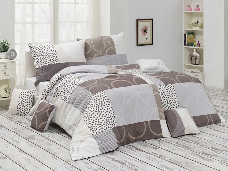 Moderní geometrický vzor povlečení Brenton kombinuje jemné odstíny hnědé, béžové a šedé na krémově bílém podkladu.