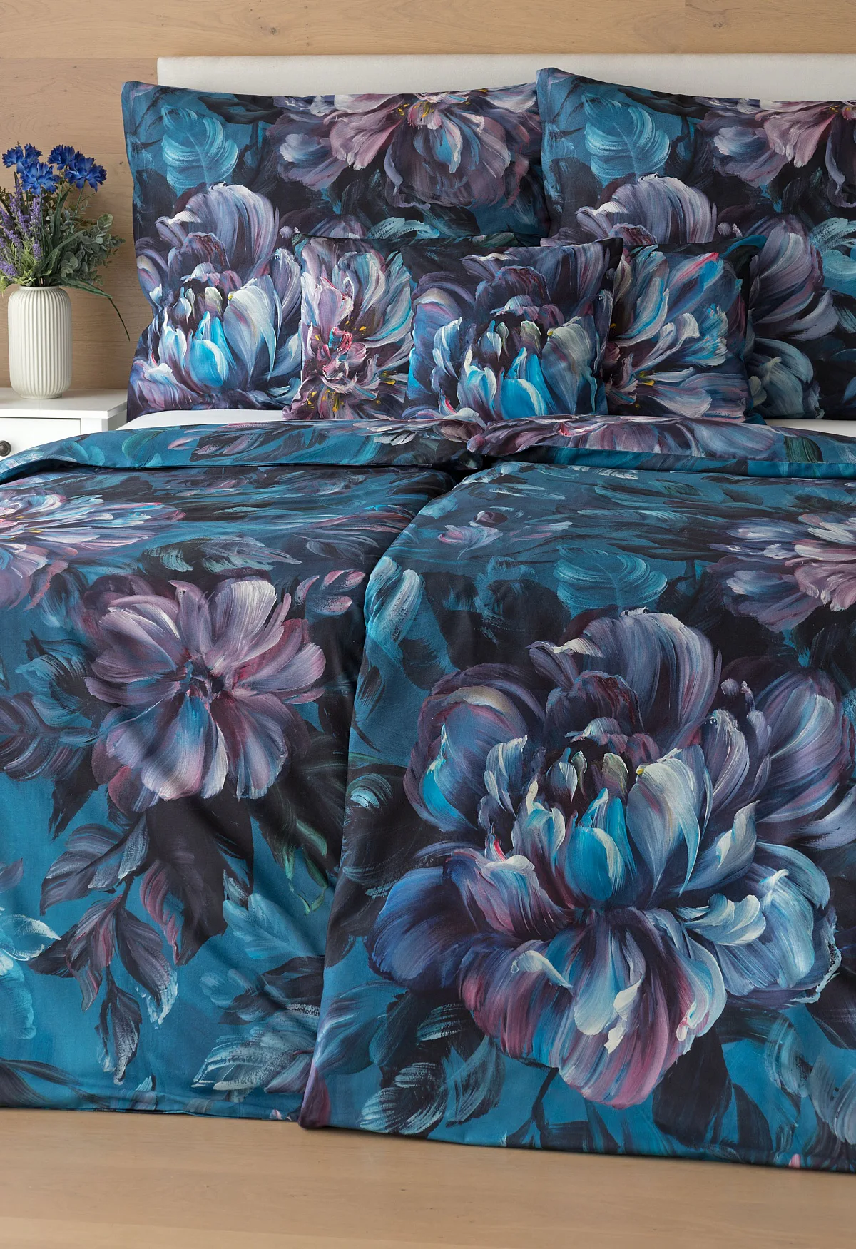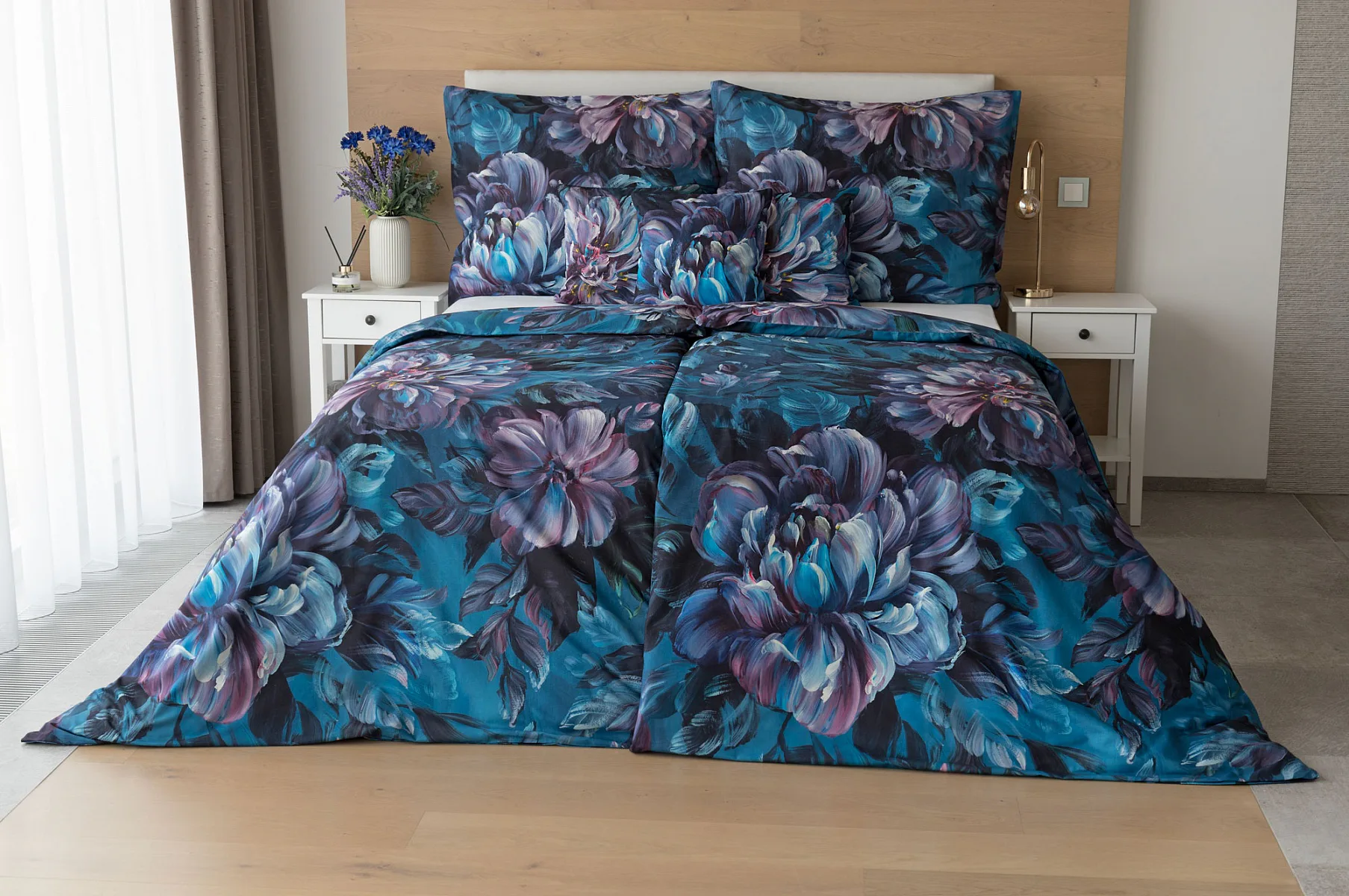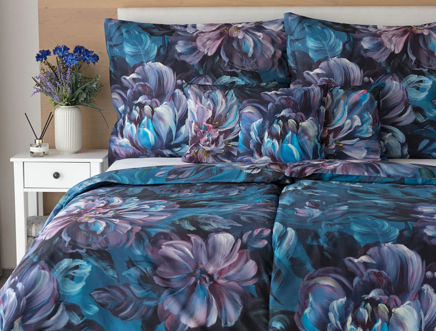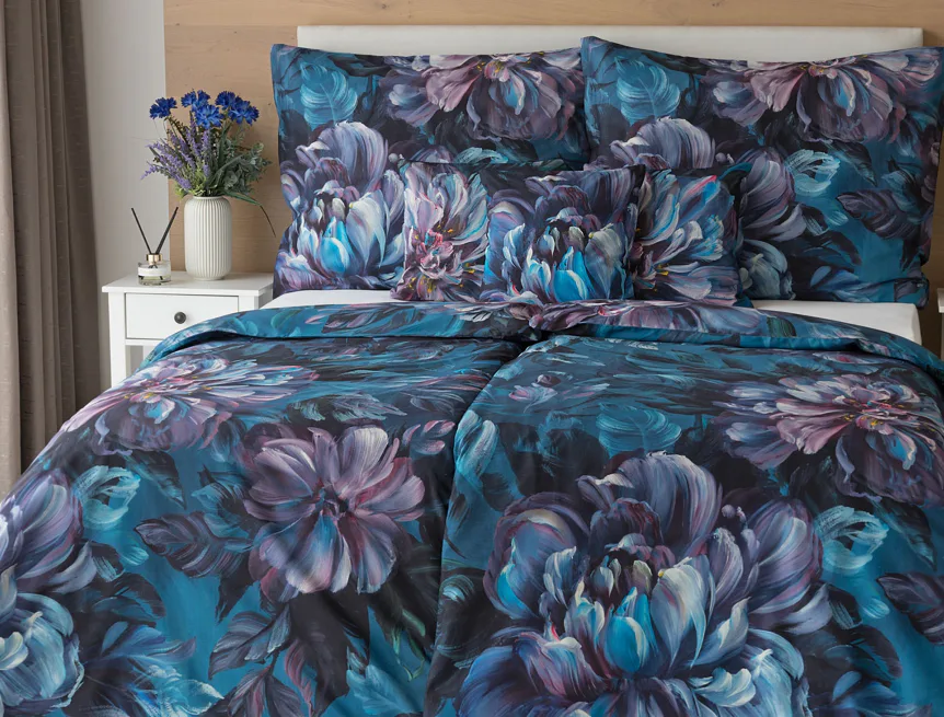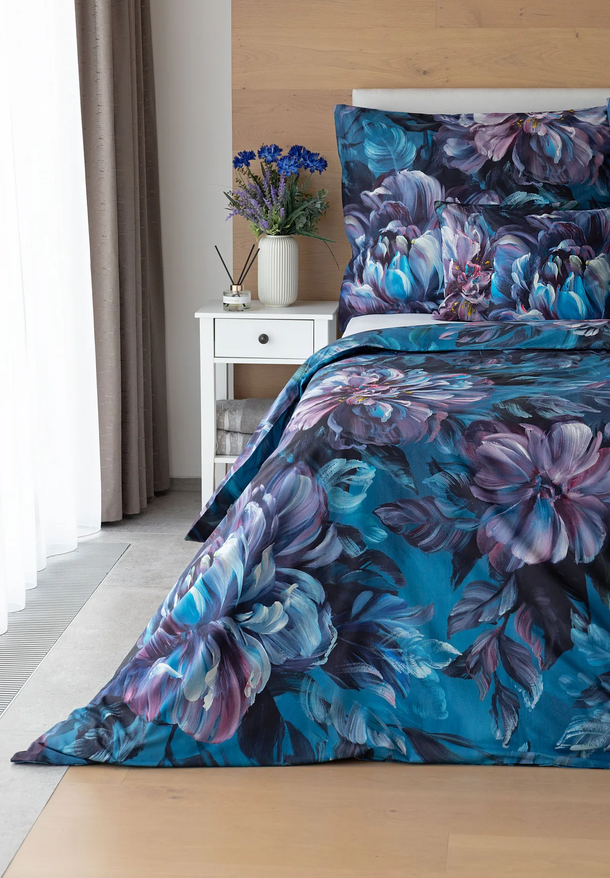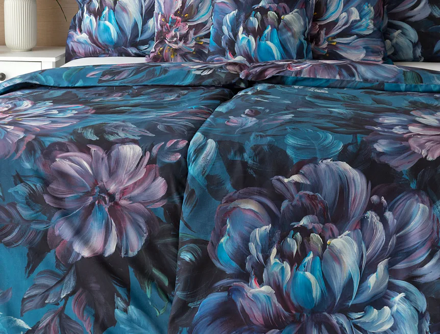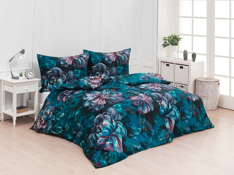 Vychutnejte si magické souznění barev v květinové malbě, která je v jedinečném detailu přenesena na bavlněné ložní povlečení Christine. Převažující petrolejové tóny hravě doplňuje paleta růžových a fialových odstínů. Díky nejmodernější digitální tiskové technologii se povlečení pyšní precizním detailem potisku.