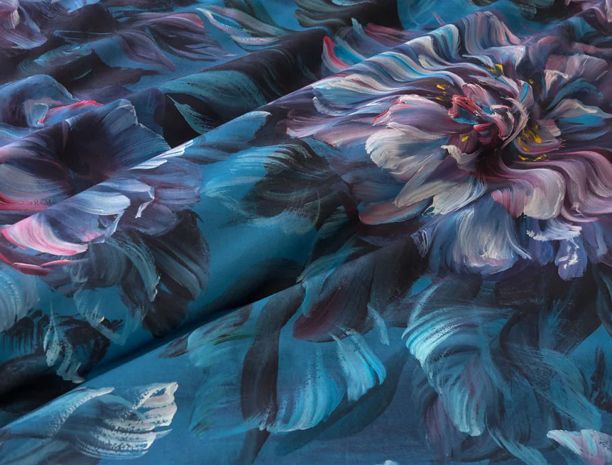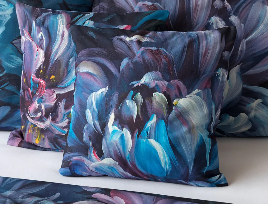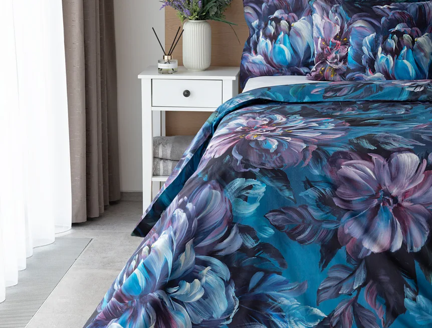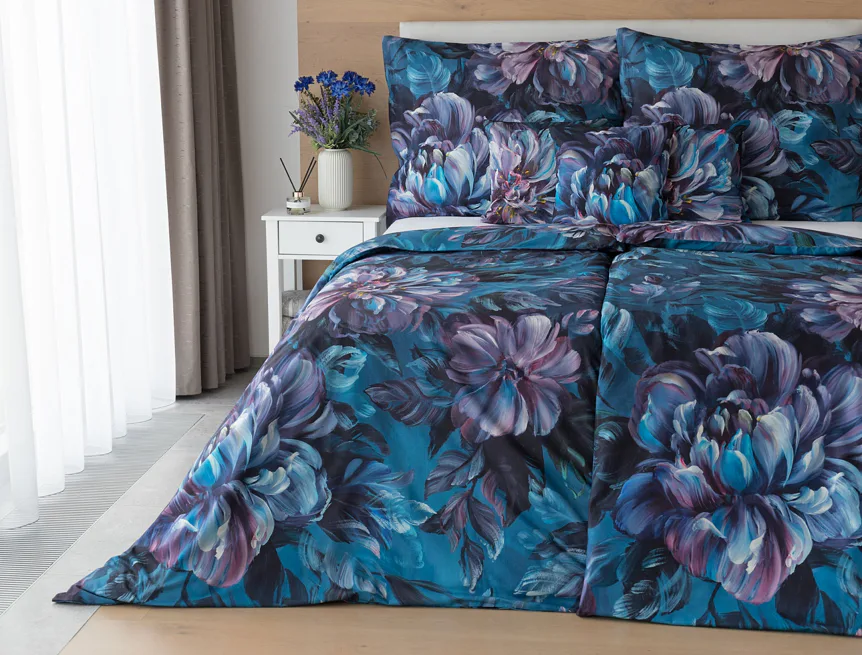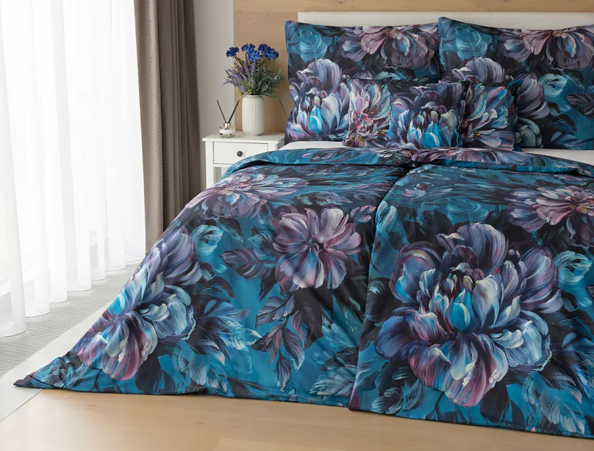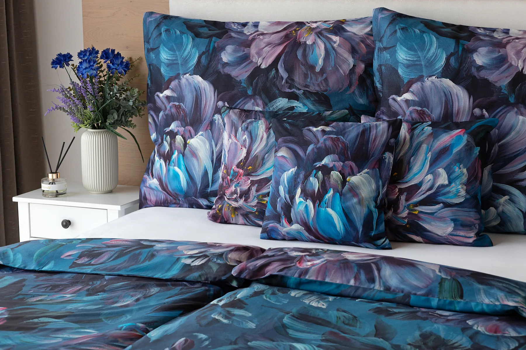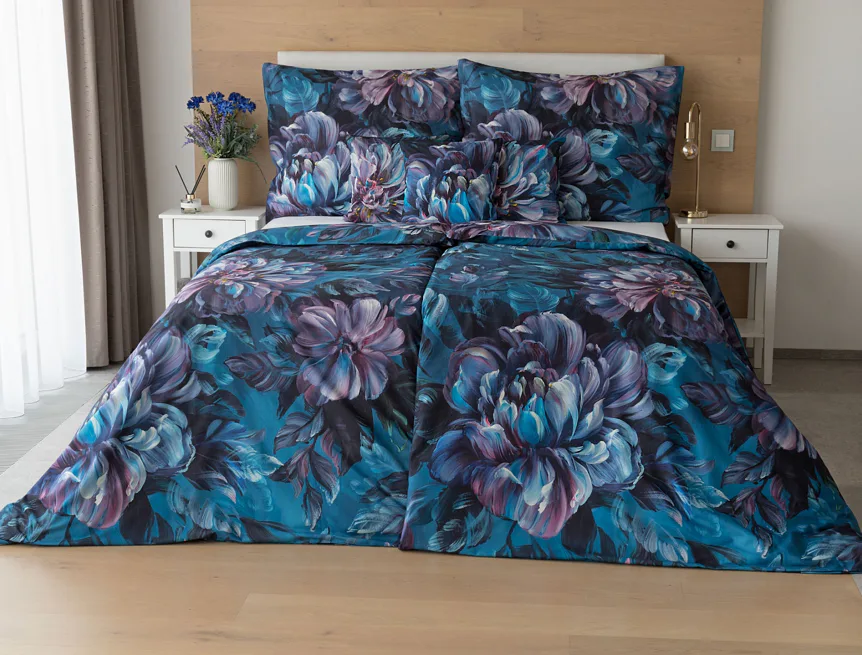 Vychutnejte si magické souznění barev v květinové malbě, která je v jedinečném detailu přenesena na bavlněné ložní povlečení Christine. Převažující petrolejové tóny hravě doplňuje paleta růžových a fialových odstínů. Díky nejmodernější digitální tiskové technologii se povlečení pyšní precizním detailem potisku.