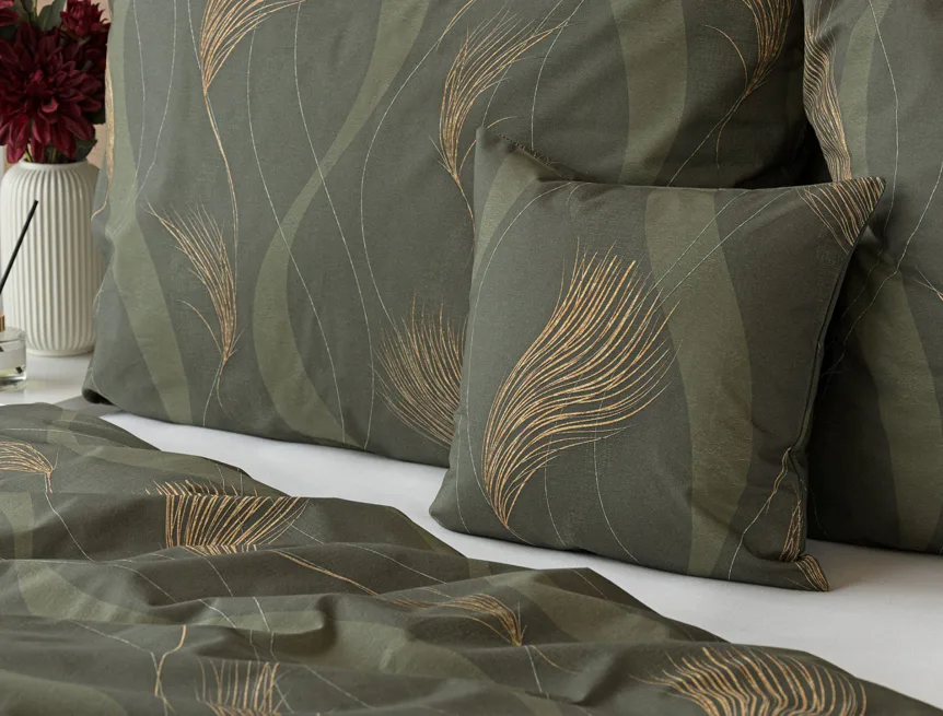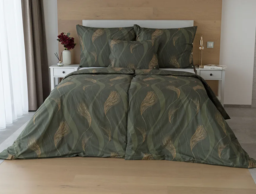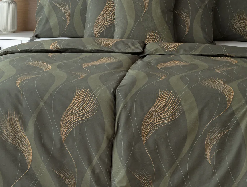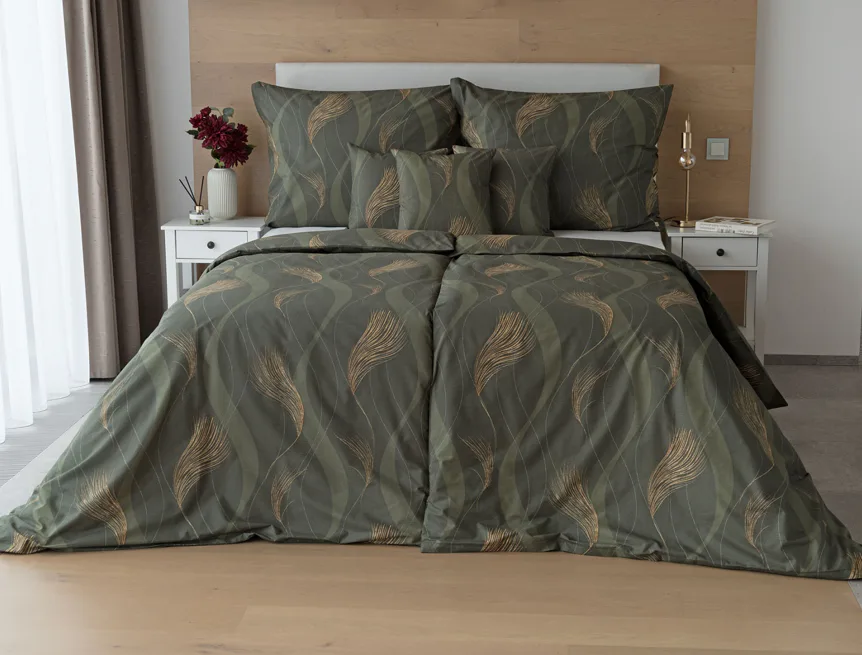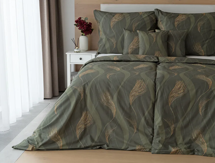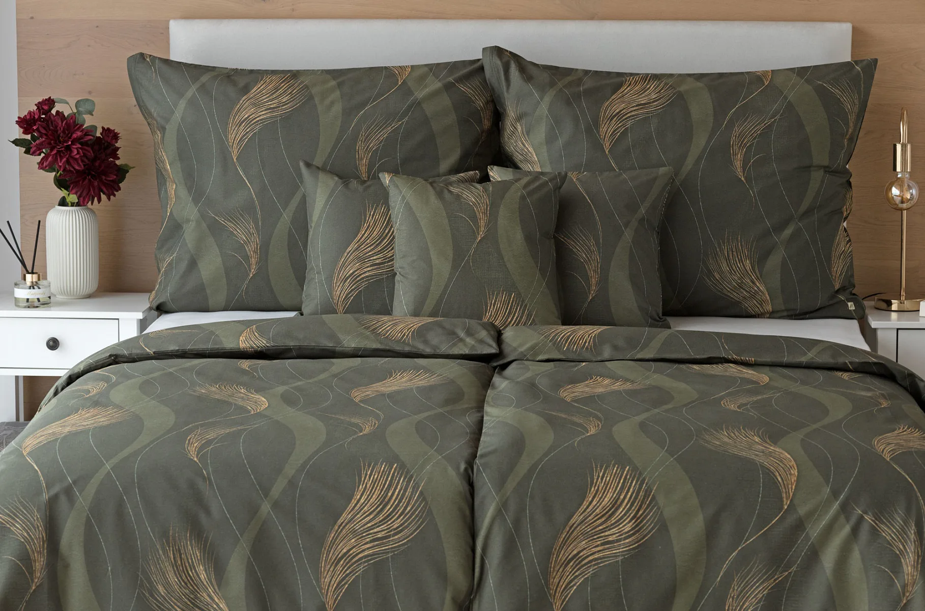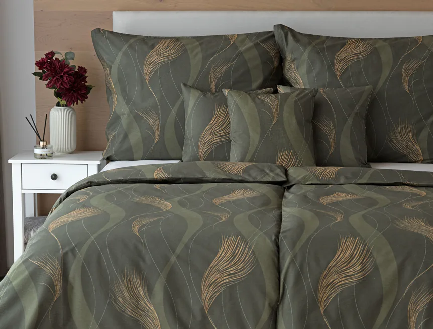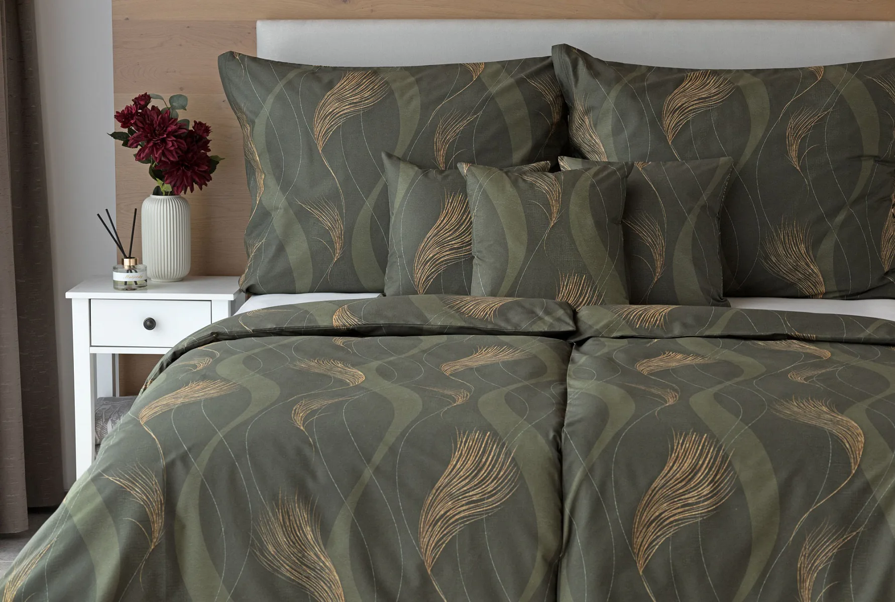 Elegantní bavlněné povlečení Collins vás okouzlí decentním vzorem a působivou kombinací barev. Motiv, který připomíná zlatavě pískové klasy, je v dokonalé harmonii s podkladem v tlumené tmavě zelené barvě. Díky nejmodernější digitální tiskové technologii vyniká vzor v precizním detailu.