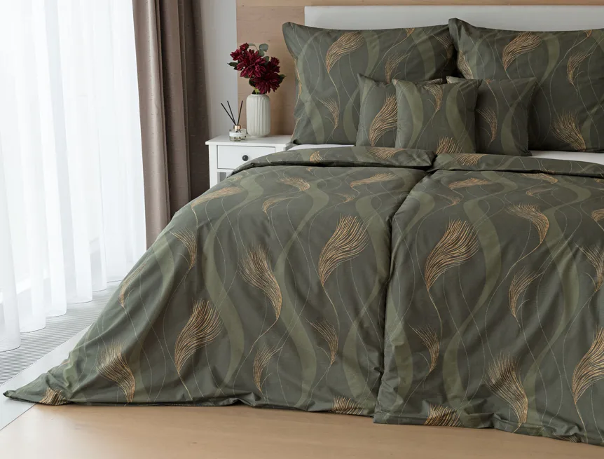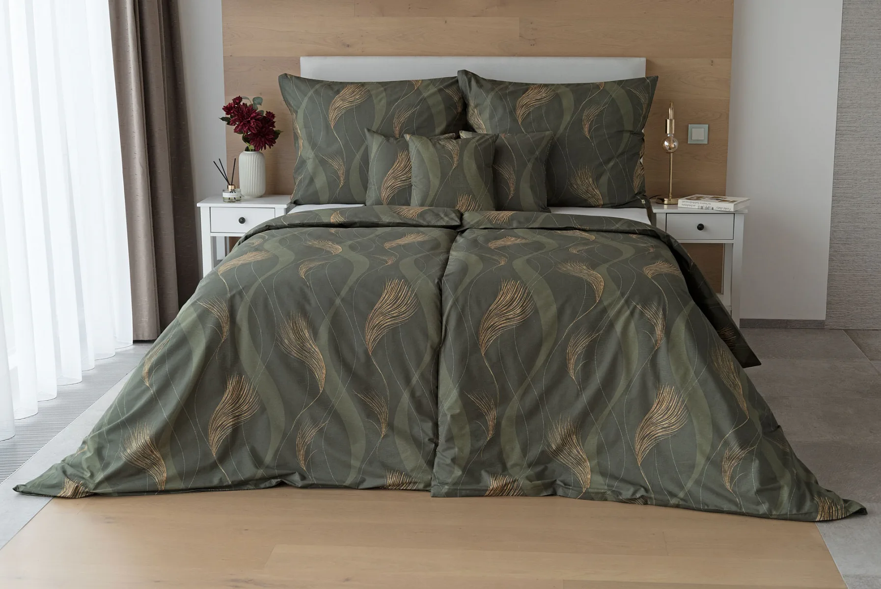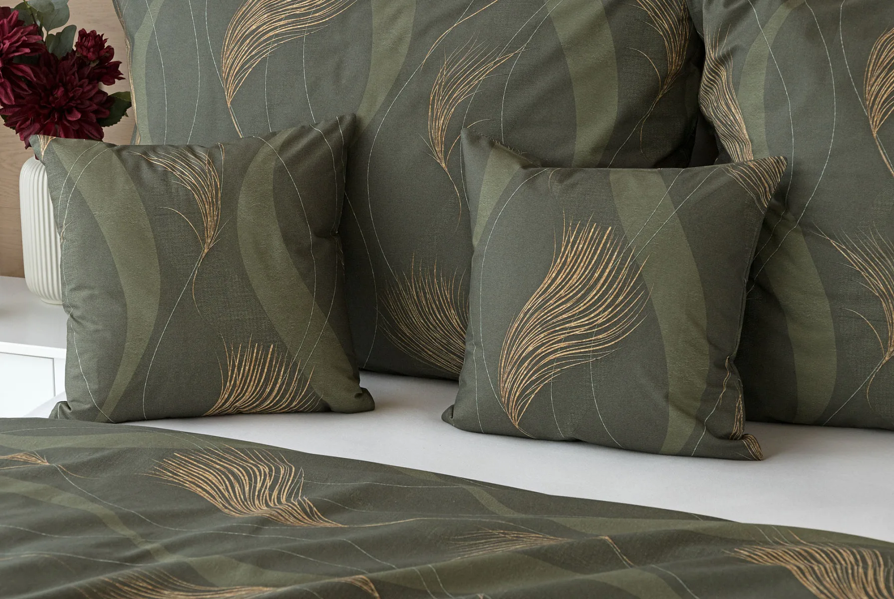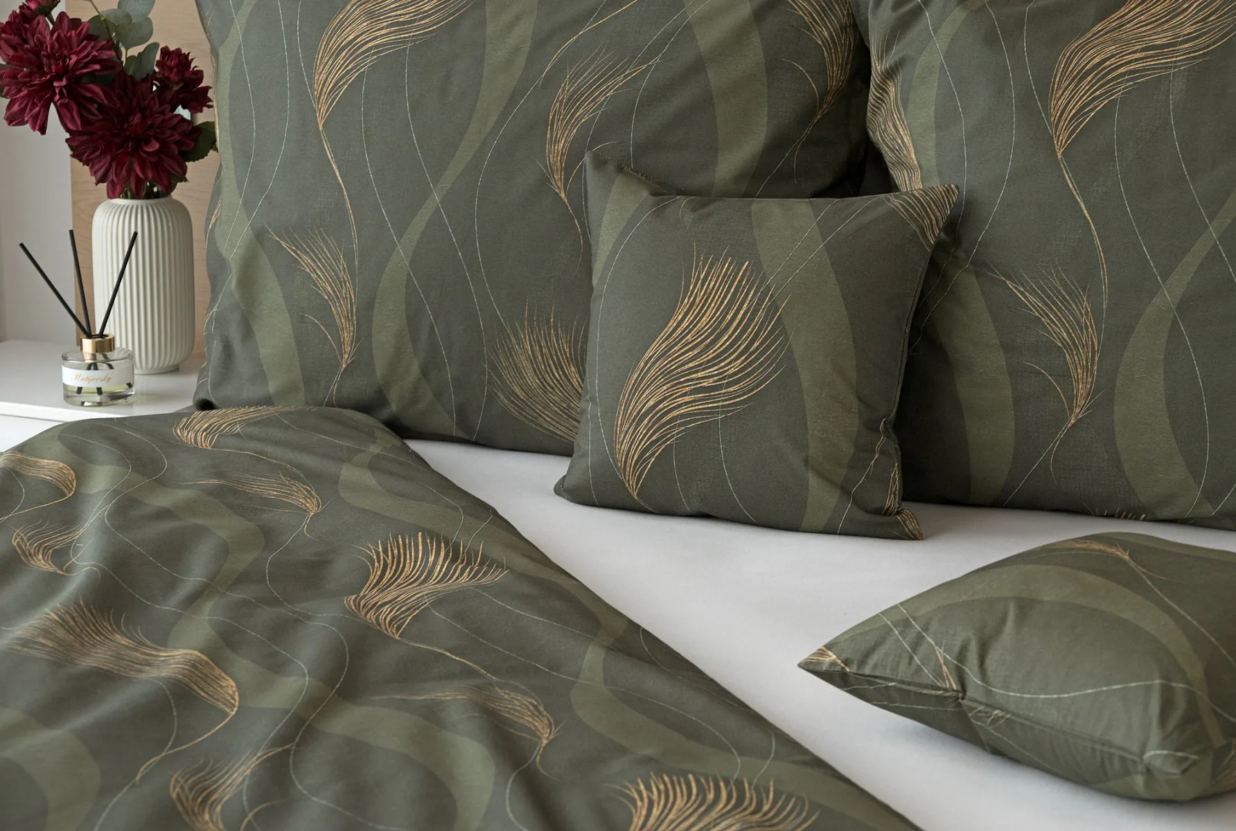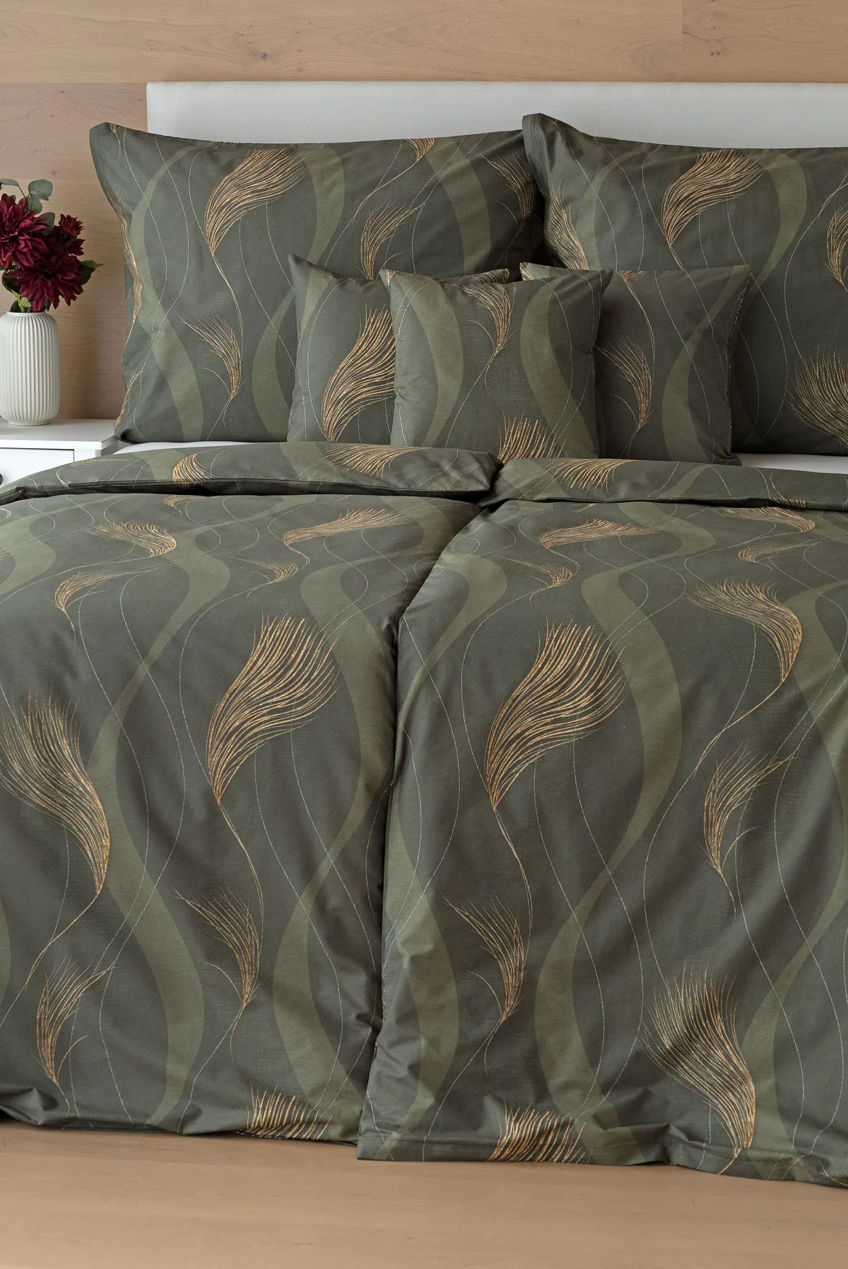 Elegantní bavlněné povlečení Collins vás okouzlí decentním vzorem a působivou kombinací barev. Motiv, který připomíná zlatavě pískové klasy, je v dokonalé harmonii s podkladem v tlumené tmavě zelené barvě. Díky nejmodernější digitální tiskové technologii vyniká vzor v precizním detailu.