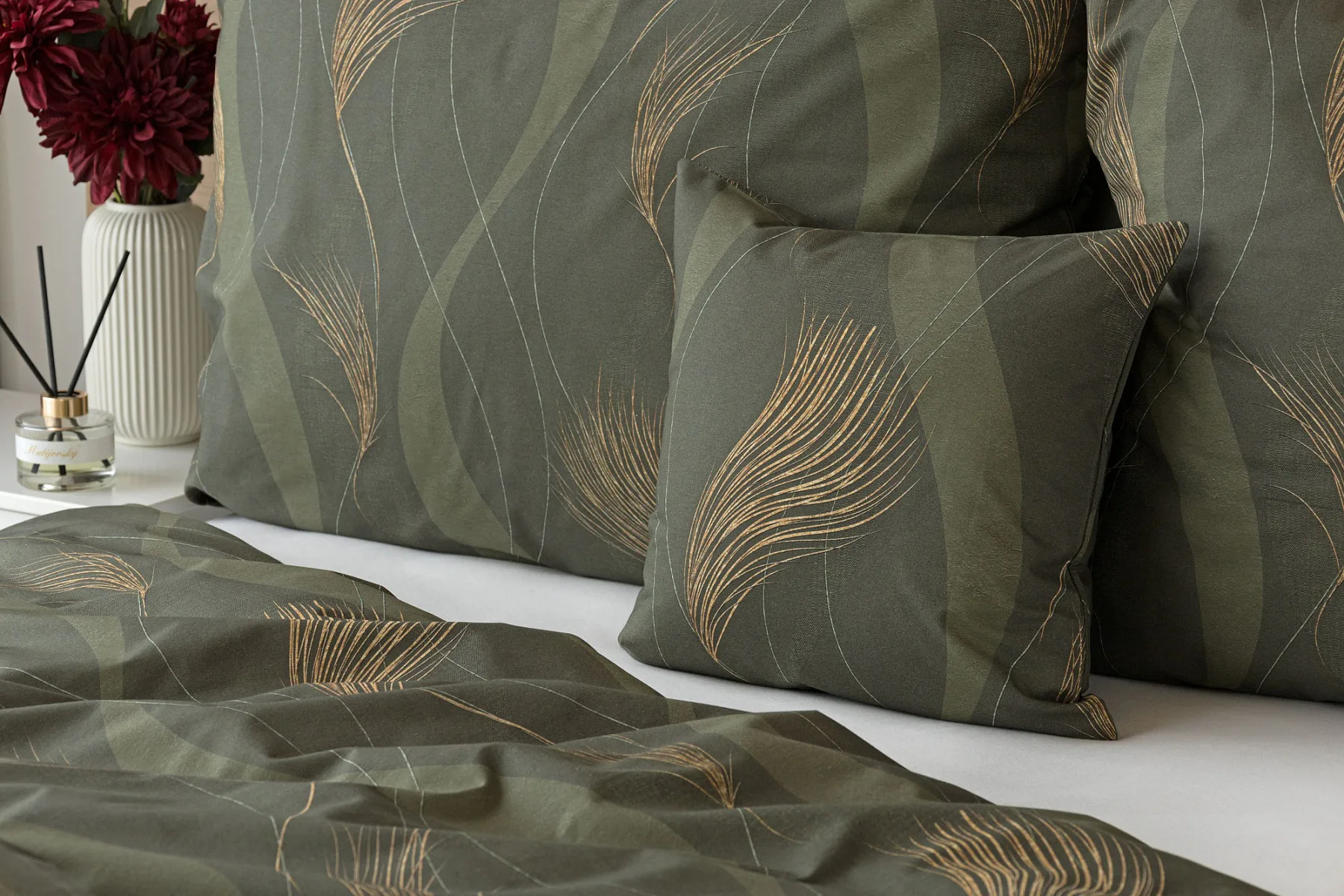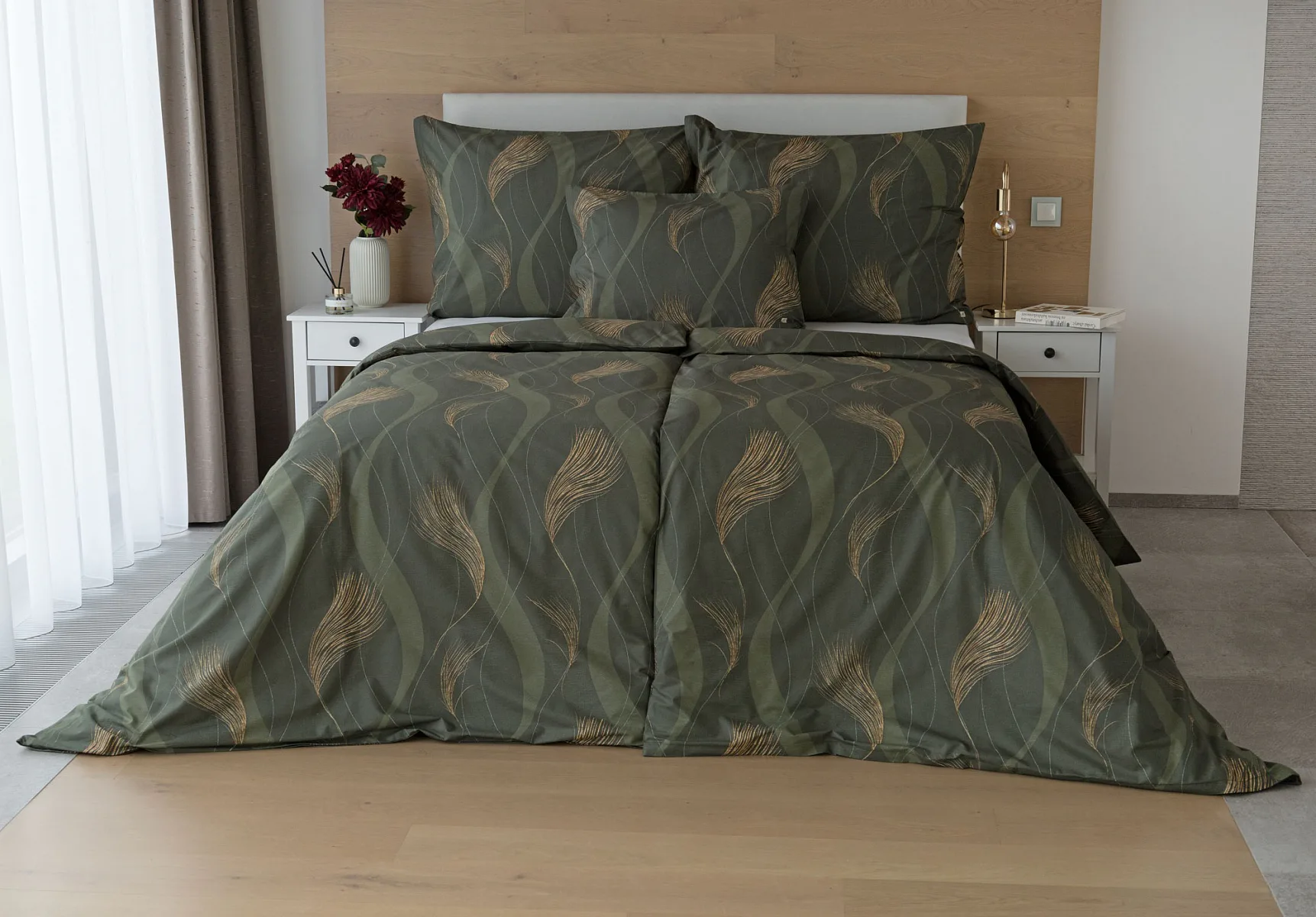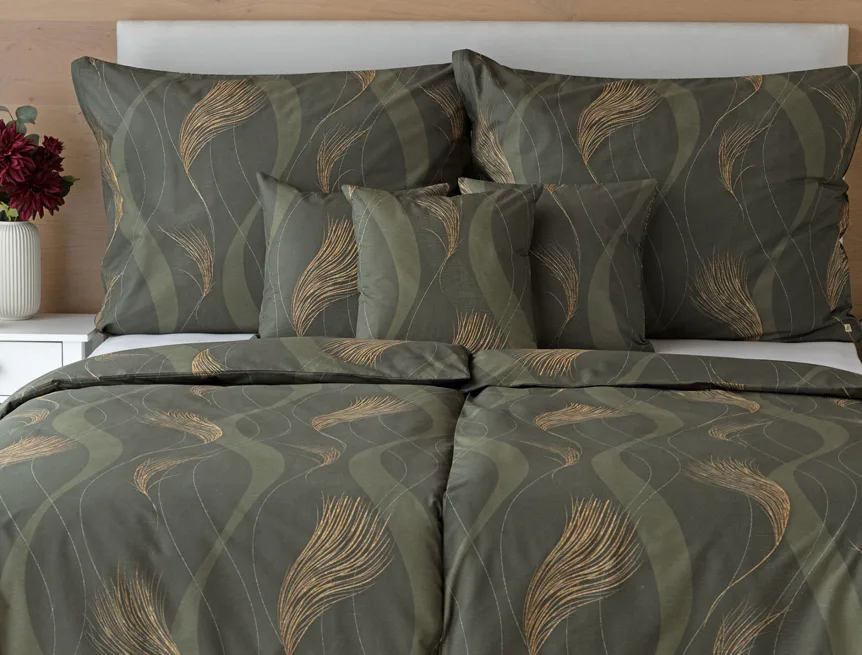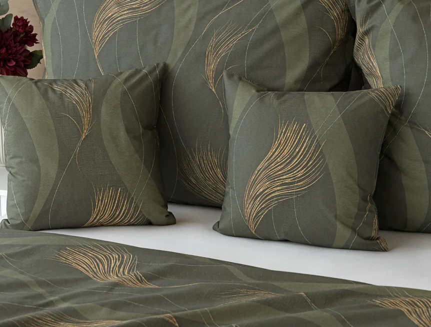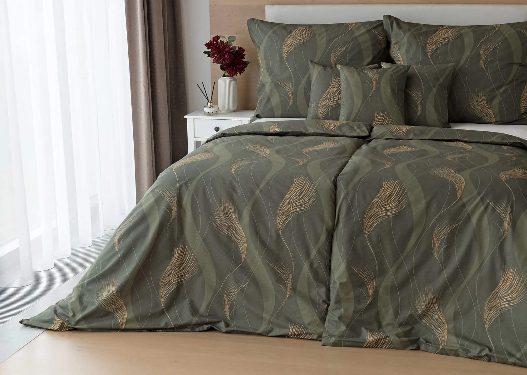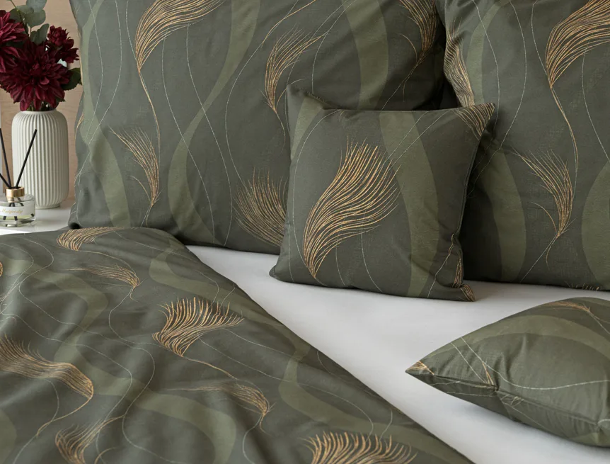 Elegantní bavlněné povlečení Collins vás okouzlí decentním vzorem a působivou kombinací barev. Motiv, který připomíná zlatavě pískové klasy, je v dokonalé harmonii s podkladem v tlumené tmavě zelené barvě. Díky nejmodernější digitální tiskové technologii vyniká vzor v precizním detailu.