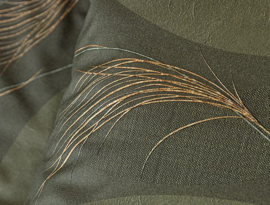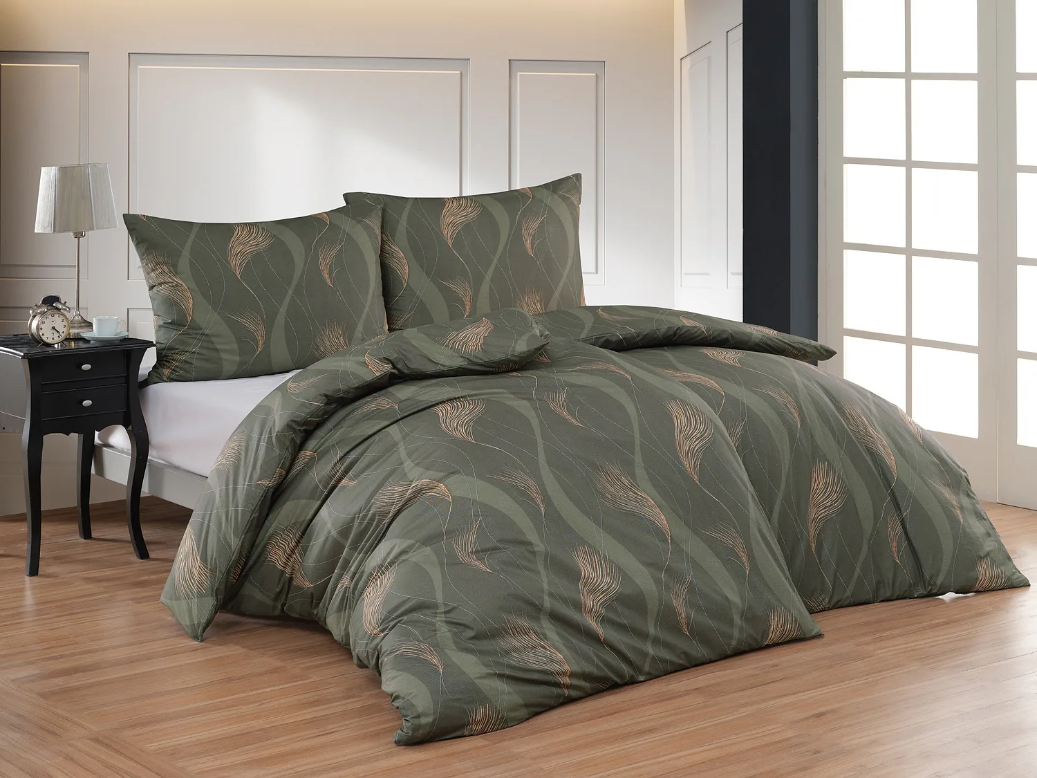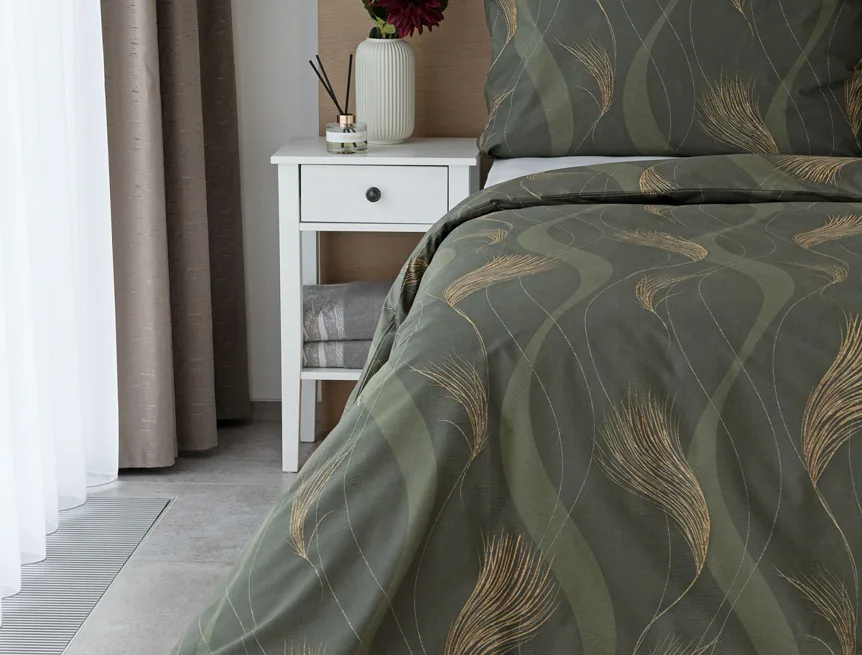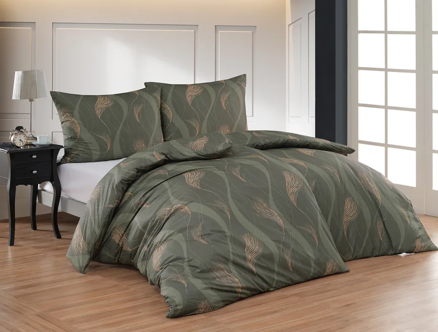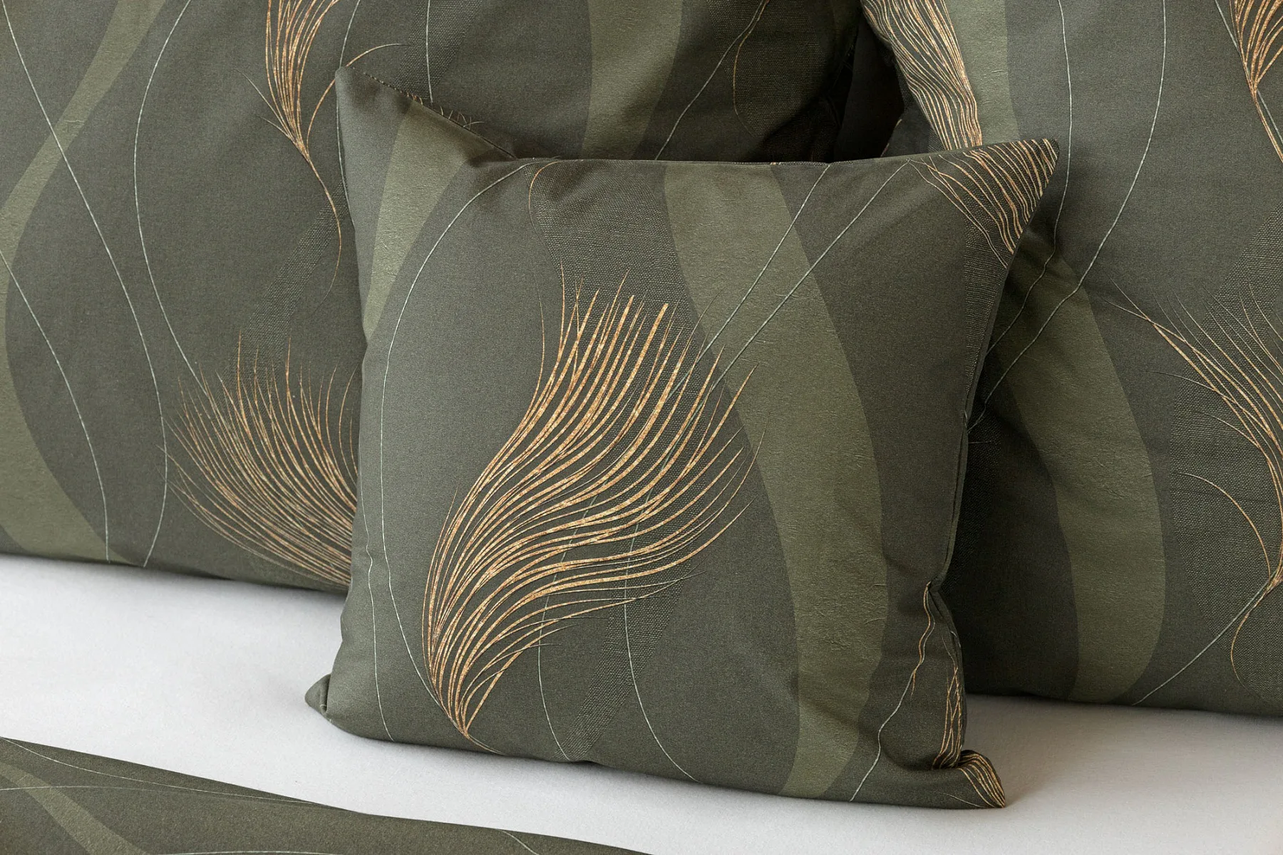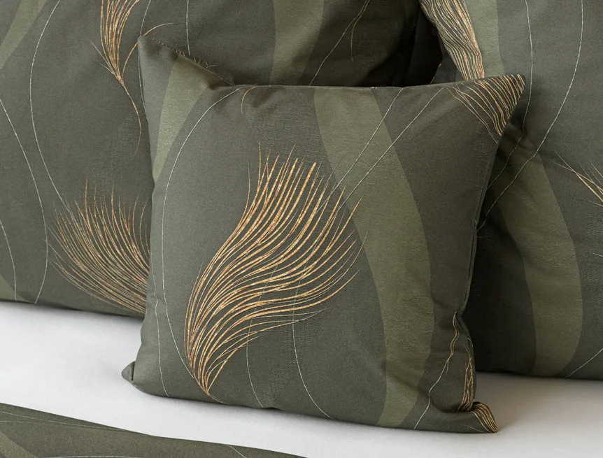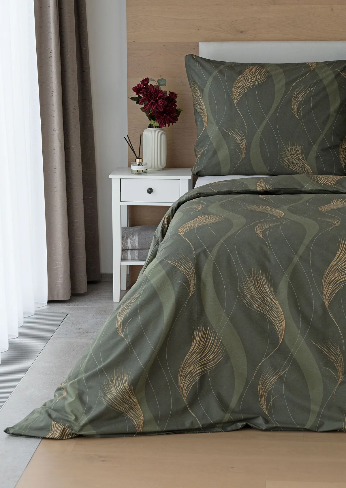 Elegantní bavlněné povlečení Collins vás okouzlí decentním vzorem a působivou kombinací barev. Motiv, který připomíná zlatavě pískové klasy, je v dokonalé harmonii s podkladem v tlumené tmavě zelené barvě. Díky nejmodernější digitální tiskové technologii vyniká vzor v precizním detailu.