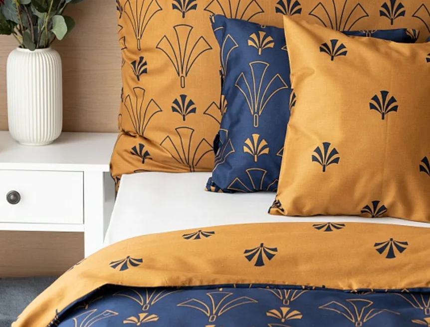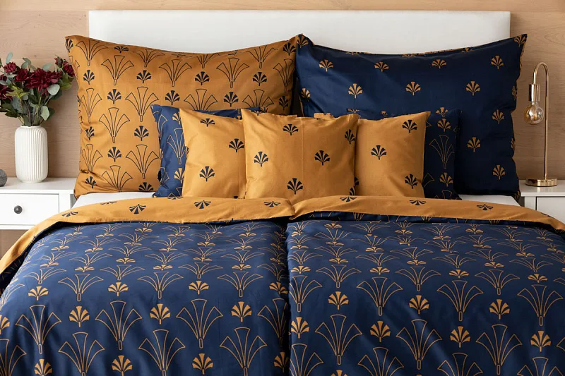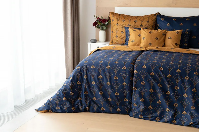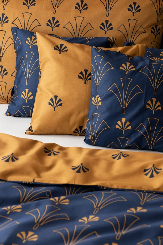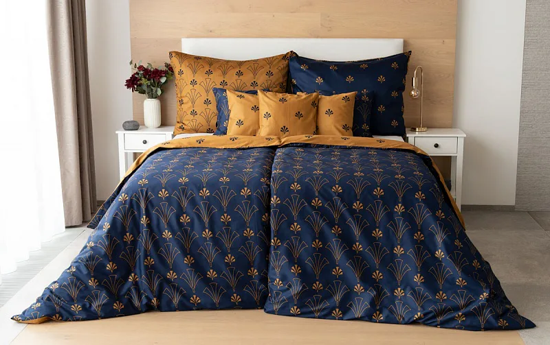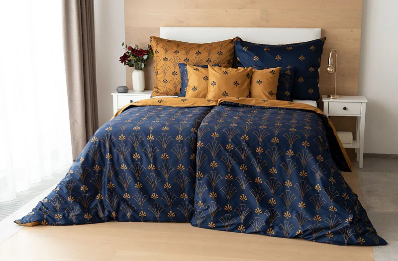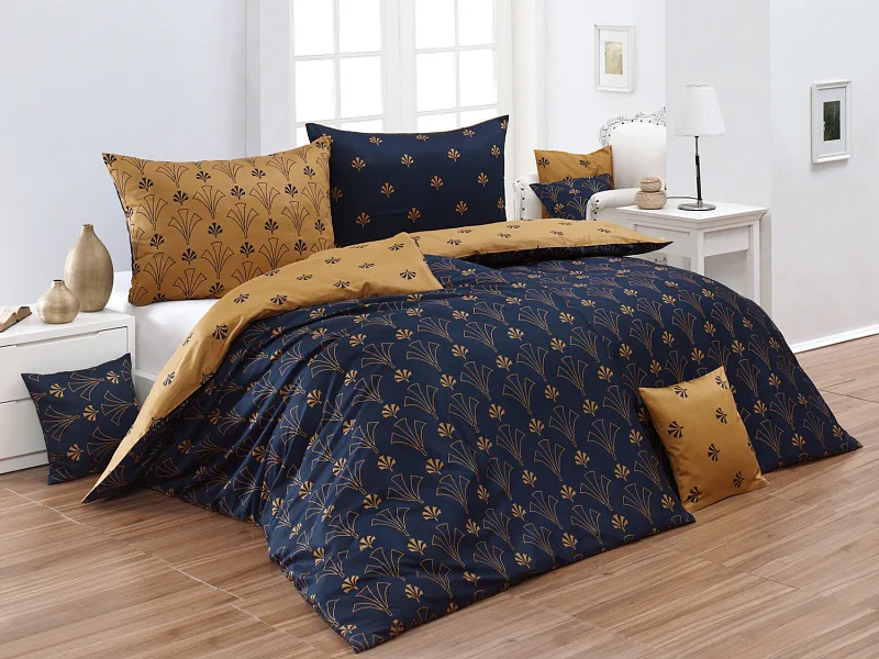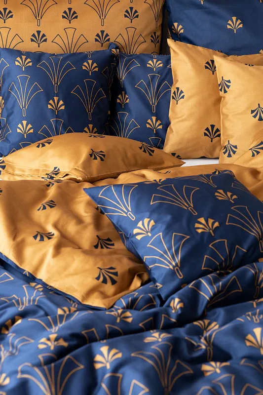 Noblesní vějířový vzor na povlečení CORDONA vnese do vaší ložnice skutečný luxus. Elegantní motivy ve zlatavém a temně modrém odstínu dokonale kontrastují a vytvářejí tak jedinečný celek.