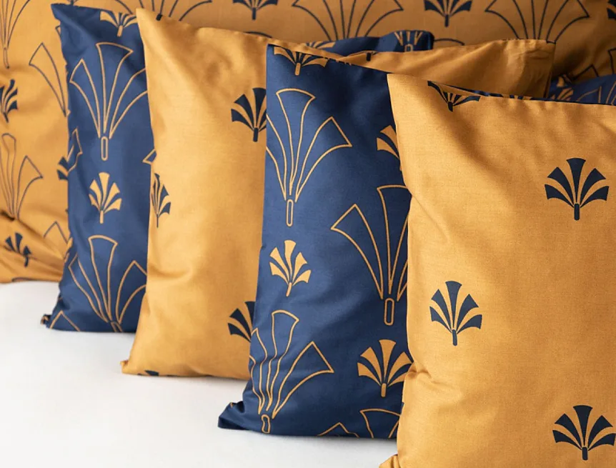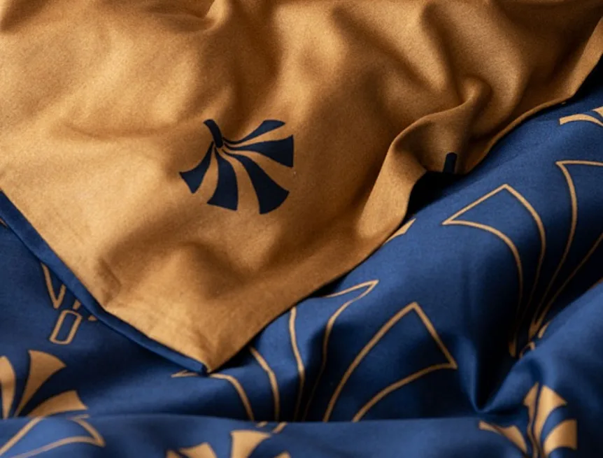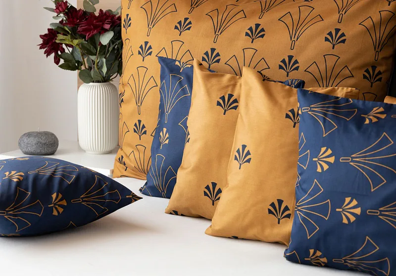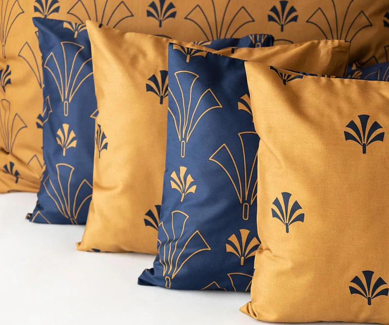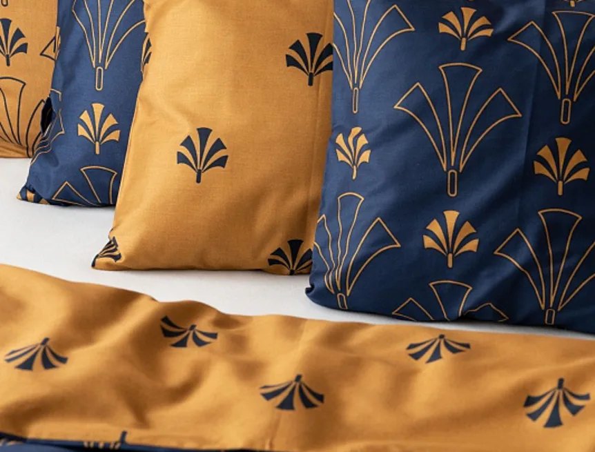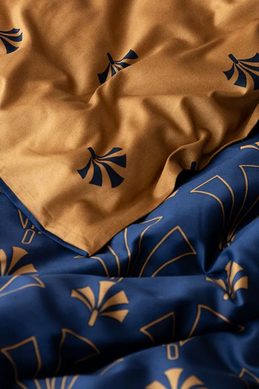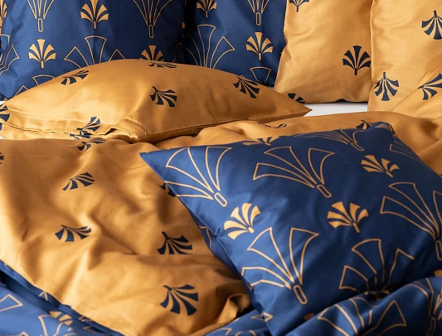 Noblesní vějířový vzor na povlečení CORDONA vnese do vaší ložnice skutečný luxus. Elegantní motivy ve zlatavém a temně modrém odstínu dokonale kontrastují a vytvářejí tak jedinečný celek.