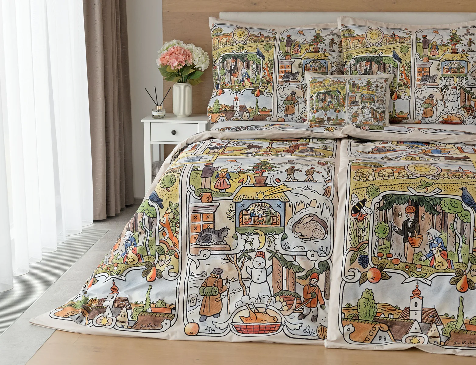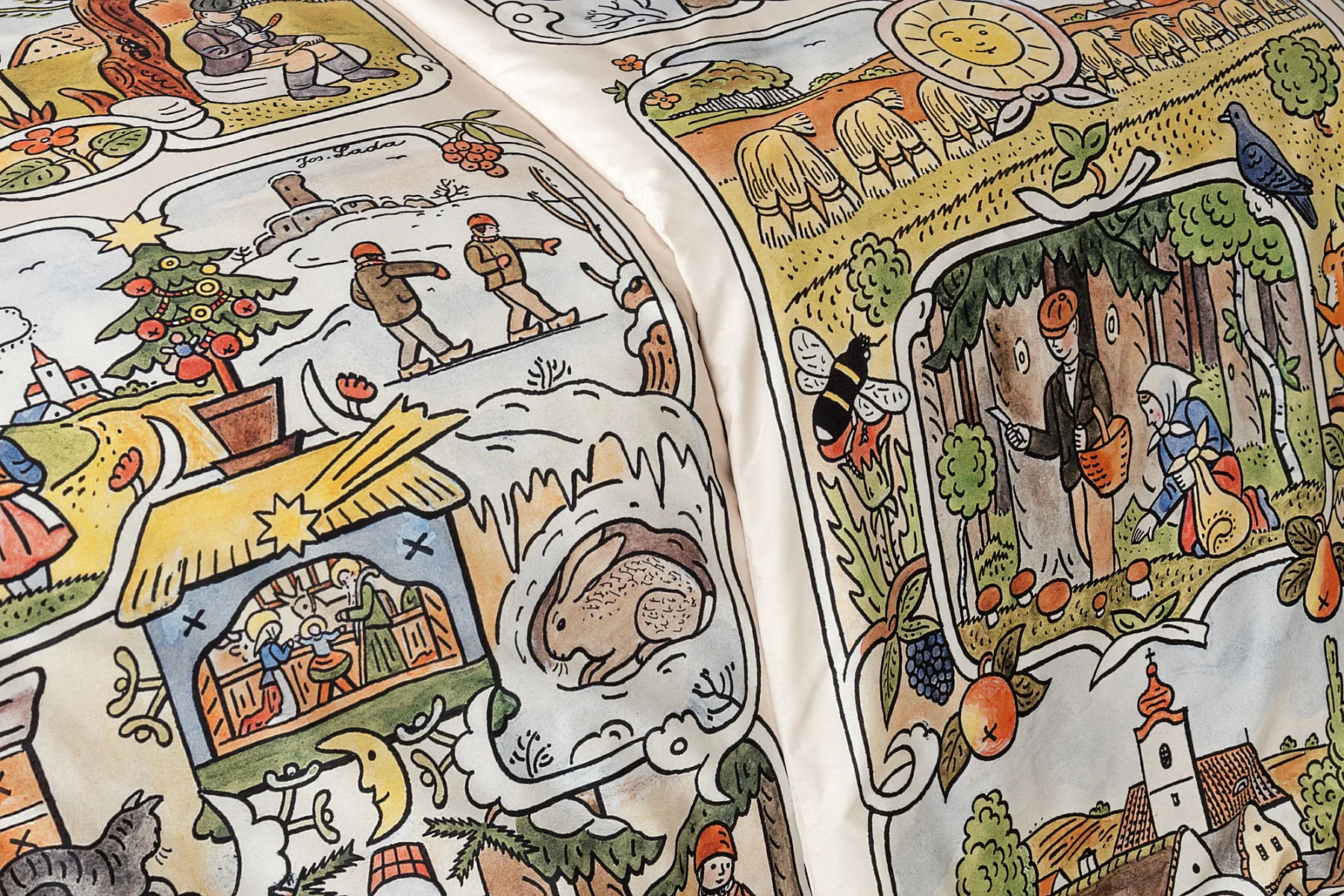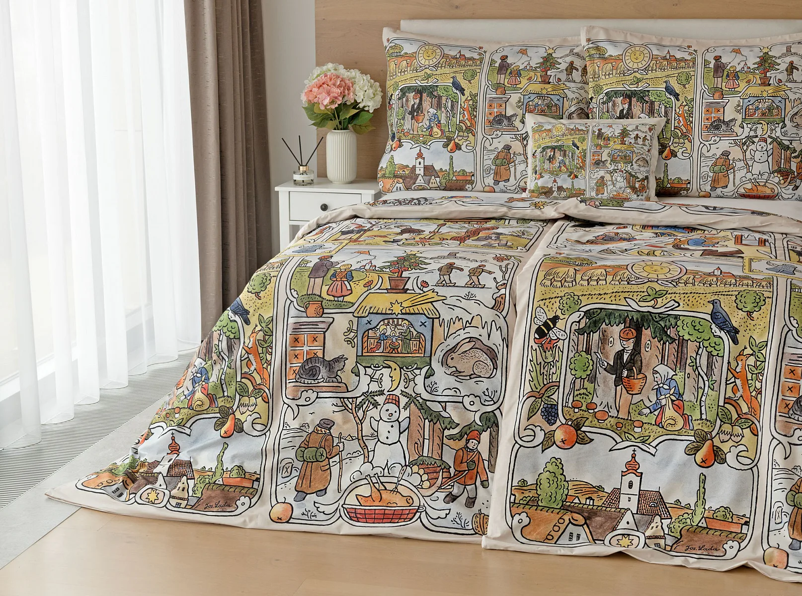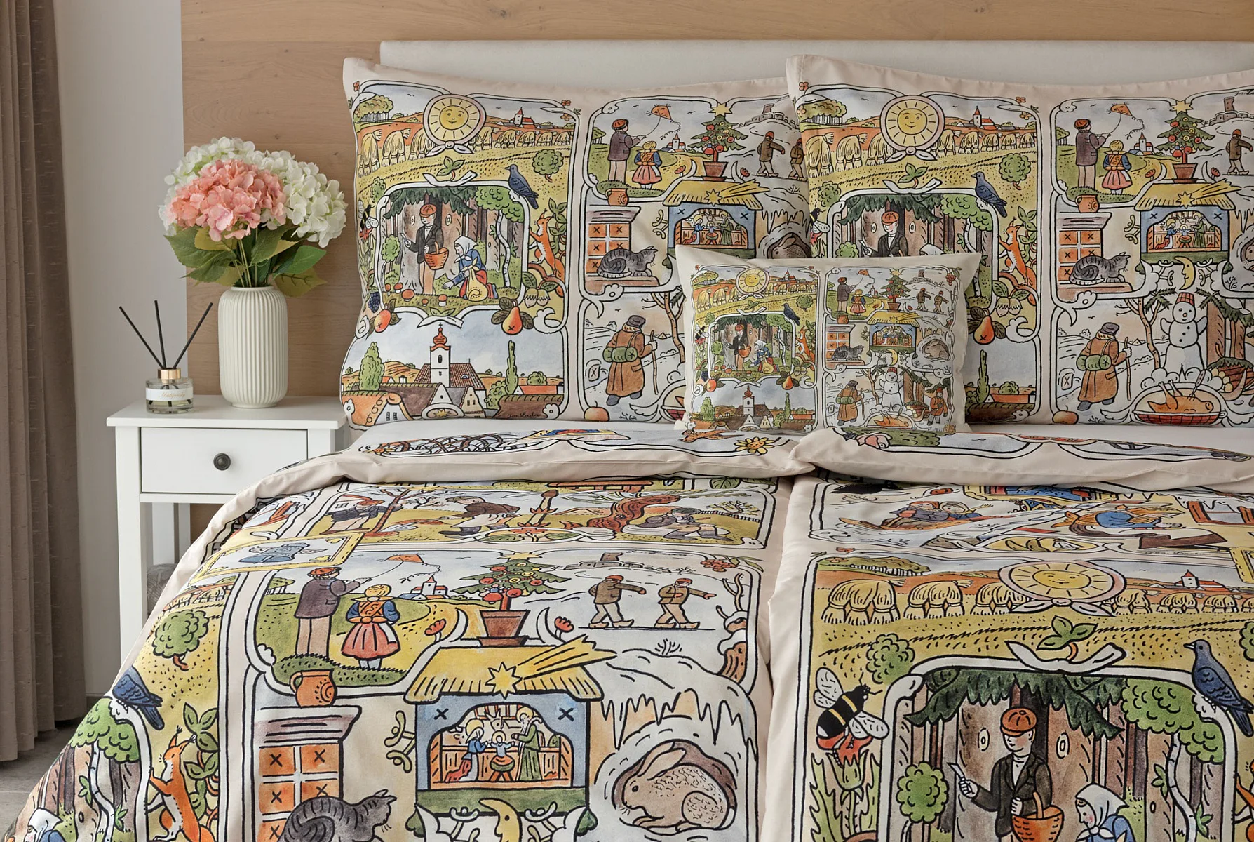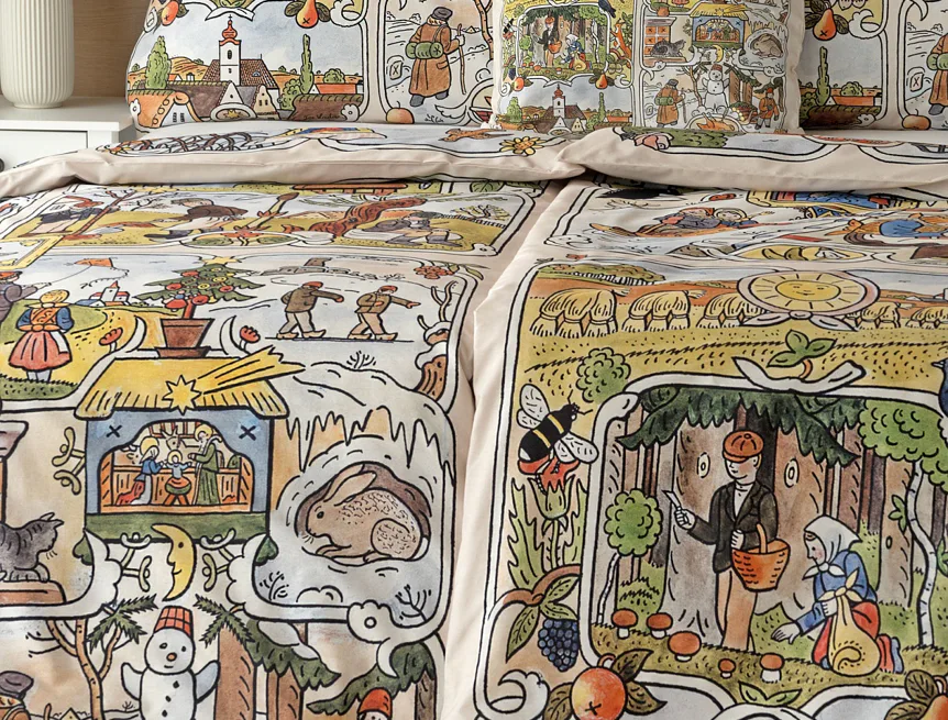 Půvabné kresby Josefa Lady v mnohých z nás probouzejí vzpomínky na bezstarostné dětství. Mají schopnost připomenout vůni rozkvetlé třešně či plápolajícího ohýnku. Zasníme se při pomyšlení na zimy plné sněhu. Vykouzlete si takovou kouzelnou atmosféru i u sebe doma díky bavlněnému povlečení Čtyři roční období. Díky příjemné paletě přírodních tónů a nestárnoucím tradičním motivům bude povlečení ozdobou každé ložnice.