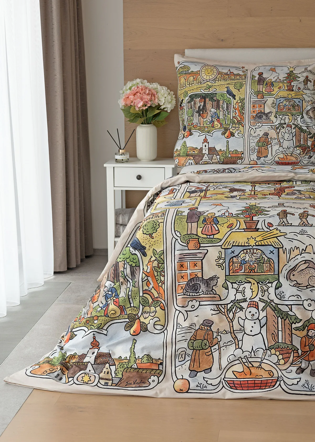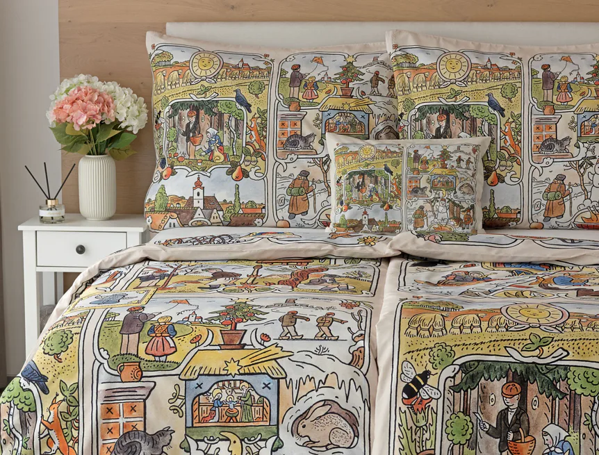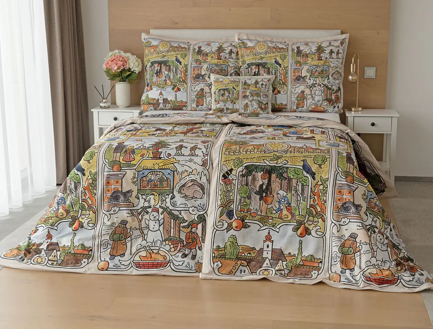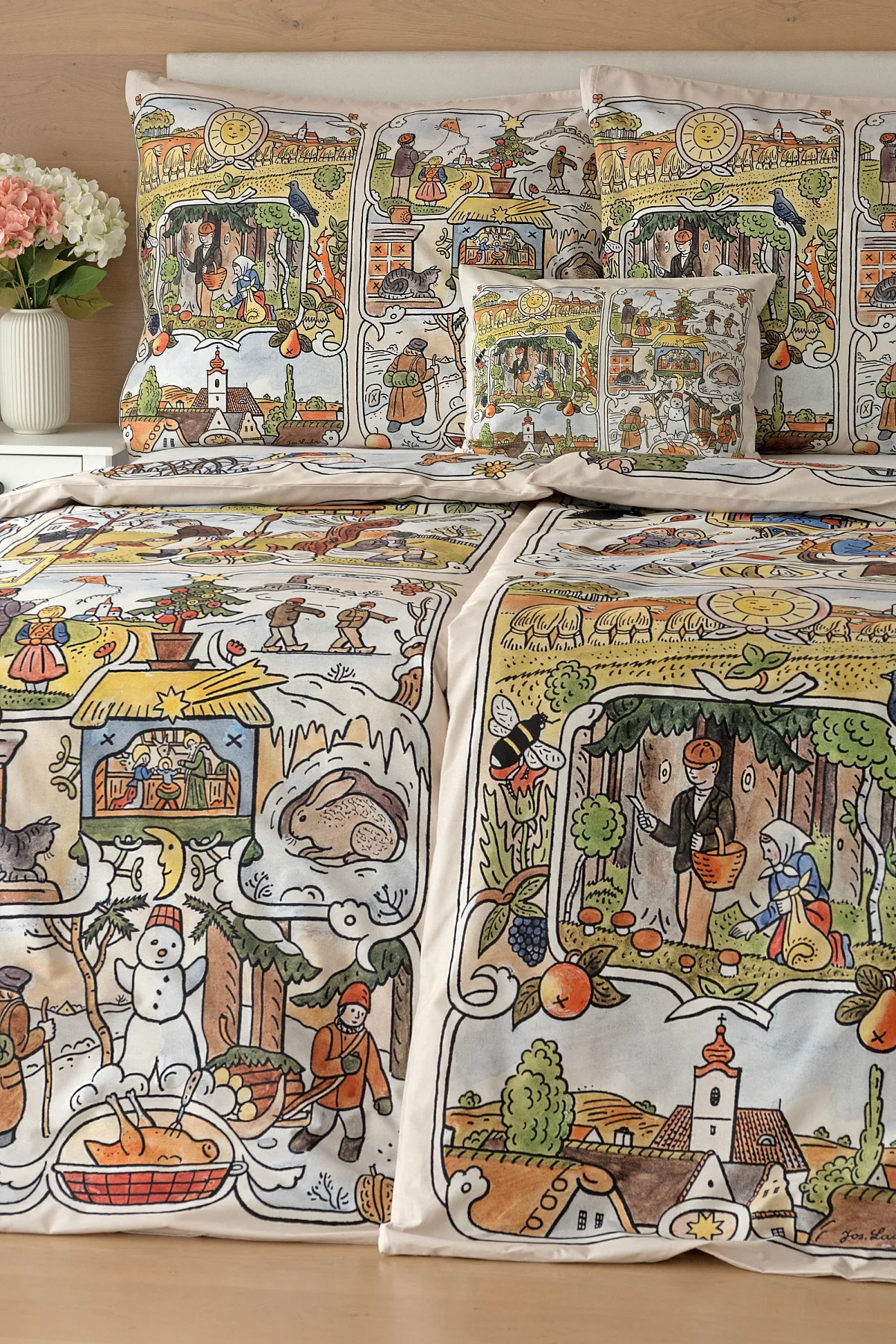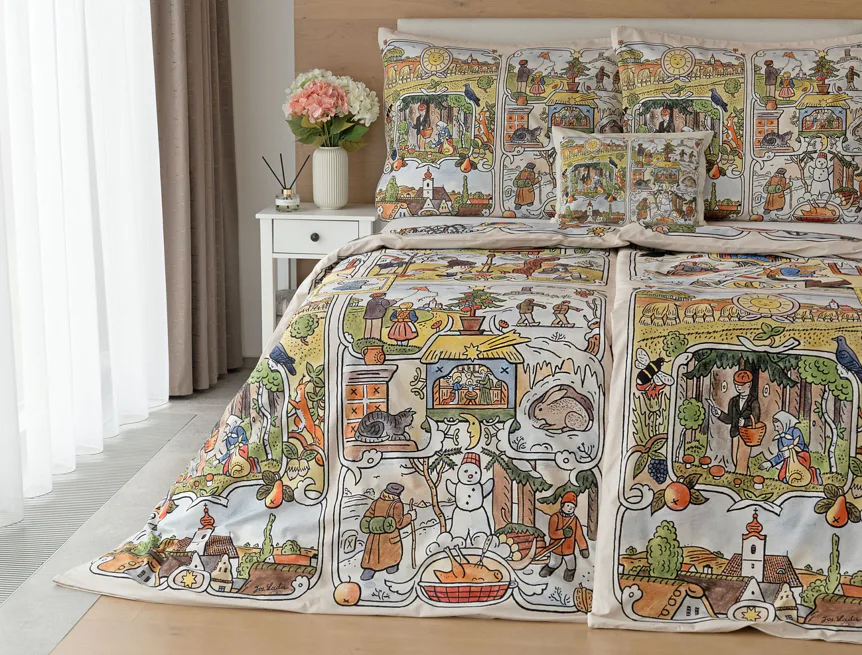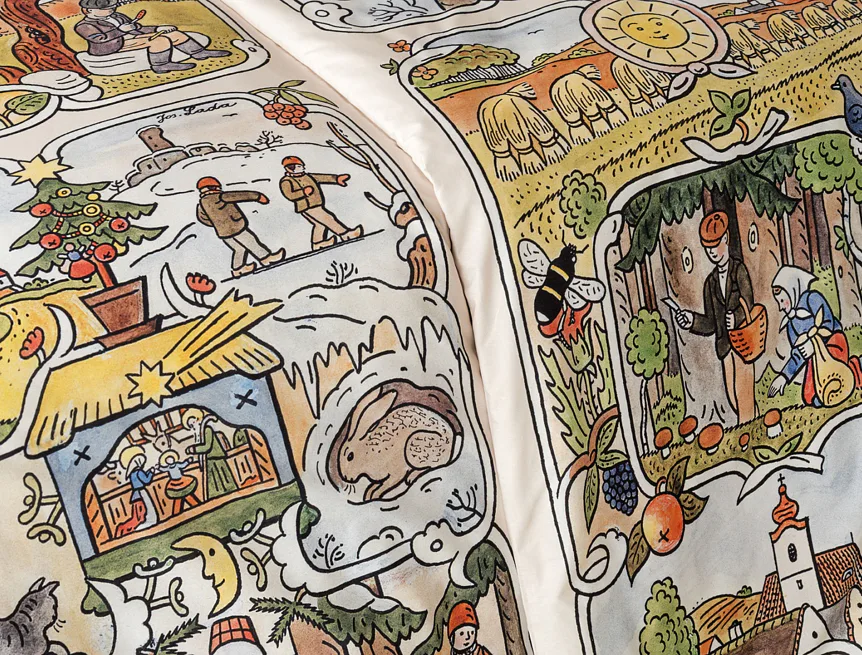 Půvabné kresby Josefa Lady v mnohých z nás probouzejí vzpomínky na bezstarostné dětství. Mají schopnost připomenout vůni rozkvetlé třešně či plápolajícího ohýnku. Zasníme se při pomyšlení na zimy plné sněhu. Vykouzlete si takovou kouzelnou atmosféru i u sebe doma díky bavlněnému povlečení Čtyři roční období. Díky příjemné paletě přírodních tónů a nestárnoucím tradičním motivům bude povlečení ozdobou každé ložnice.