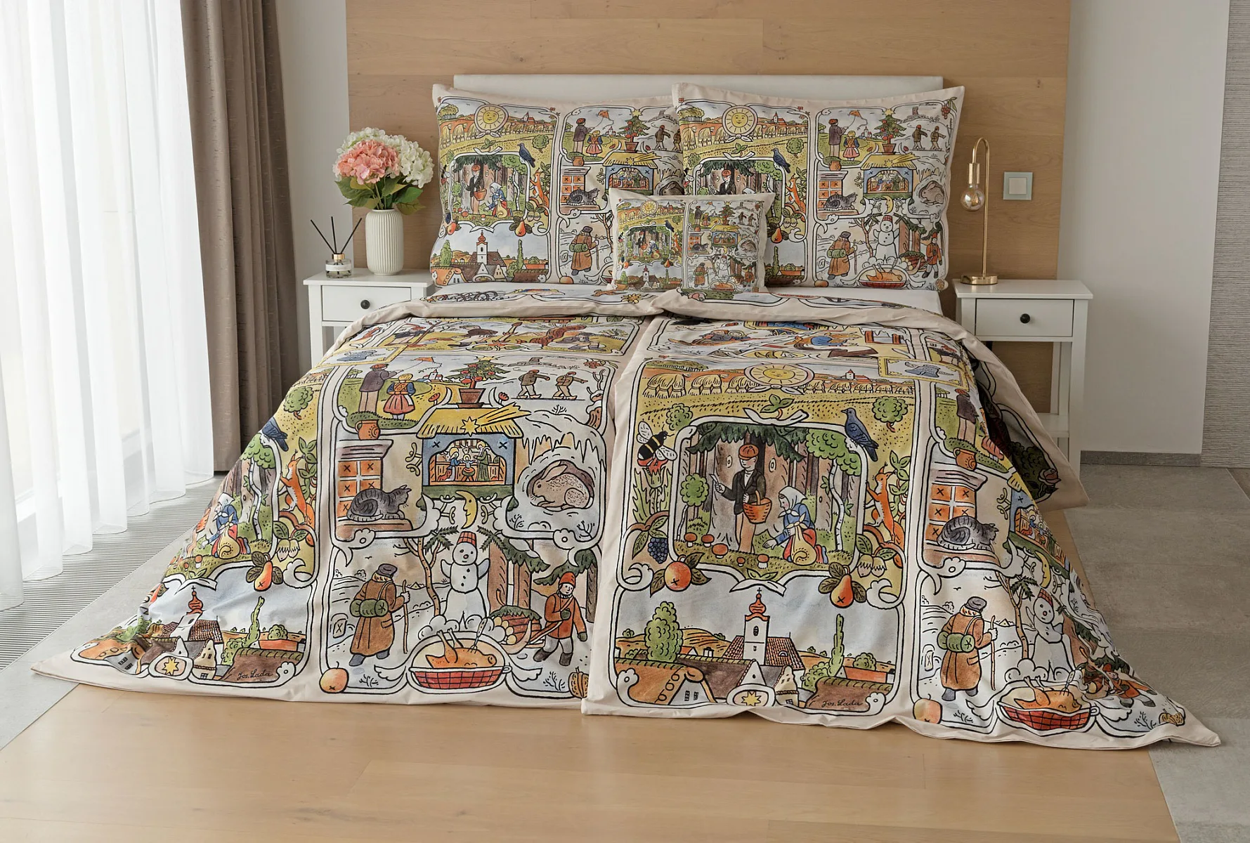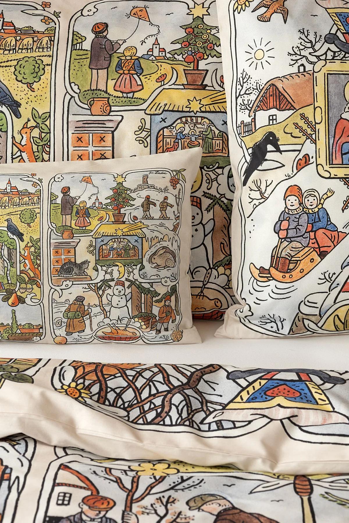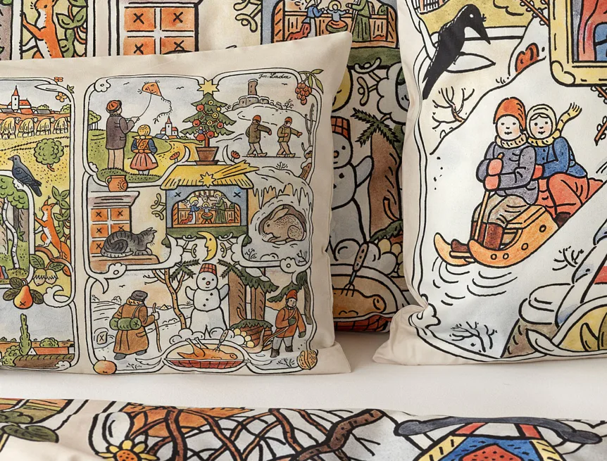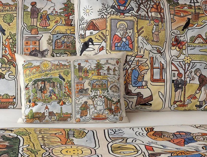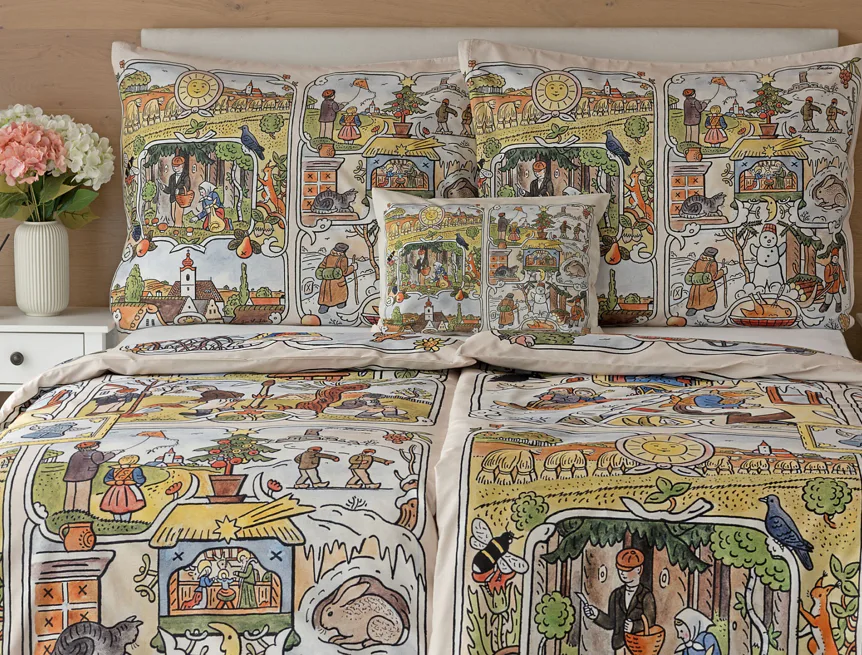 Půvabné kresby Josefa Lady v mnohých z nás probouzejí vzpomínky na bezstarostné dětství. Mají schopnost připomenout vůni rozkvetlé třešně či plápolajícího ohýnku. Zasníme se při pomyšlení na zimy plné sněhu. Vykouzlete si takovou kouzelnou atmosféru i u sebe doma díky bavlněnému povlečení Čtyři roční období. Díky příjemné paletě přírodních tónů a nestárnoucím tradičním motivům bude povlečení ozdobou každé ložnice.