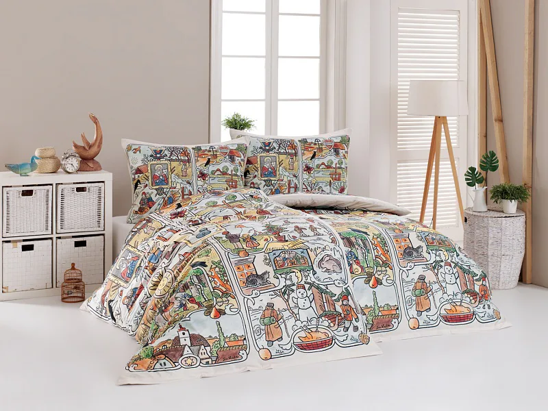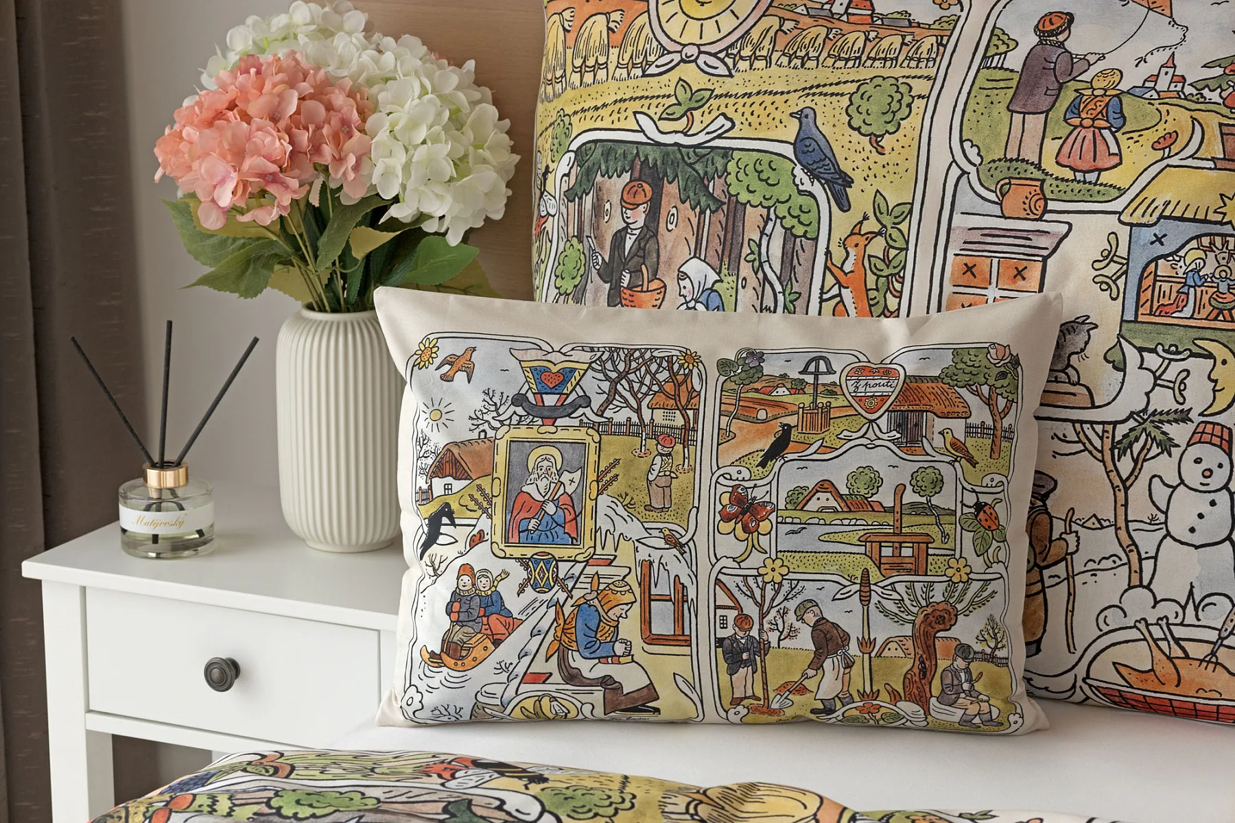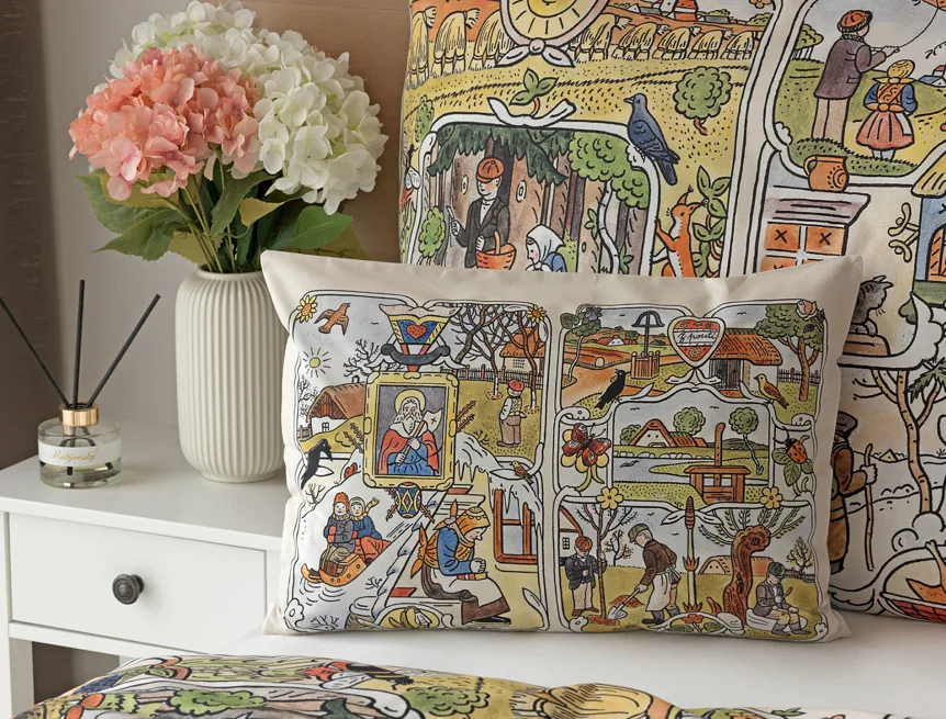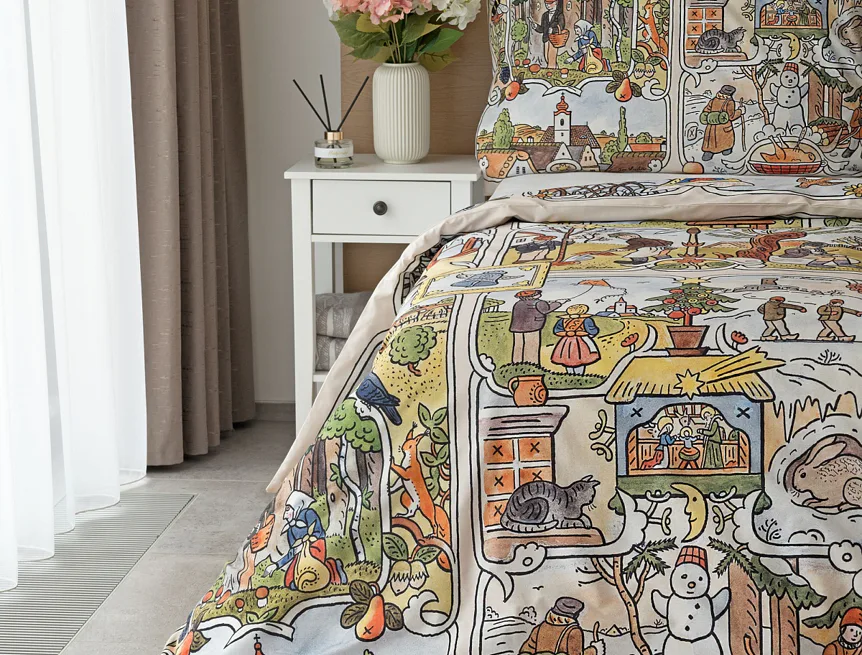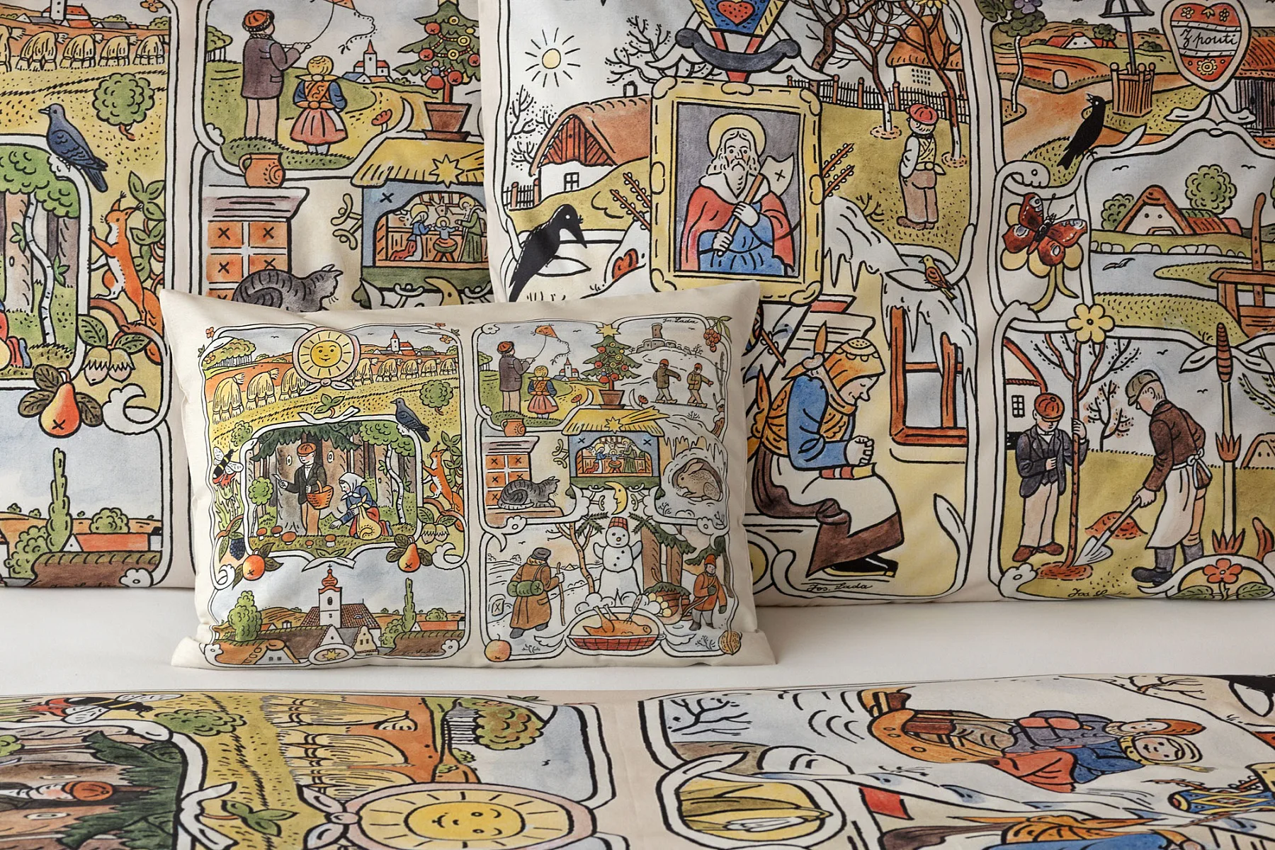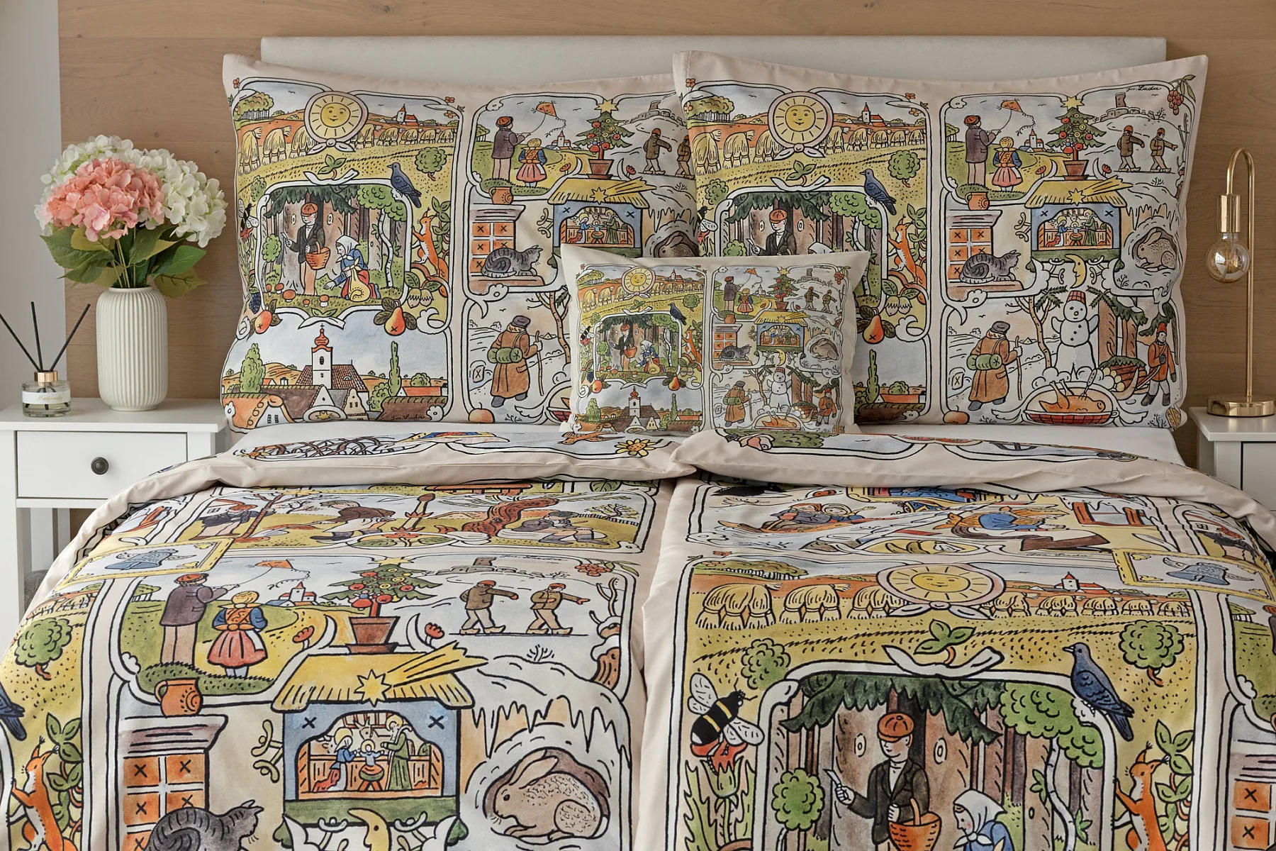 Půvabné kresby Josefa Lady v mnohých z nás probouzejí vzpomínky na bezstarostné dětství. Mají schopnost připomenout vůni rozkvetlé třešně či plápolajícího ohýnku. Zasníme se při pomyšlení na zimy plné sněhu. Vykouzlete si takovou kouzelnou atmosféru i u sebe doma díky bavlněnému povlečení Čtyři roční období. Díky příjemné paletě přírodních tónů a nestárnoucím tradičním motivům bude povlečení ozdobou každé ložnice.