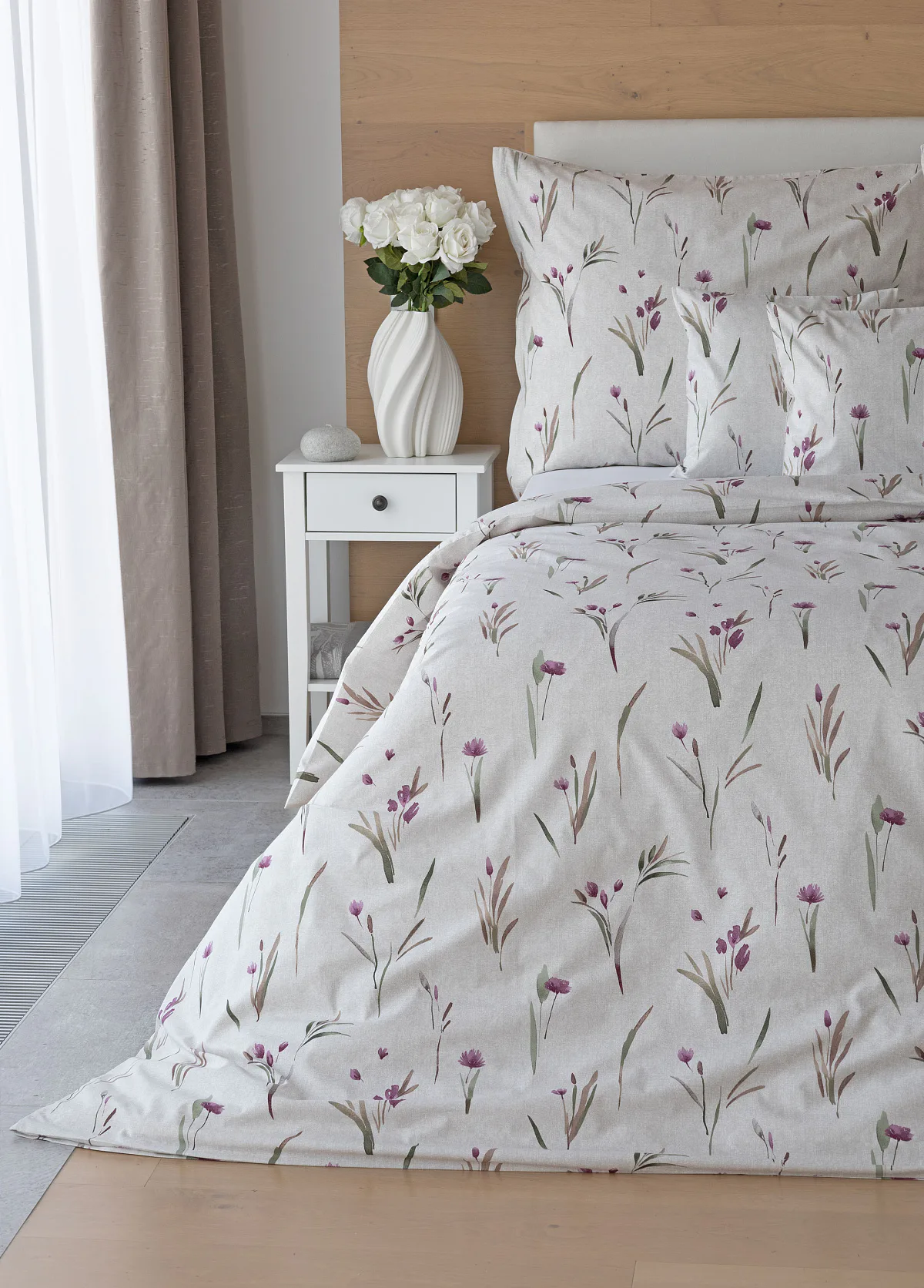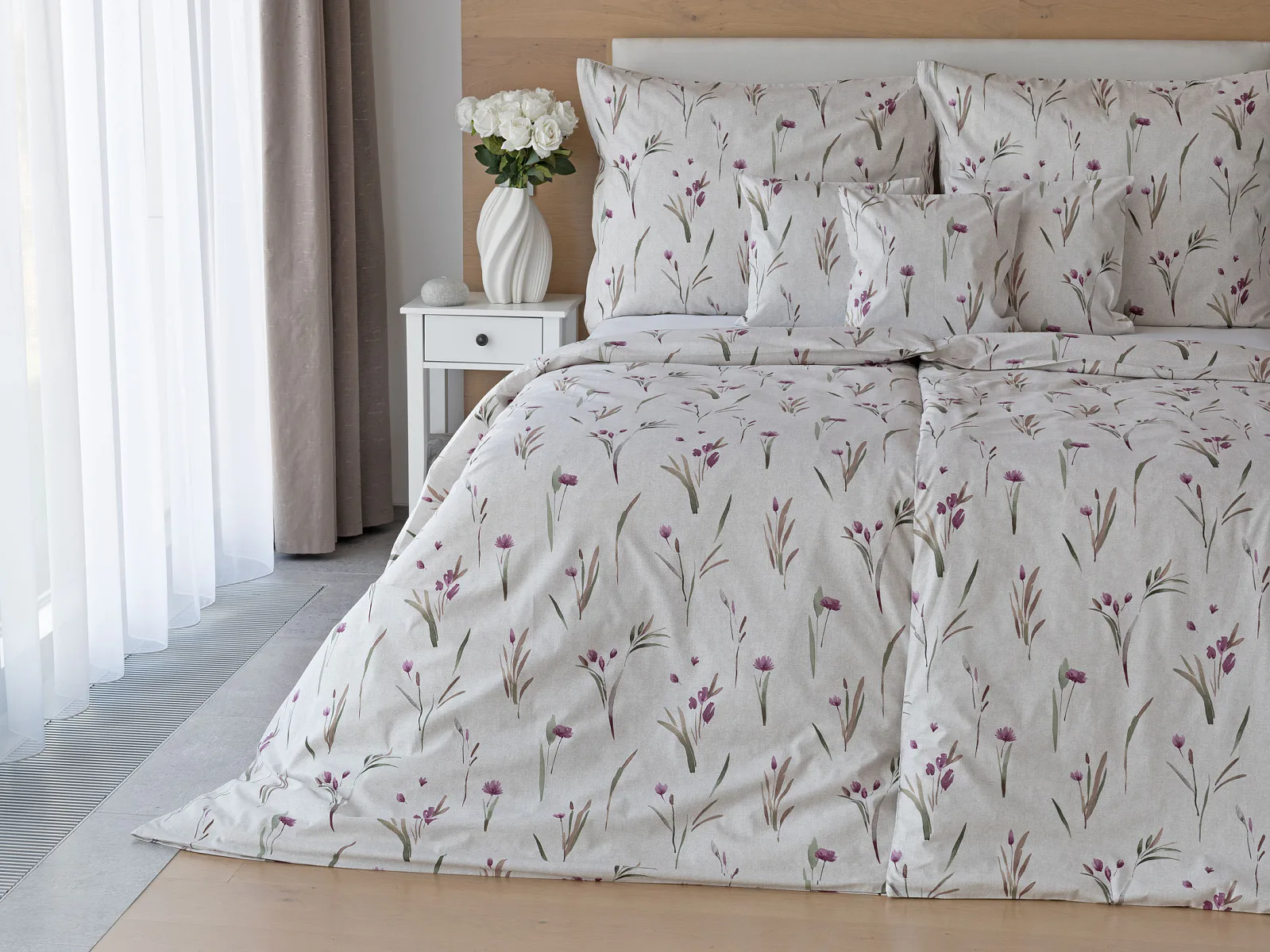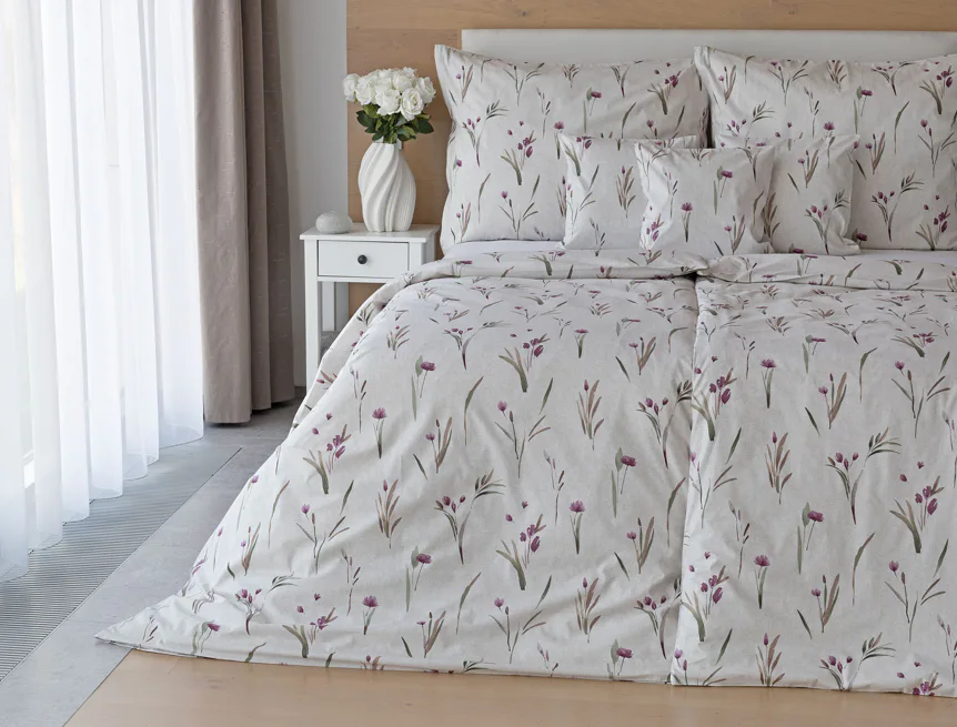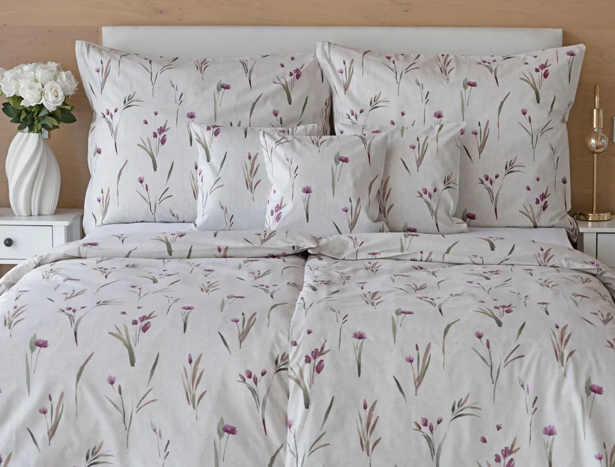 Decentní květinové povlečení Danae vdechne vaší ložnici elegantní nádech v každé roční době. Minimalistický akvarelový motiv květů a poupat v tlumených fialových a zelených tónech vyniká na šedobéžovém podkladu se strukturou jemného melíru.