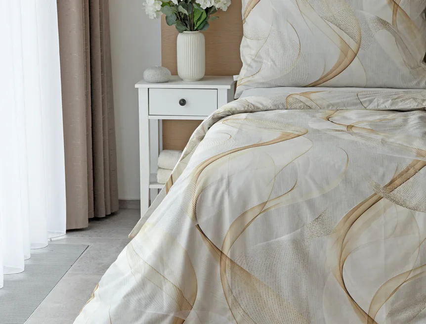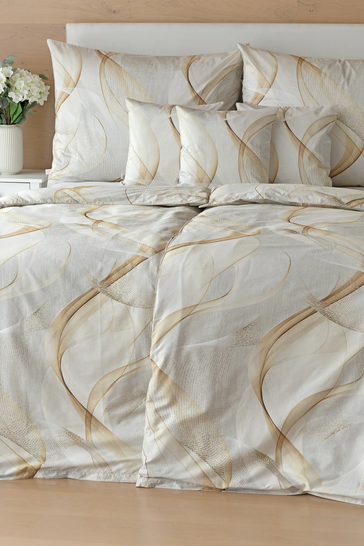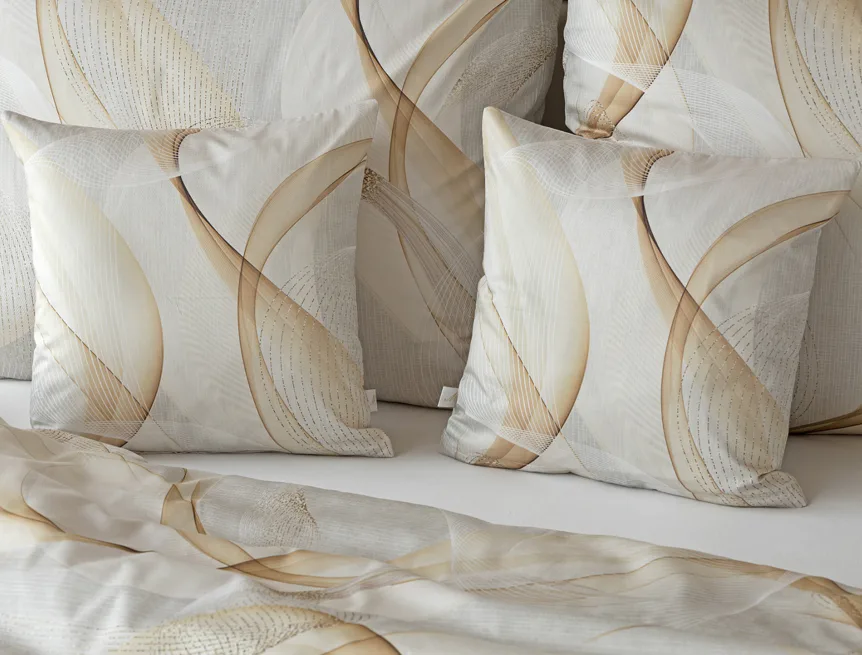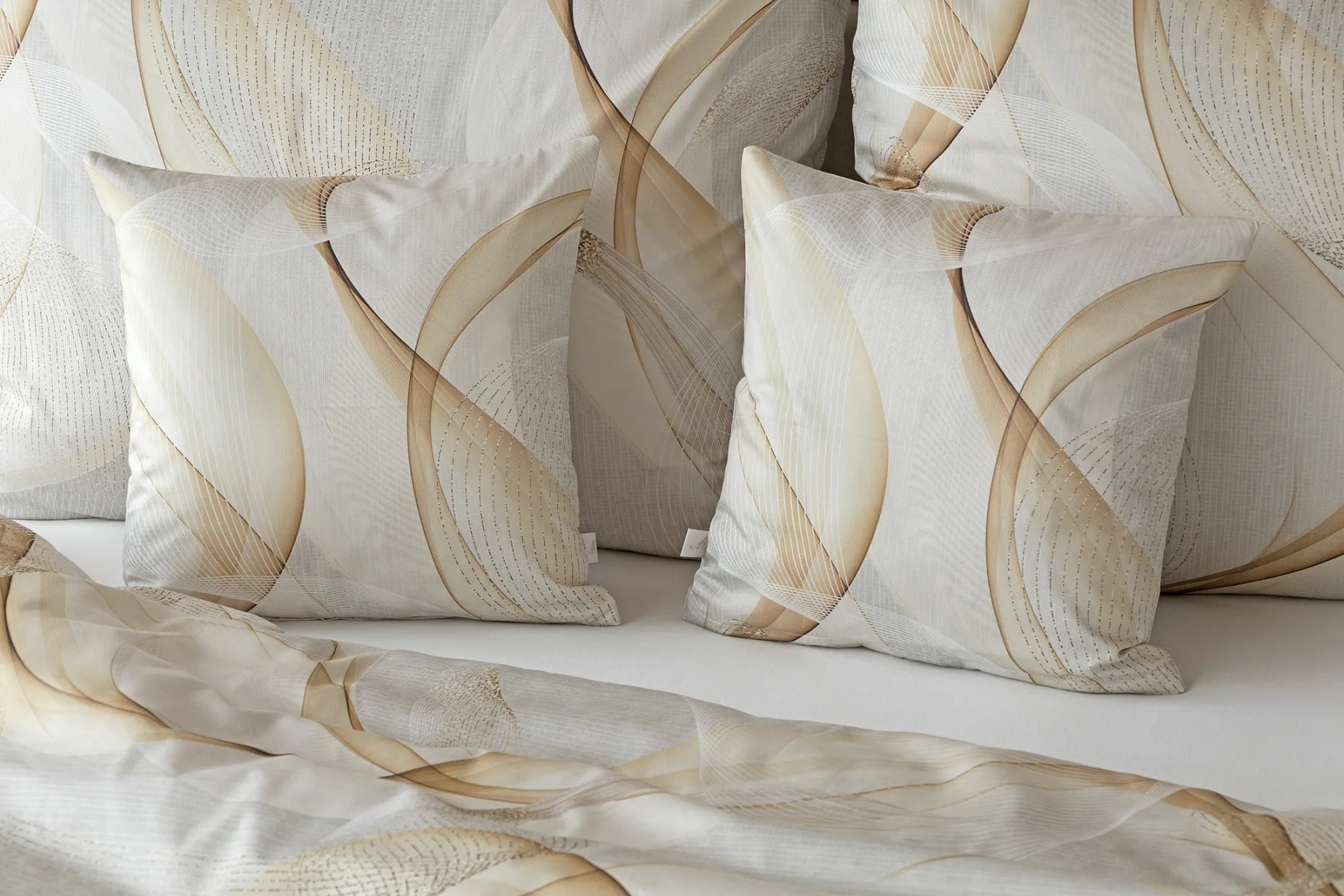 Povlečení Delight zdobí jemný geometrický vzor v podobě bílých a zlatavých nepravidelných vlnek na světle šedém podkladu. Povlak na polštář i na přikrývku je z obou stran stejný, povlečení je opatřeno komfortním zipovým uzávěrem.
