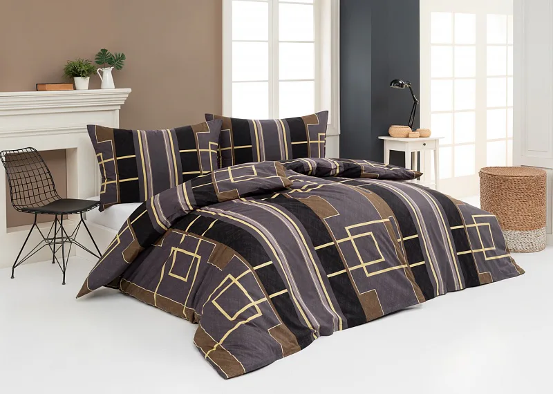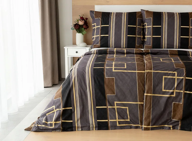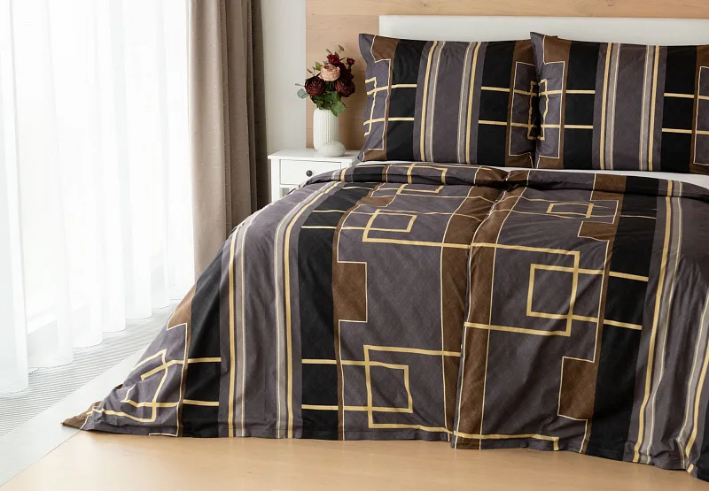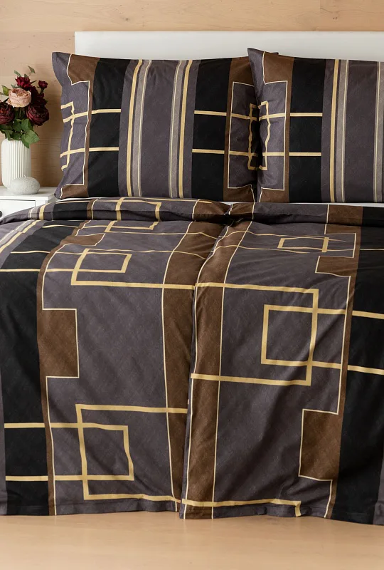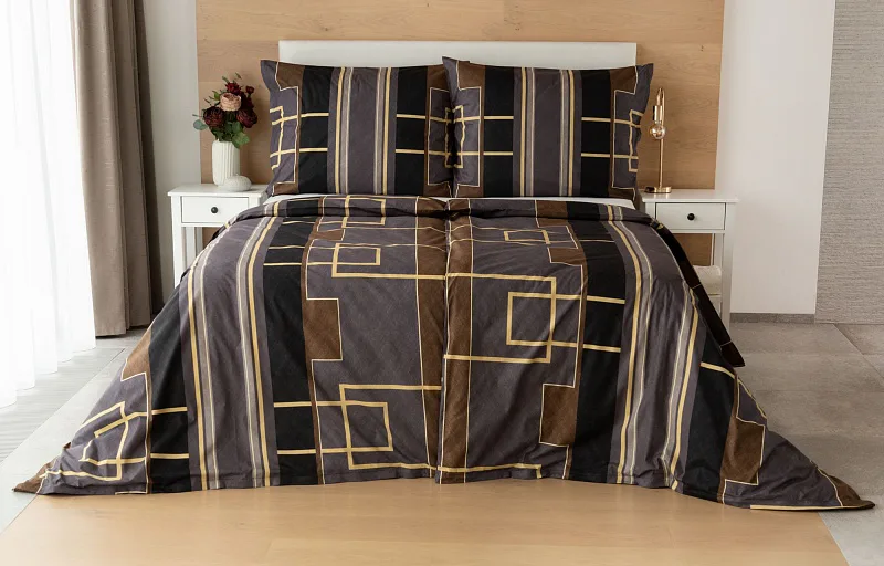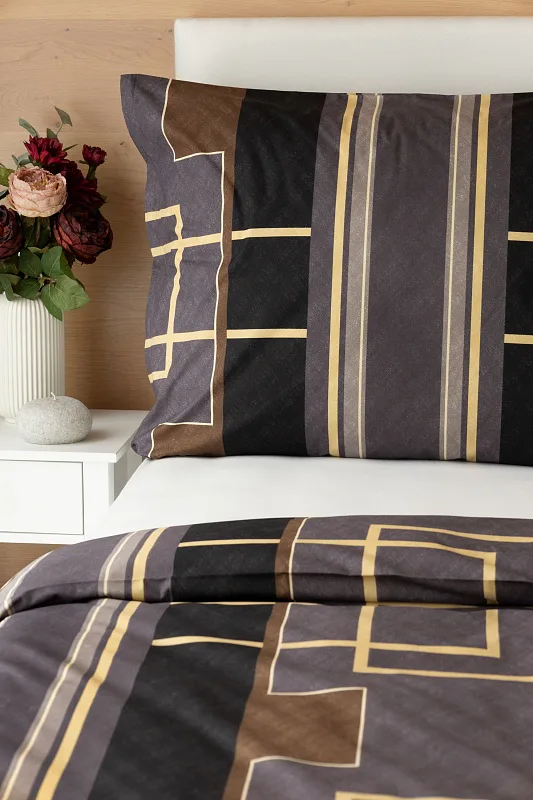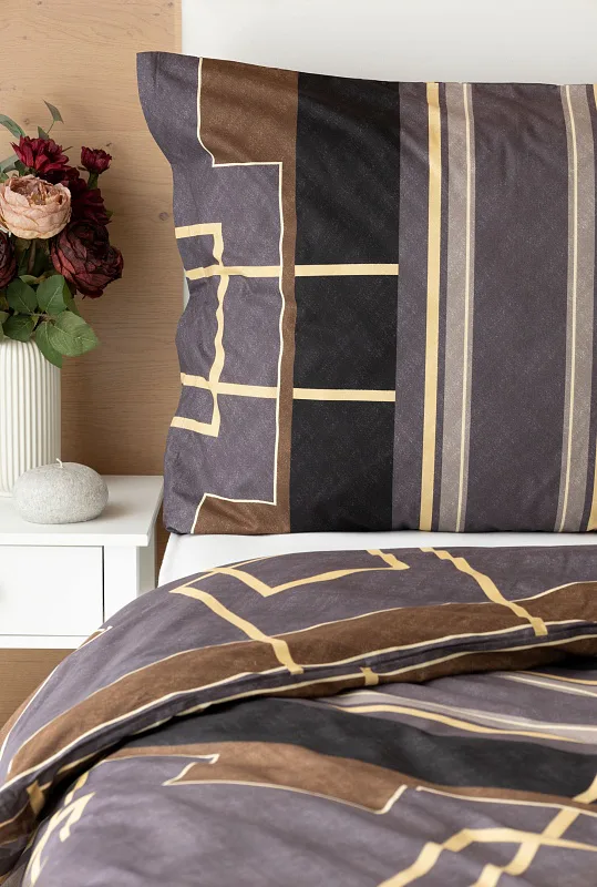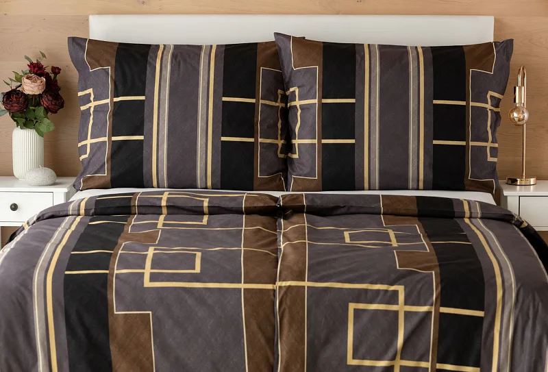 Nechte svou ložnici zazářit nevídanou elegancí s bavlněným ložním povlečením Denver. Abstraktní geometrický vzor vyniká v dokonalé souhře hnědých, šedých a antracitových tónů protnutých zlatavou linkou.