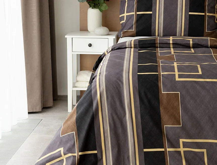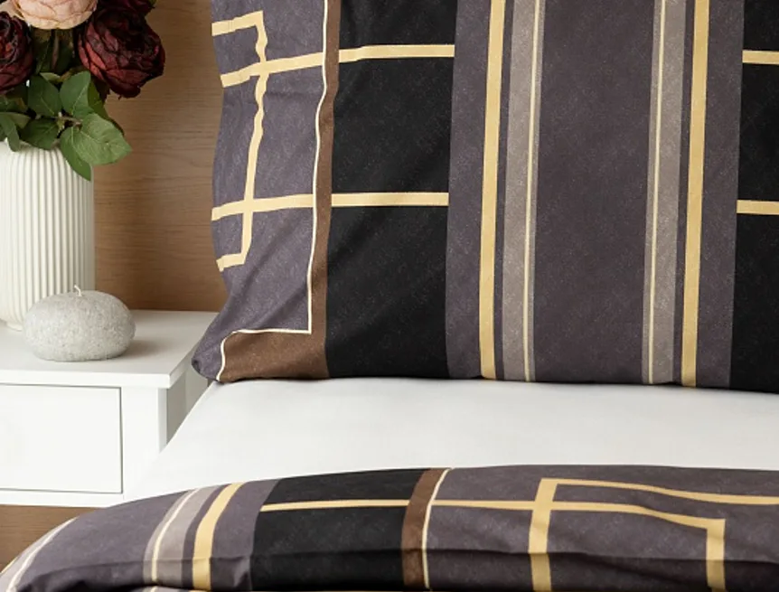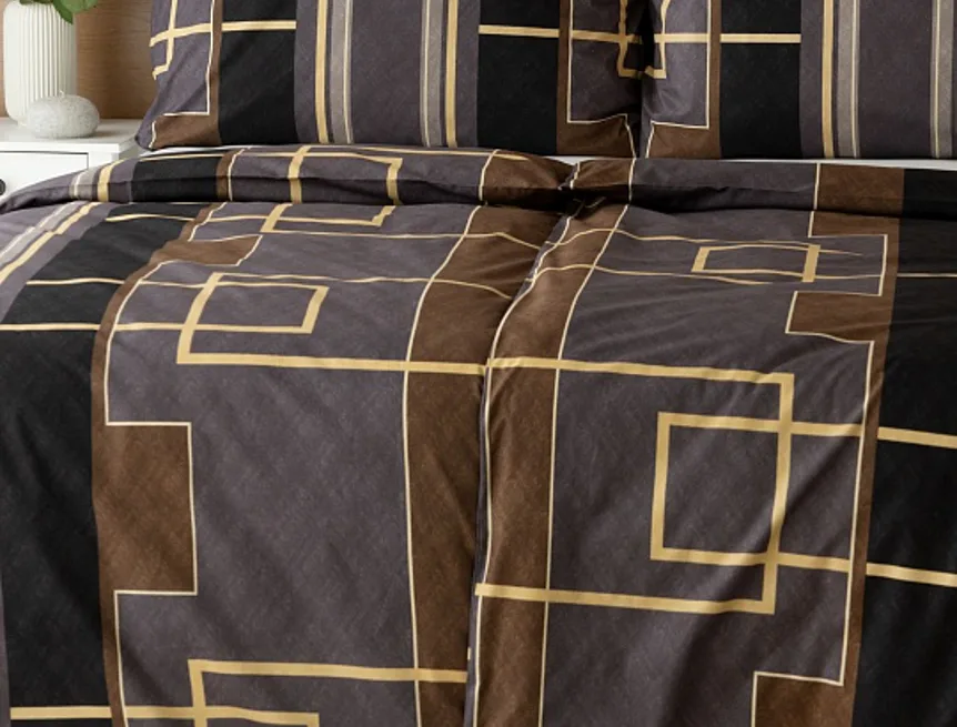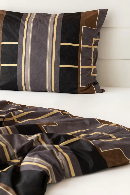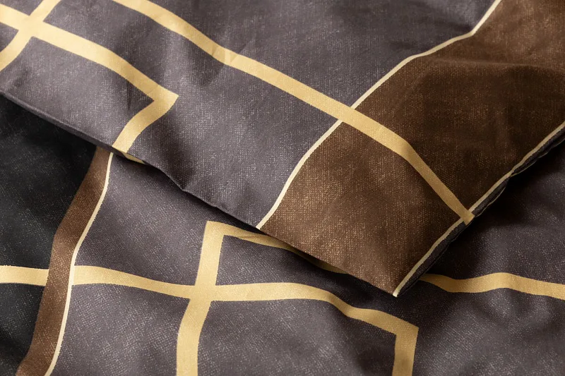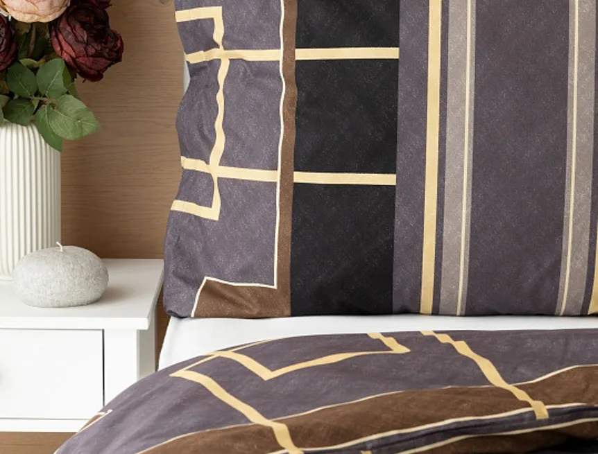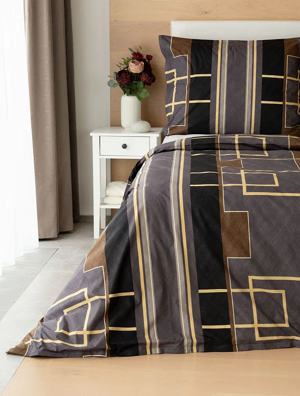 Nechte svou ložnici zazářit nevídanou elegancí s bavlněným ložním povlečením Denver. Abstraktní geometrický vzor vyniká v dokonalé souhře hnědých, šedých a antracitových tónů protnutých zlatavou linkou.