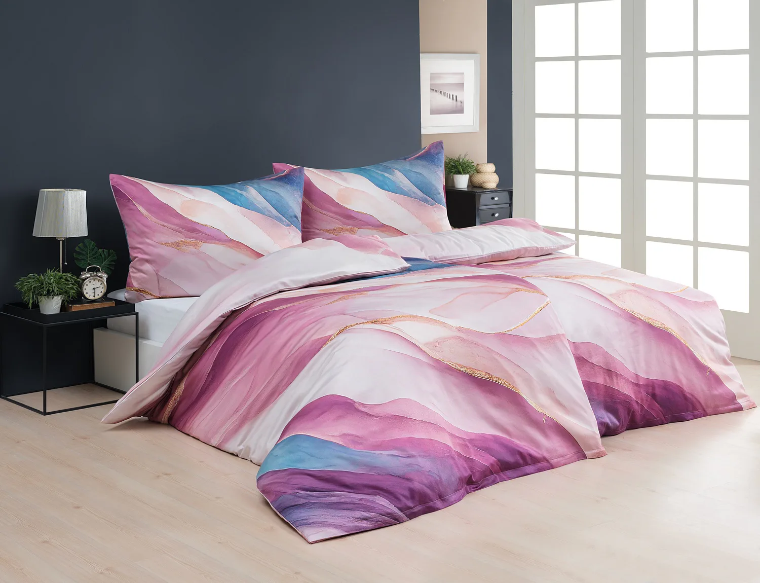 Saténové povlečení Dionna si vás získá na první pohled. Vychutnejte si dokonalé souznění pudrových, růžových, fialových a modrých tónů v tomto extravagantním vzoru. O váš pohodlný spánek se postará 100% prvotřídní bavlna v hebké atlasové vazbě.