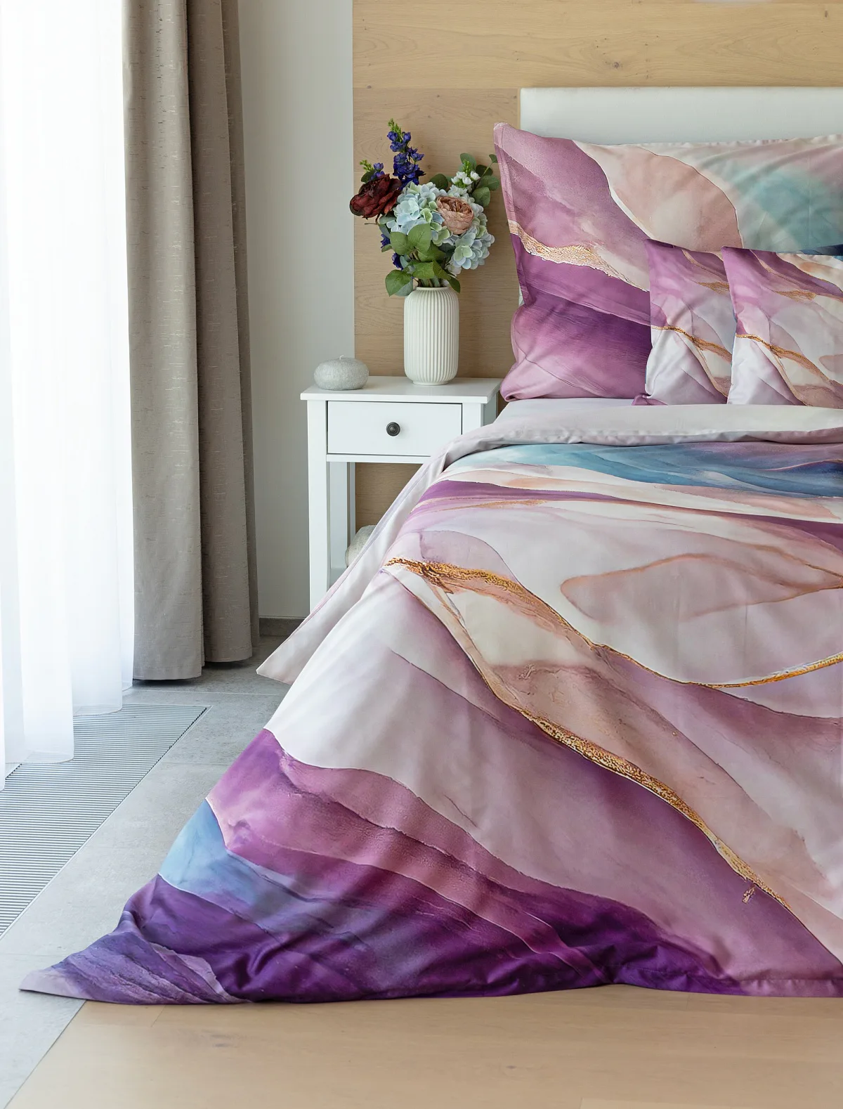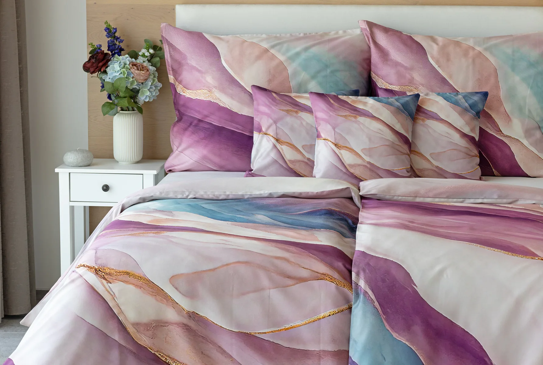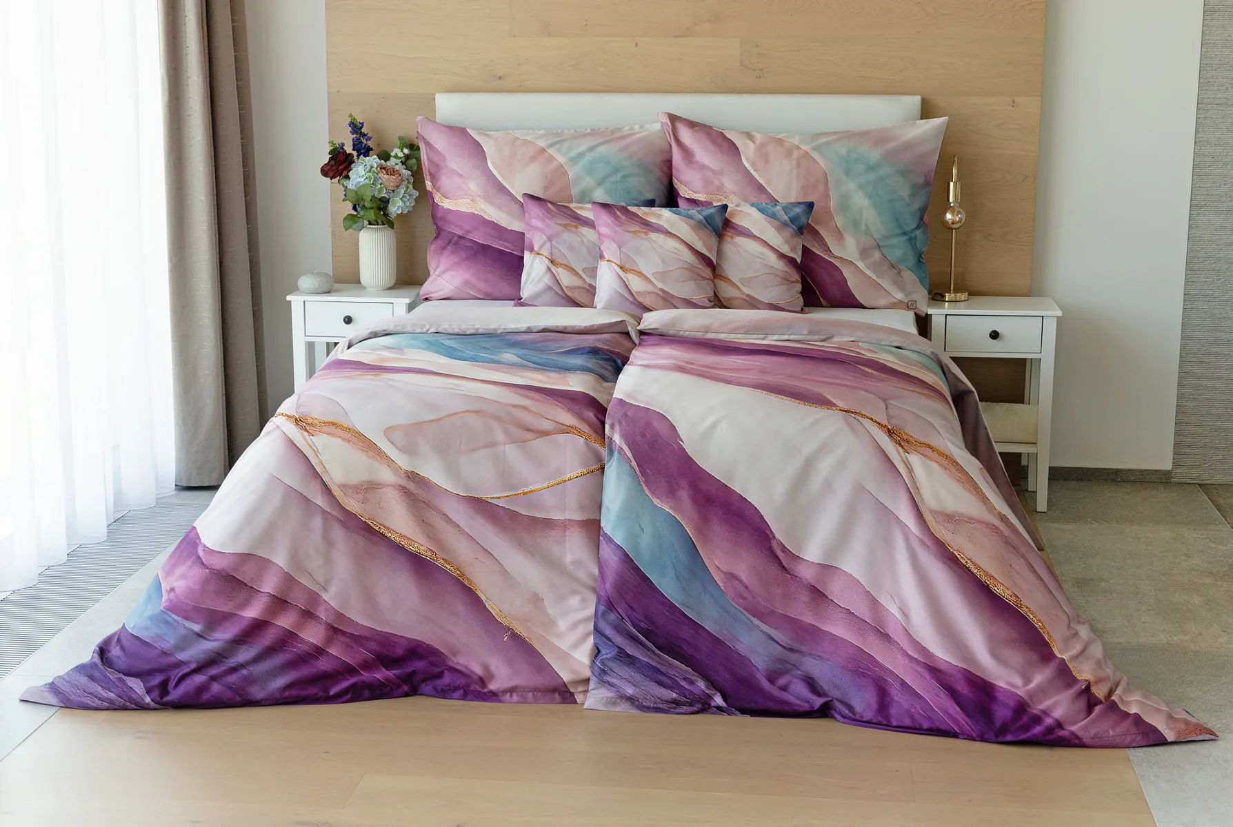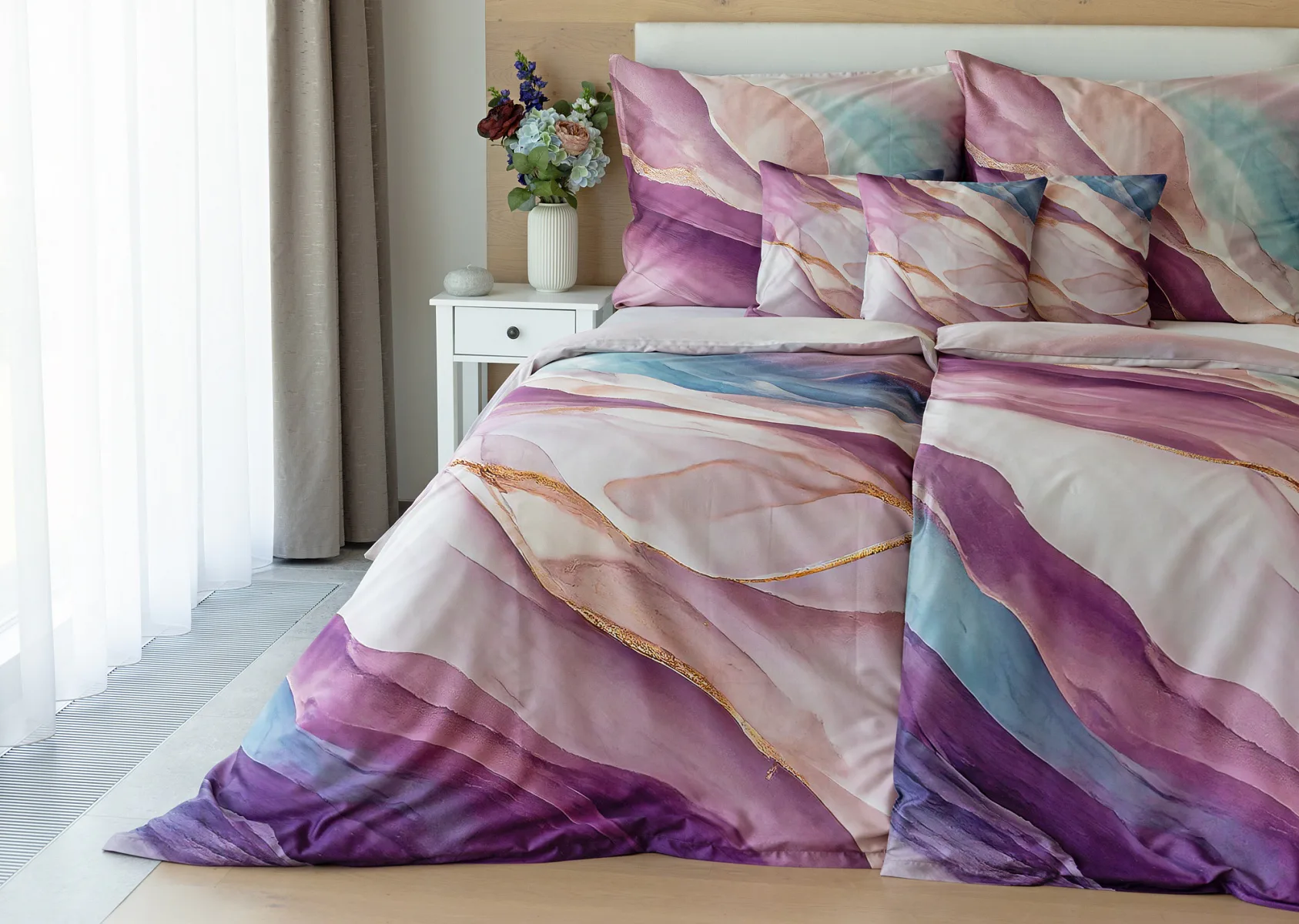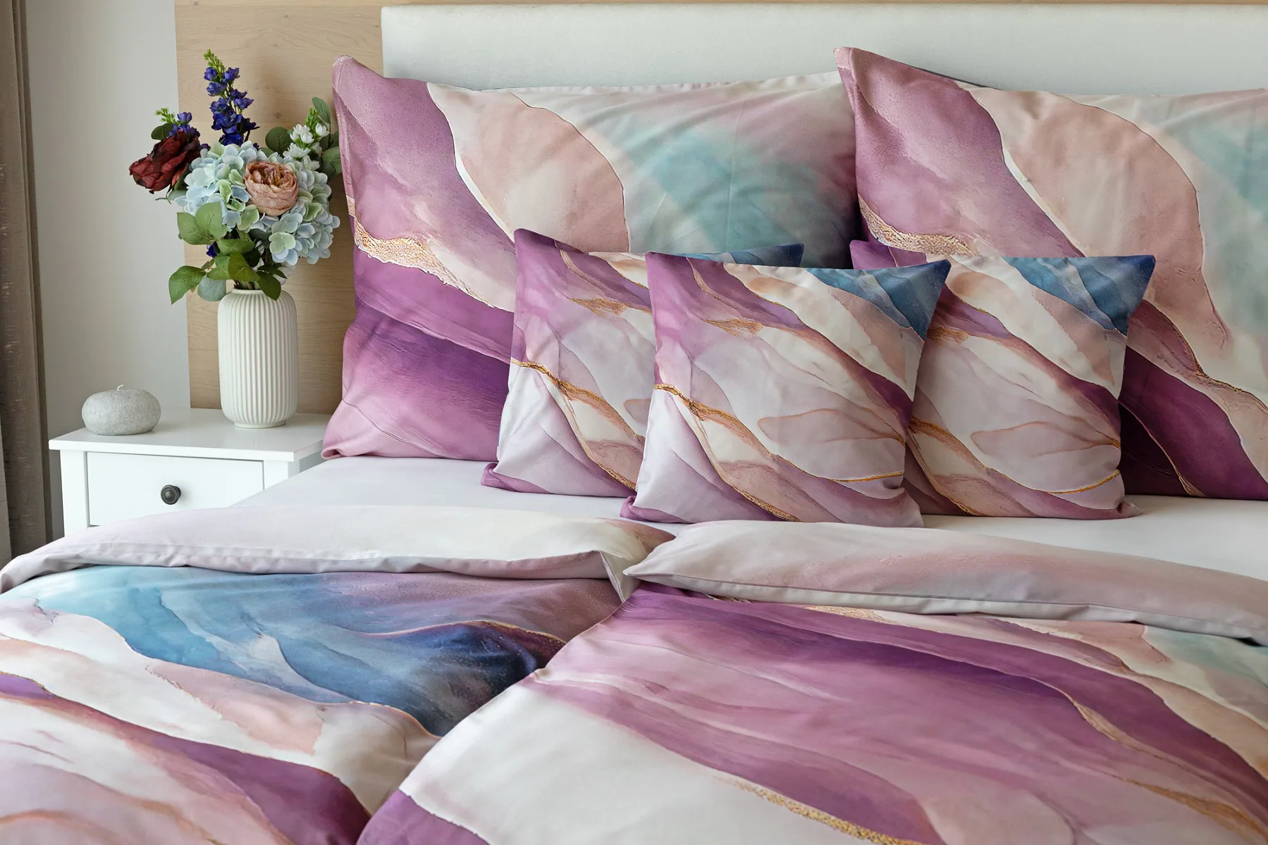Saténové povlečení Dionna si vás získá na první pohled. Vychutnejte si dokonalé souznění pudrových, růžových, fialových a modrých tónů v tomto extravagantním vzoru. O váš pohodlný spánek se postará...