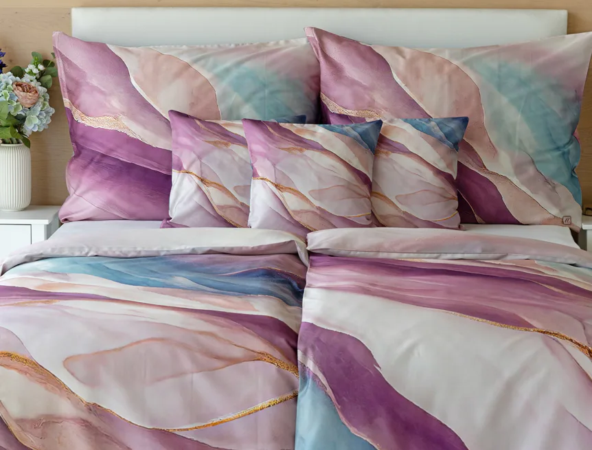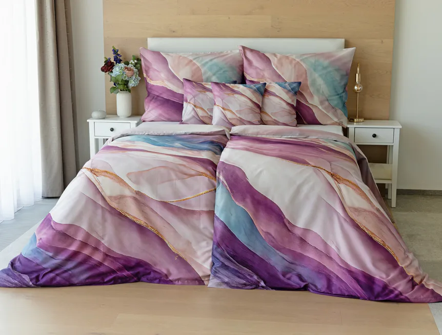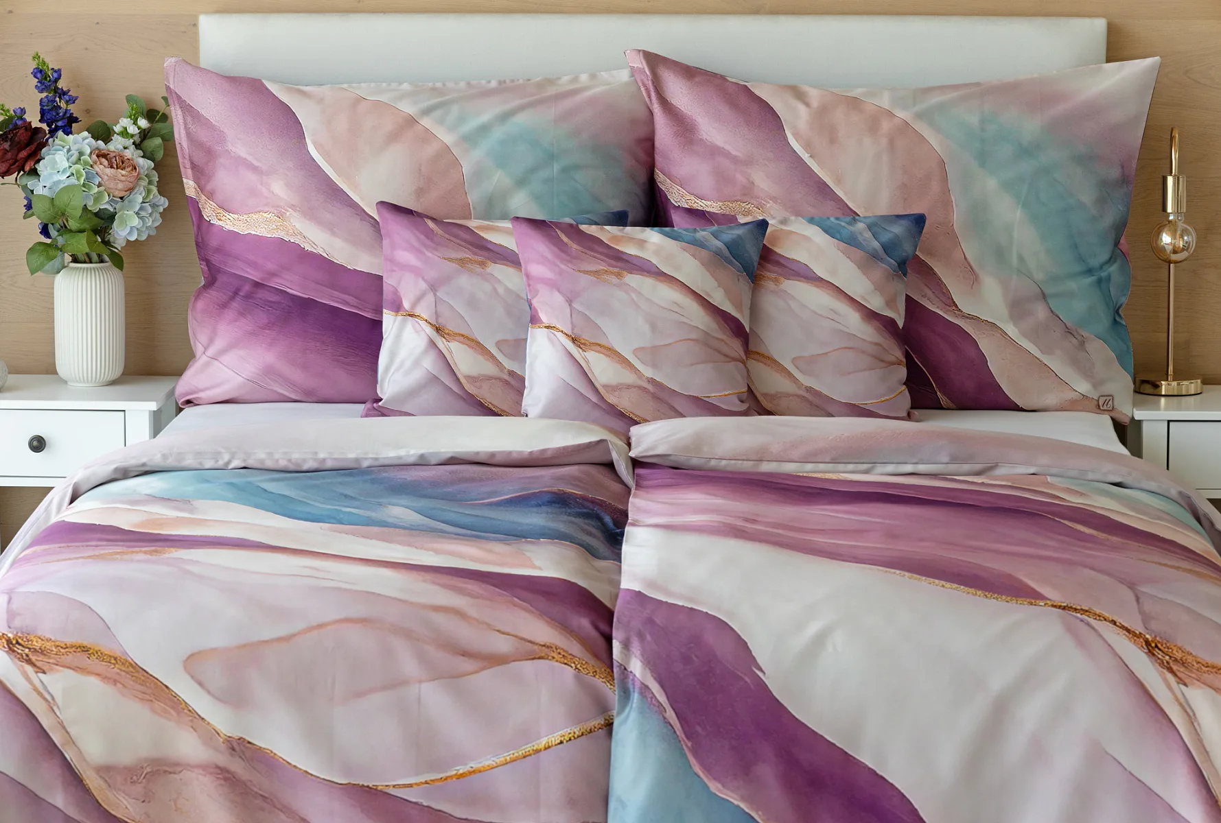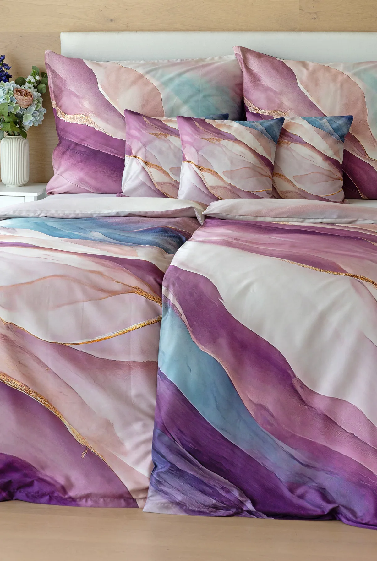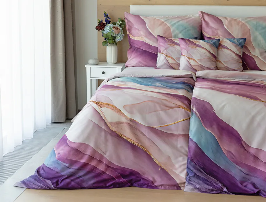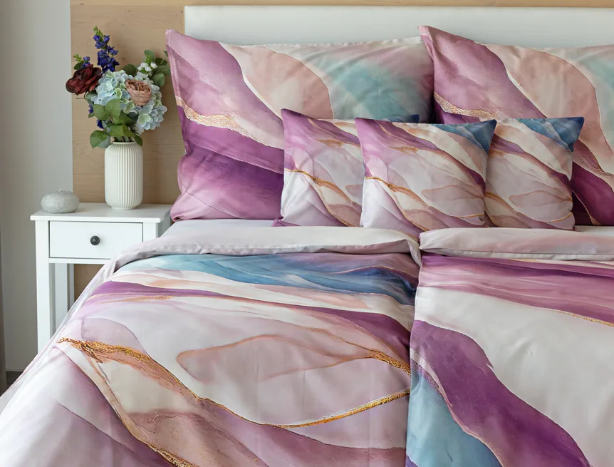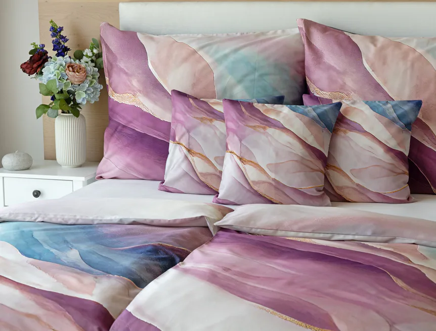 Saténové povlečení Dionna si vás získá na první pohled. Vychutnejte si dokonalé souznění pudrových, růžových, fialových a modrých tónů v tomto extravagantním vzoru. O váš pohodlný spánek se postará...